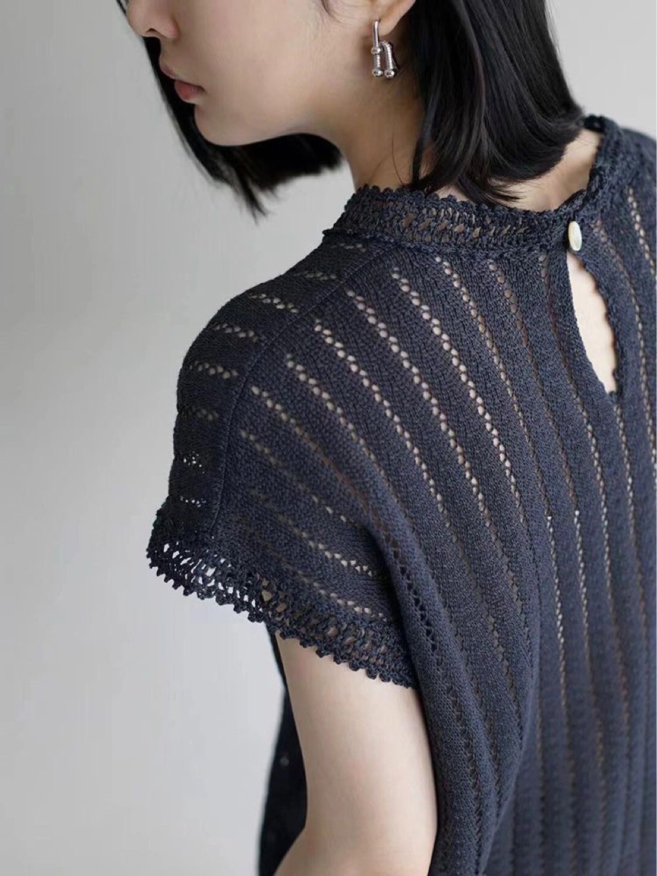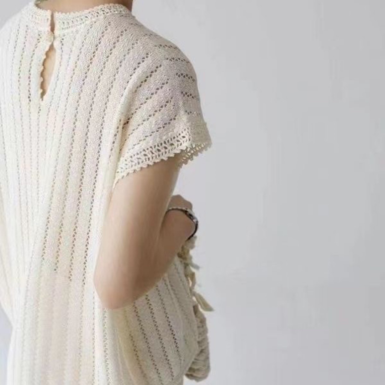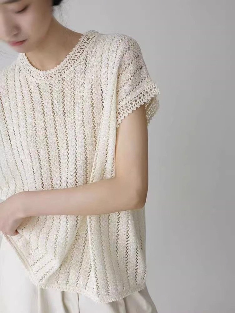 2025 여름 새 스타일 중공 얼음 실크 니트 반팔 티셔츠 여성용 느슨한 슬리밍 다목적 탑 서양식 연령 감소 얇은