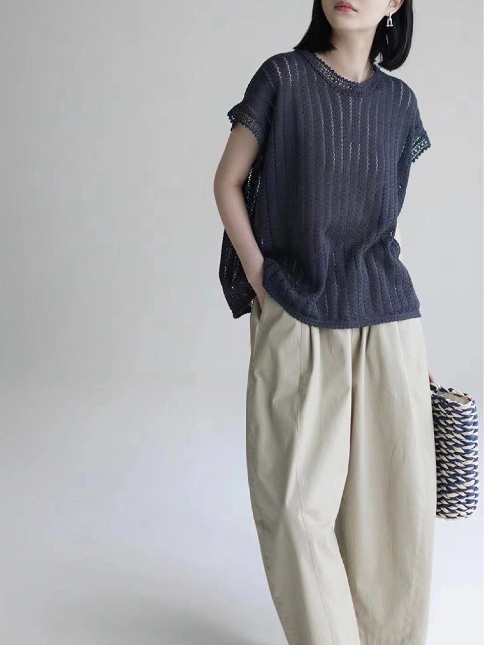 2025 여름 새 스타일 중공 얼음 실크 니트 반팔 티셔츠 여성용 느슨한 슬리밍 다목적 탑 서양식 연령 감소 얇은스토어 가기