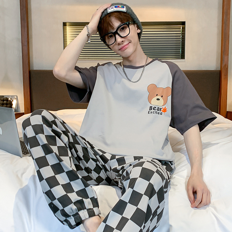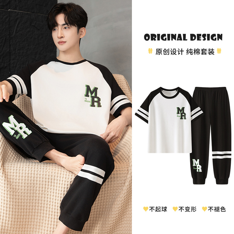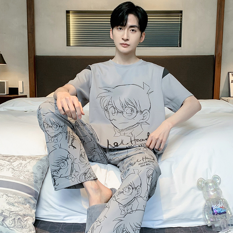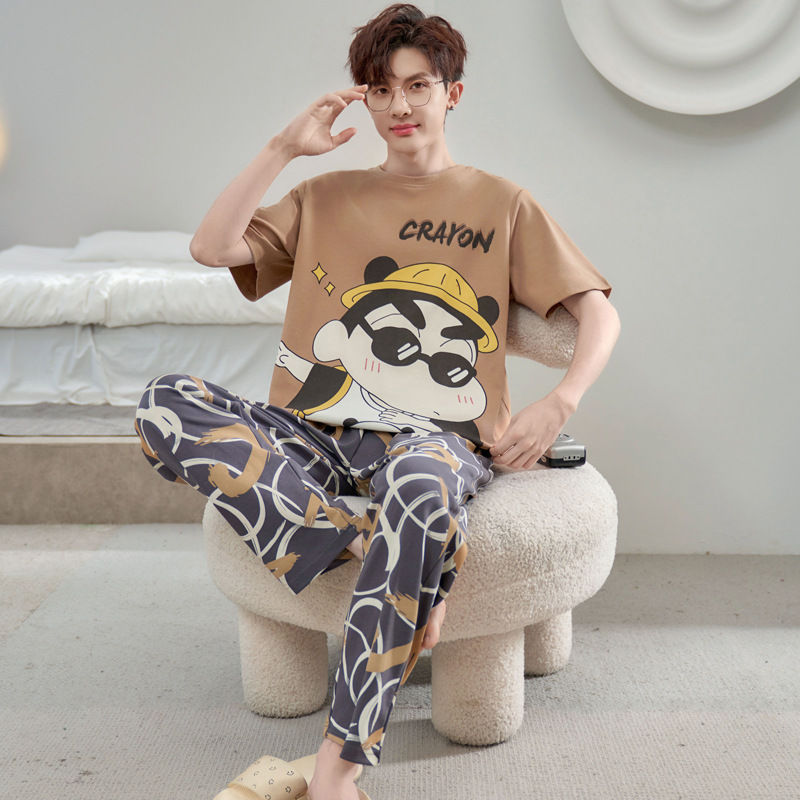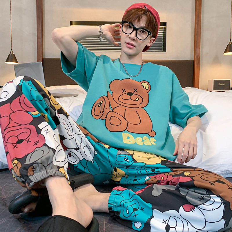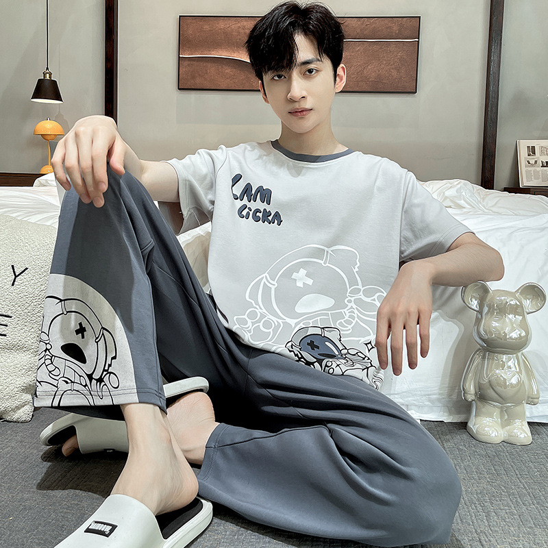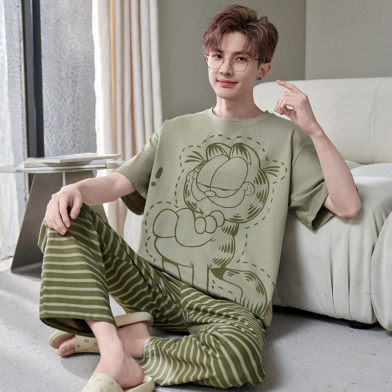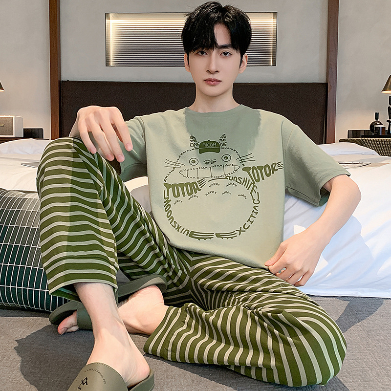 남성용 잠옷 2025 새로운 여름 순수 코튼 반팔 바지 얇은 가을 대형 만화 홈웨어 세트