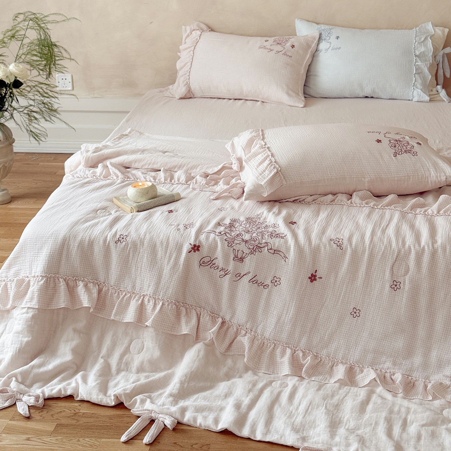 프렌치 코튼 더블 레이어 원사 한국식 4피스 순면 여름 시원한 이불 작은 신선한 레이스 자수 소녀 하트 침구