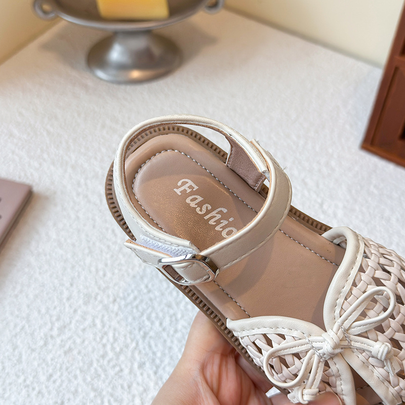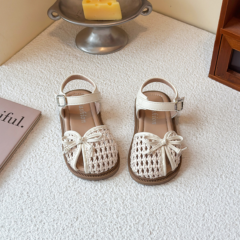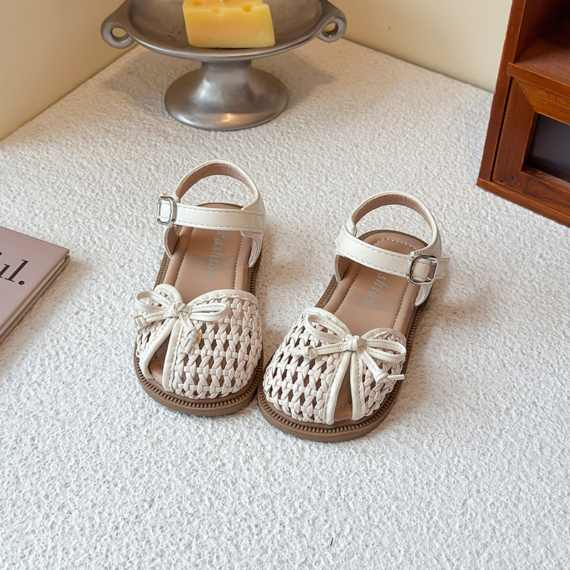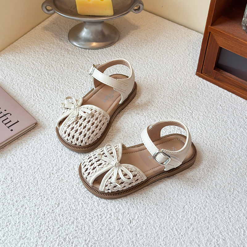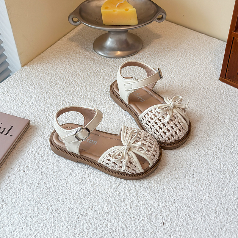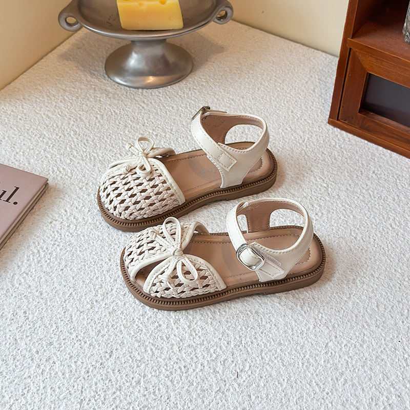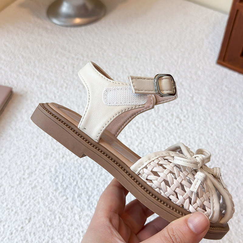 목가적 인 스타일 짠 아기 소녀 샌들 2025 여름 새 스타일 소녀 작은 공주 부드러운 바닥 어린이 여름 발가락 신발스토어 가기