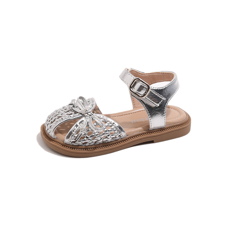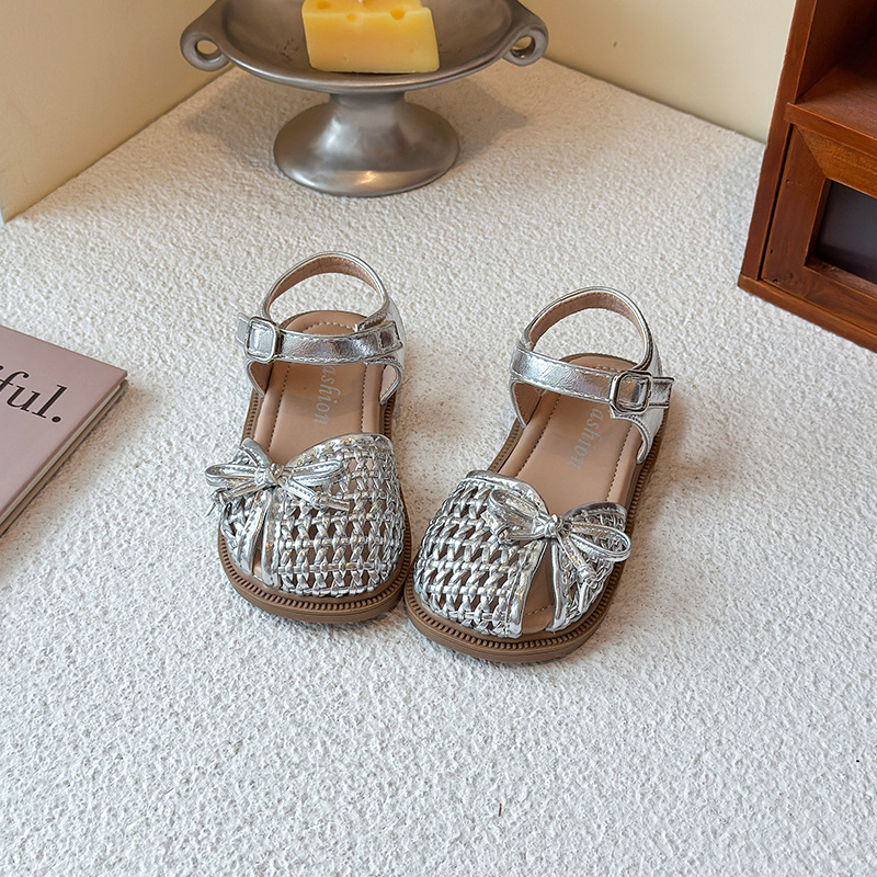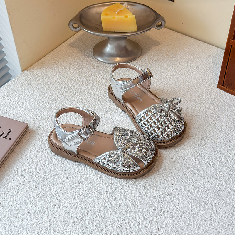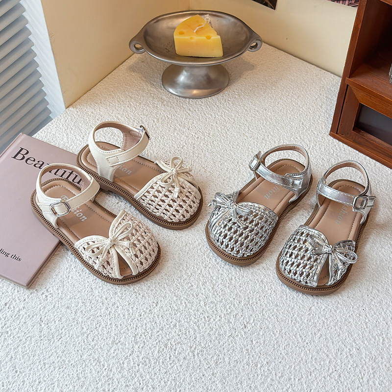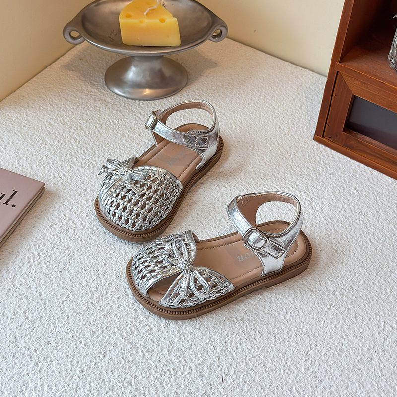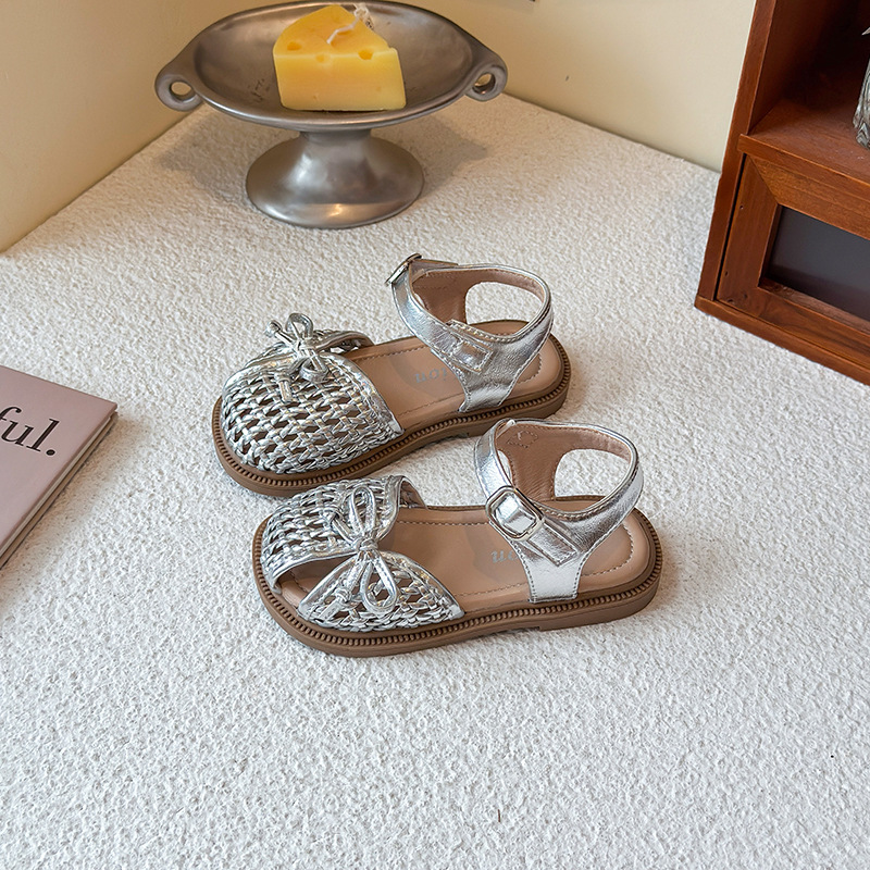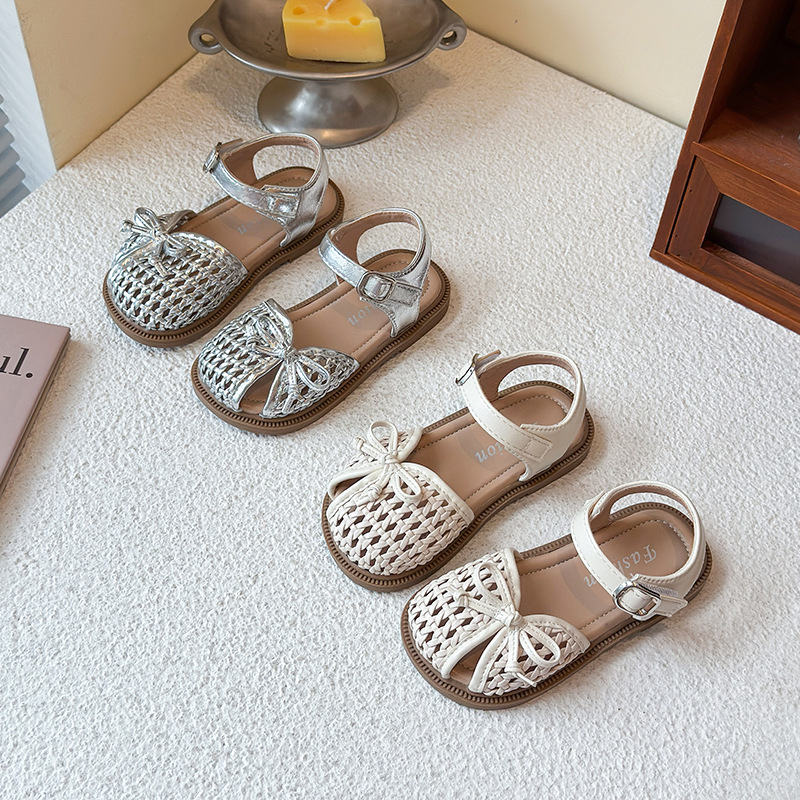 목가적 인 스타일 짠 아기 소녀 샌들 2025 여름 새 스타일 소녀 작은 공주 부드러운 바닥 어린이 여름 발가락 신발스토어 가기
