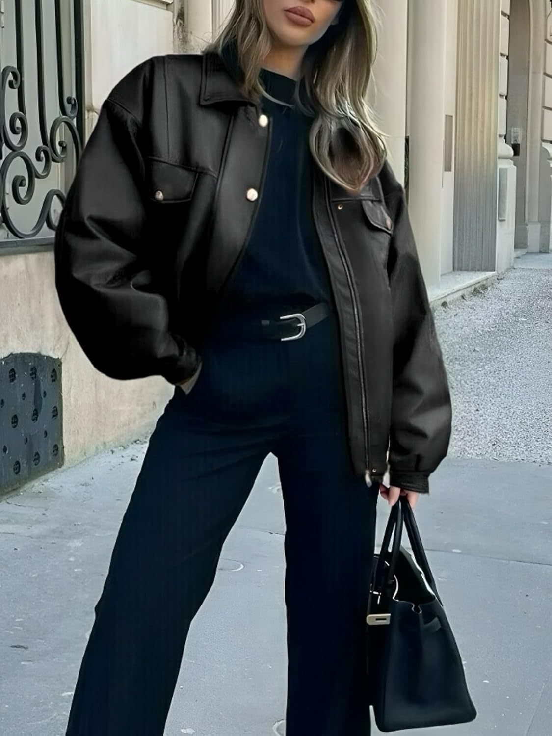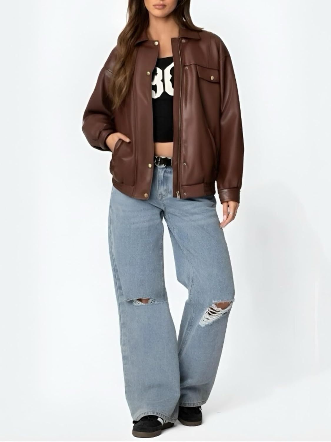 2025 유럽과 미국의 국경 간 여성 가을, 겨울 새로운 PU 가죽 자켓 느슨한 긴팔 옷깃 오토바이 복고풍 가죽 자켓