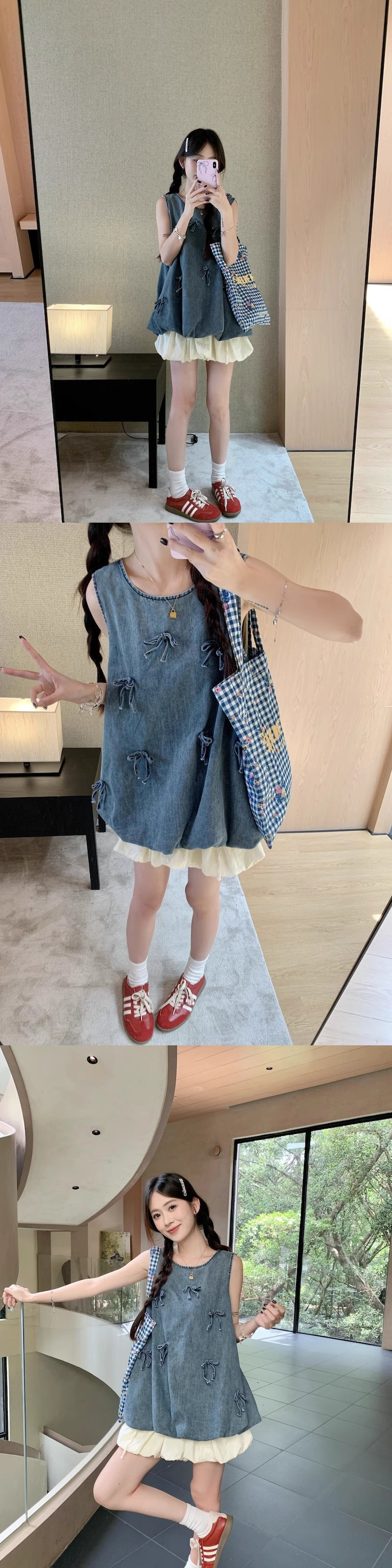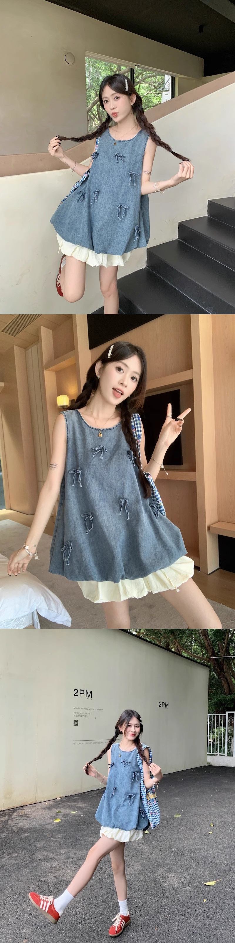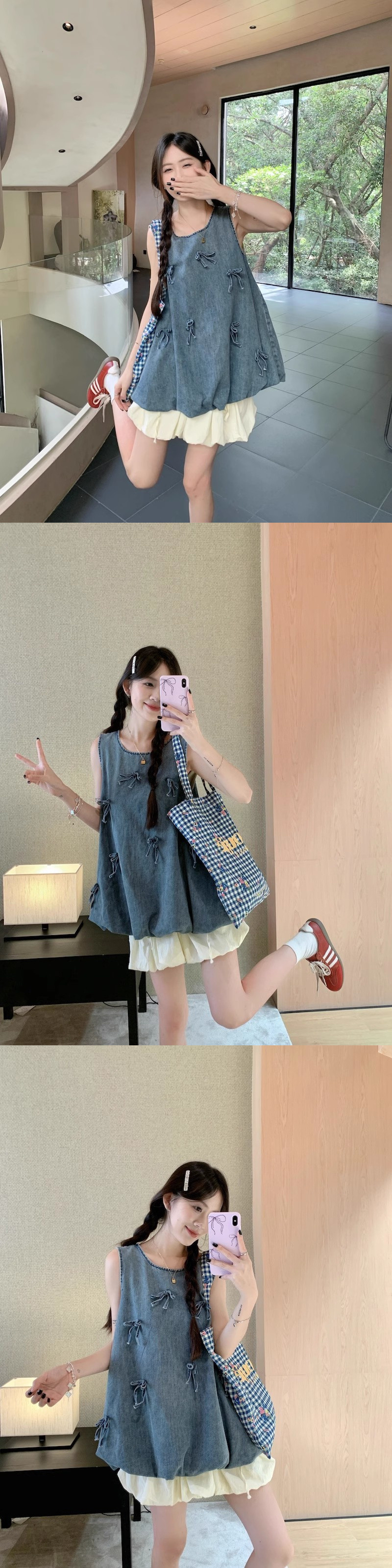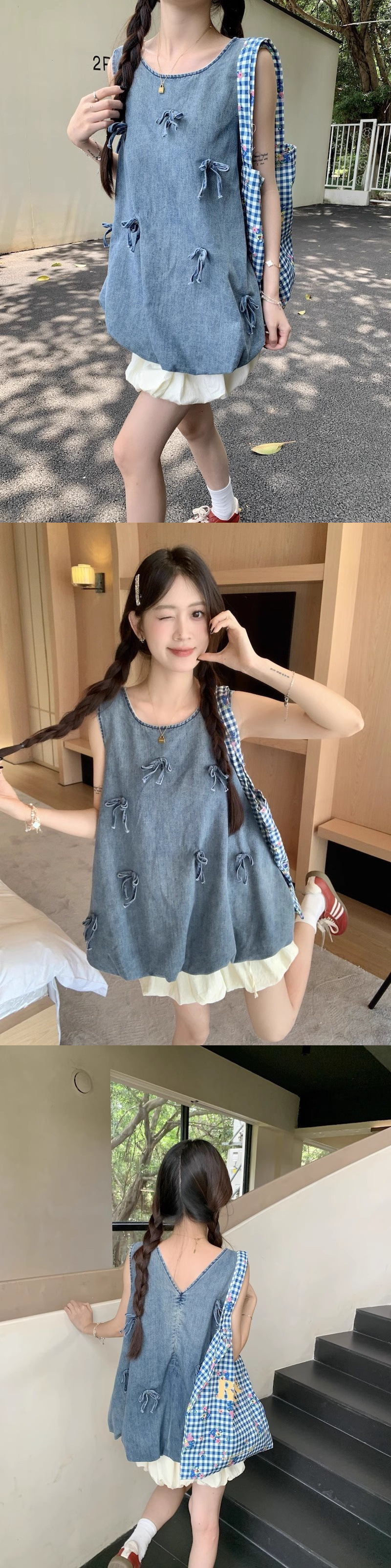 여성을 위한 달콤한 스타일 슈트, 입체 리본 데님 조끼, 여름 꽃봉오리 스커트, 투피스 세트스토어 가기