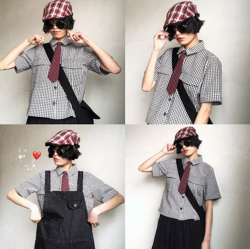 Xingna Jiang 꽃무늬 폴카 도트 스트라이프 만화 학생 셔츠 ins 짧은 작은 넥타이 여성 무료 일본식 귀여운스토어 가기