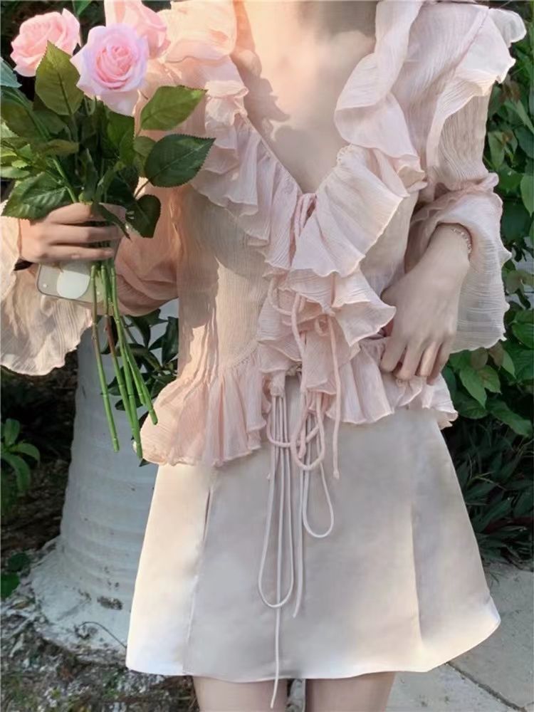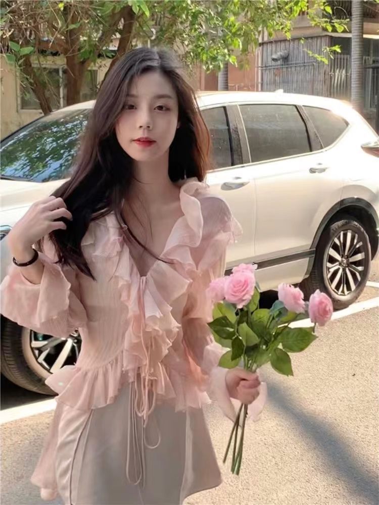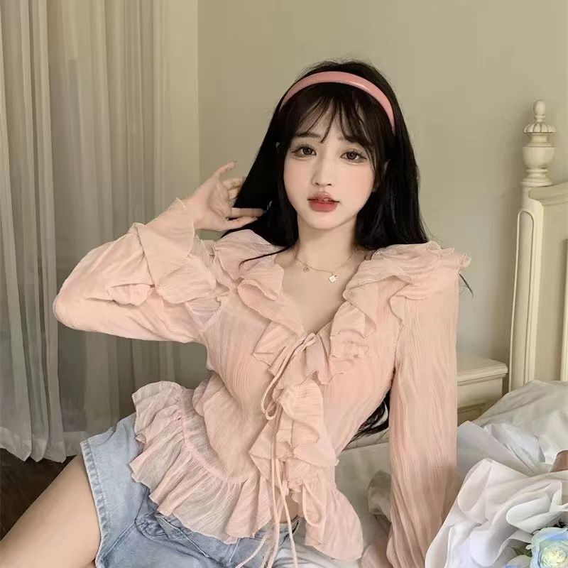 아이스 실크 쉬폰 자외선 차단 코트 여성 셔츠 여성 디자인 여름 신작 러플 카디건 칼라 숄 탑 트렌디스토어 가기