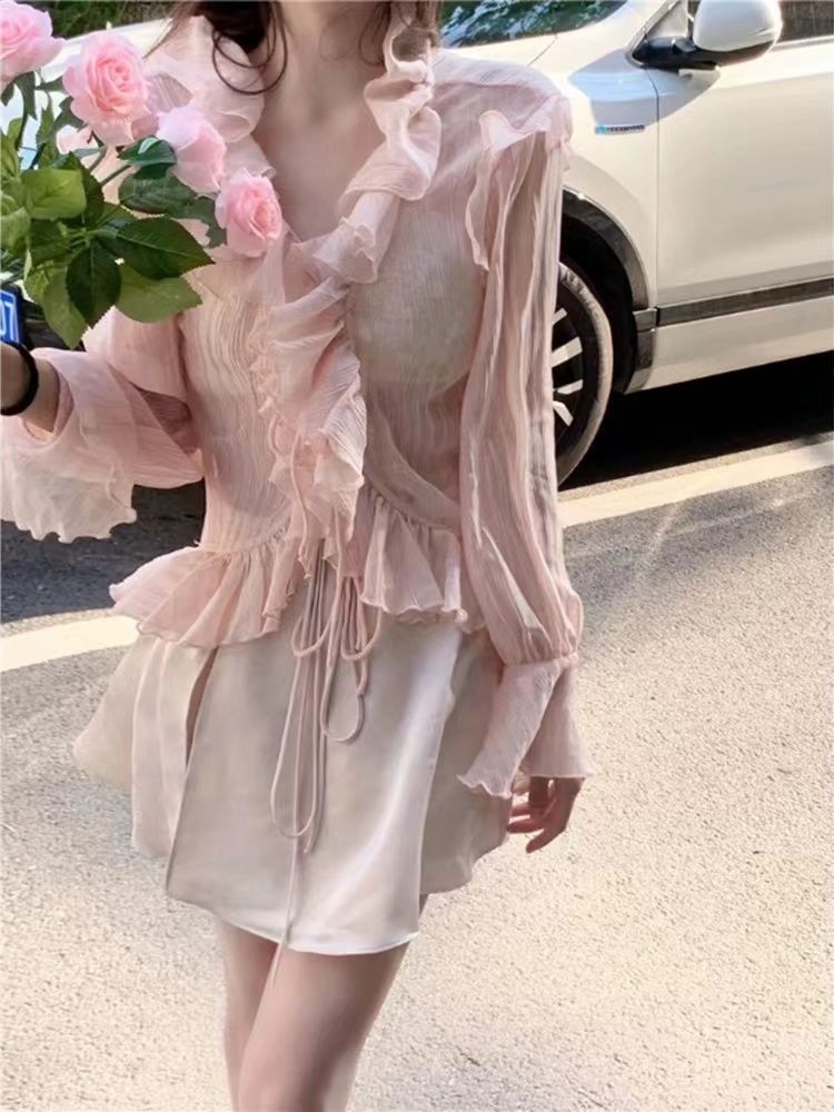 아이스 실크 쉬폰 자외선 차단 코트 여성 셔츠 여성 디자인 여름 신작 러플 카디건 칼라 숄 탑 트렌디