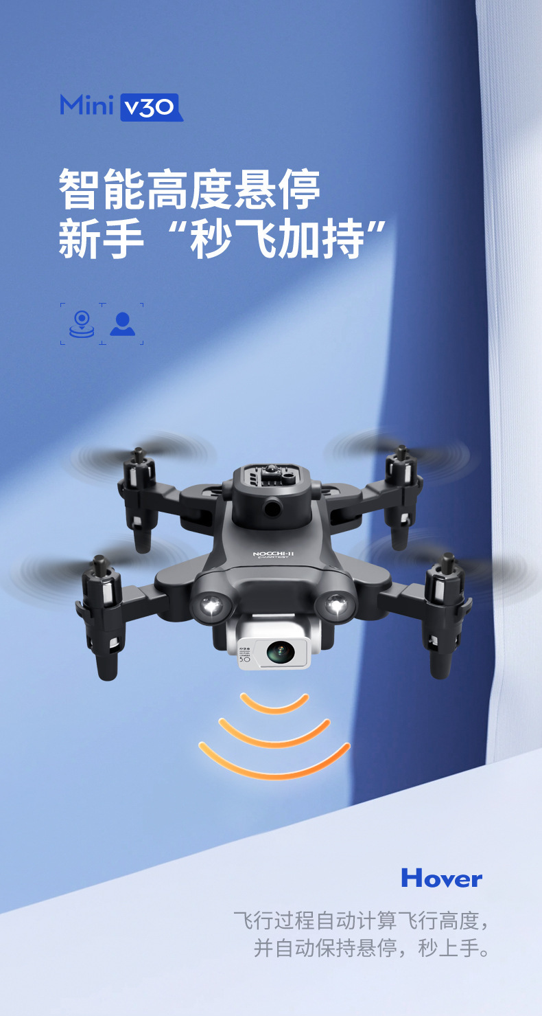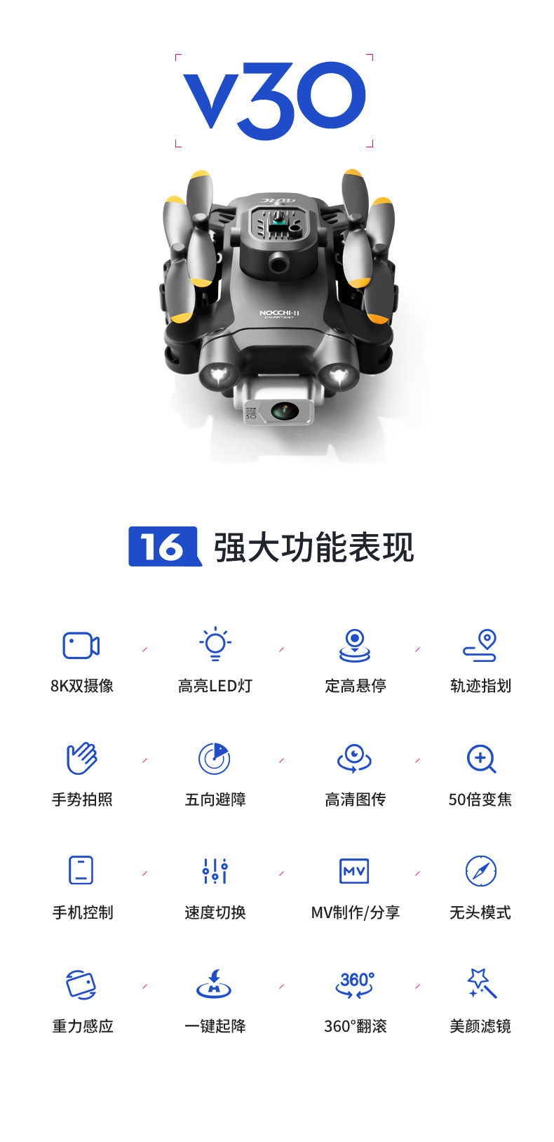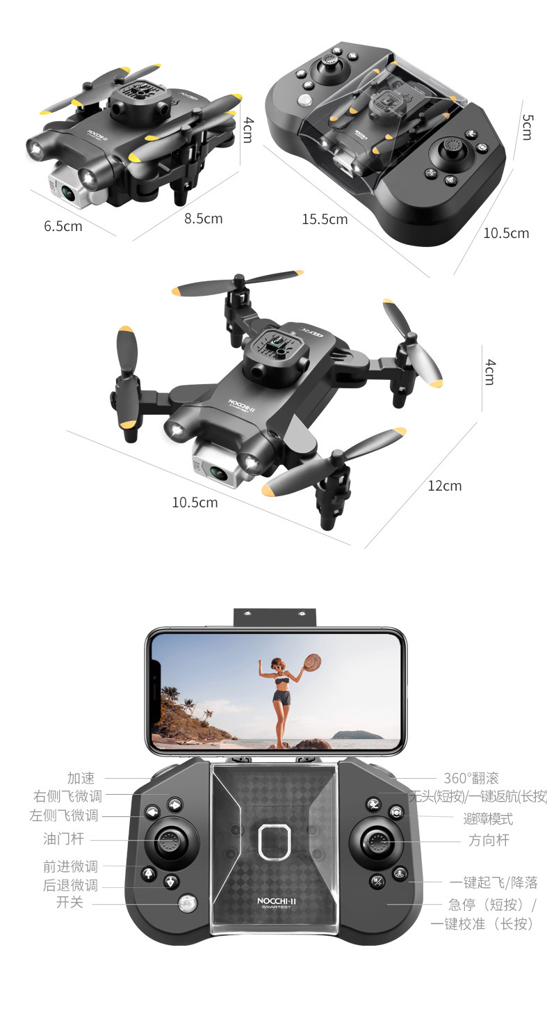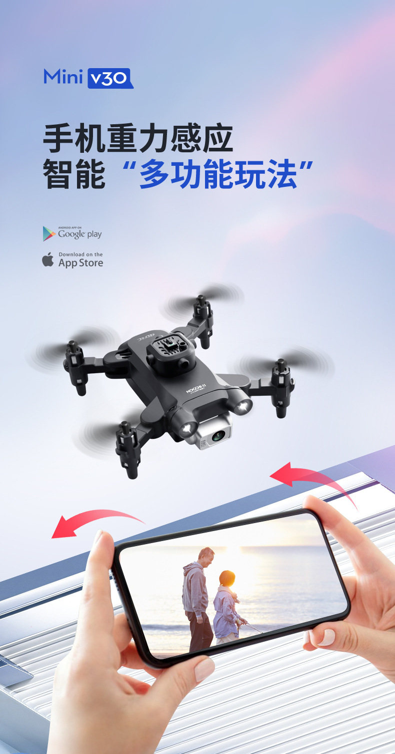 1.飞行器在空中有上升、下降、悬停、前进、后退、左转、右转、左侧飞、右侧飞、四边翻滚功能,无头模式,一键返回,定高功能。