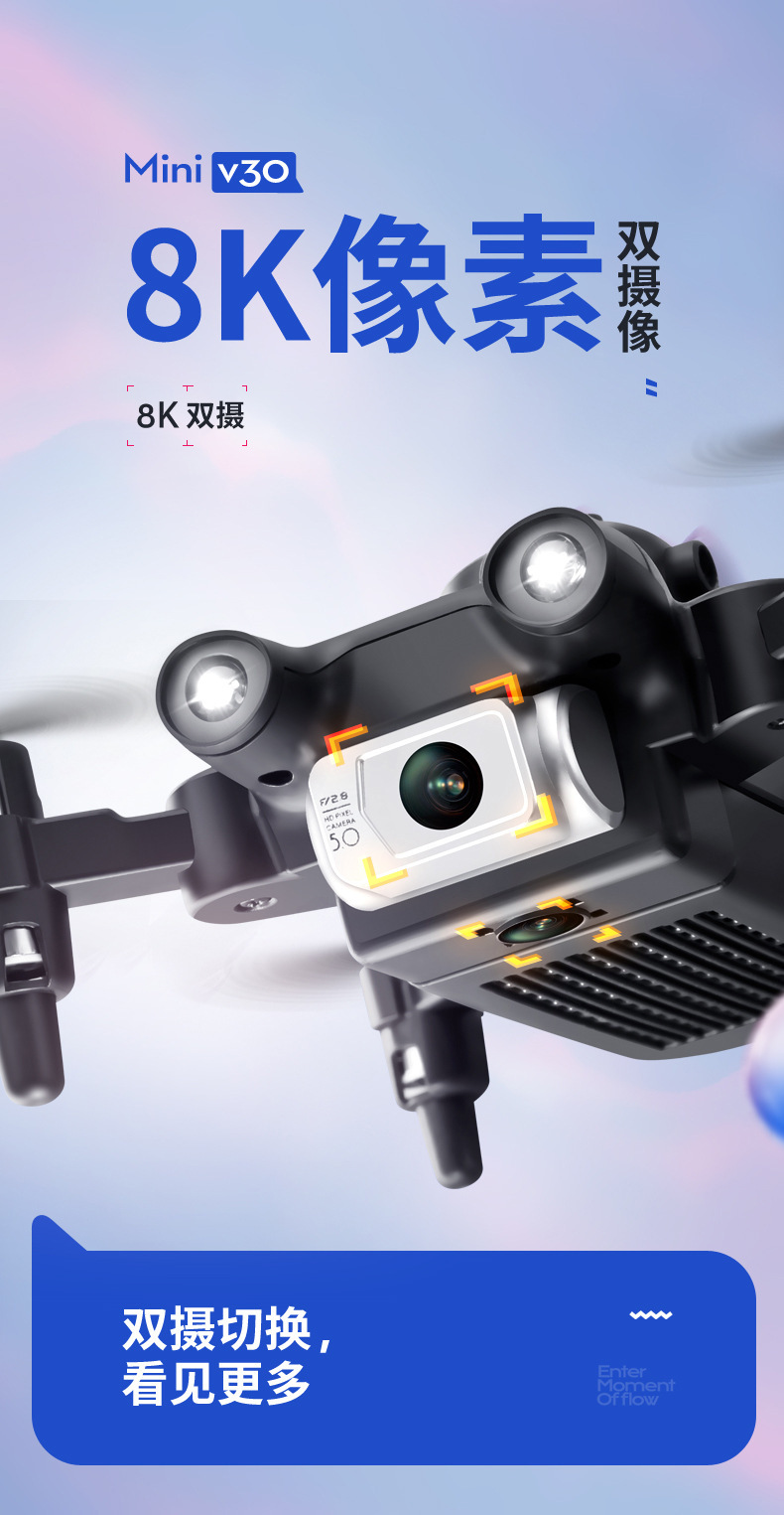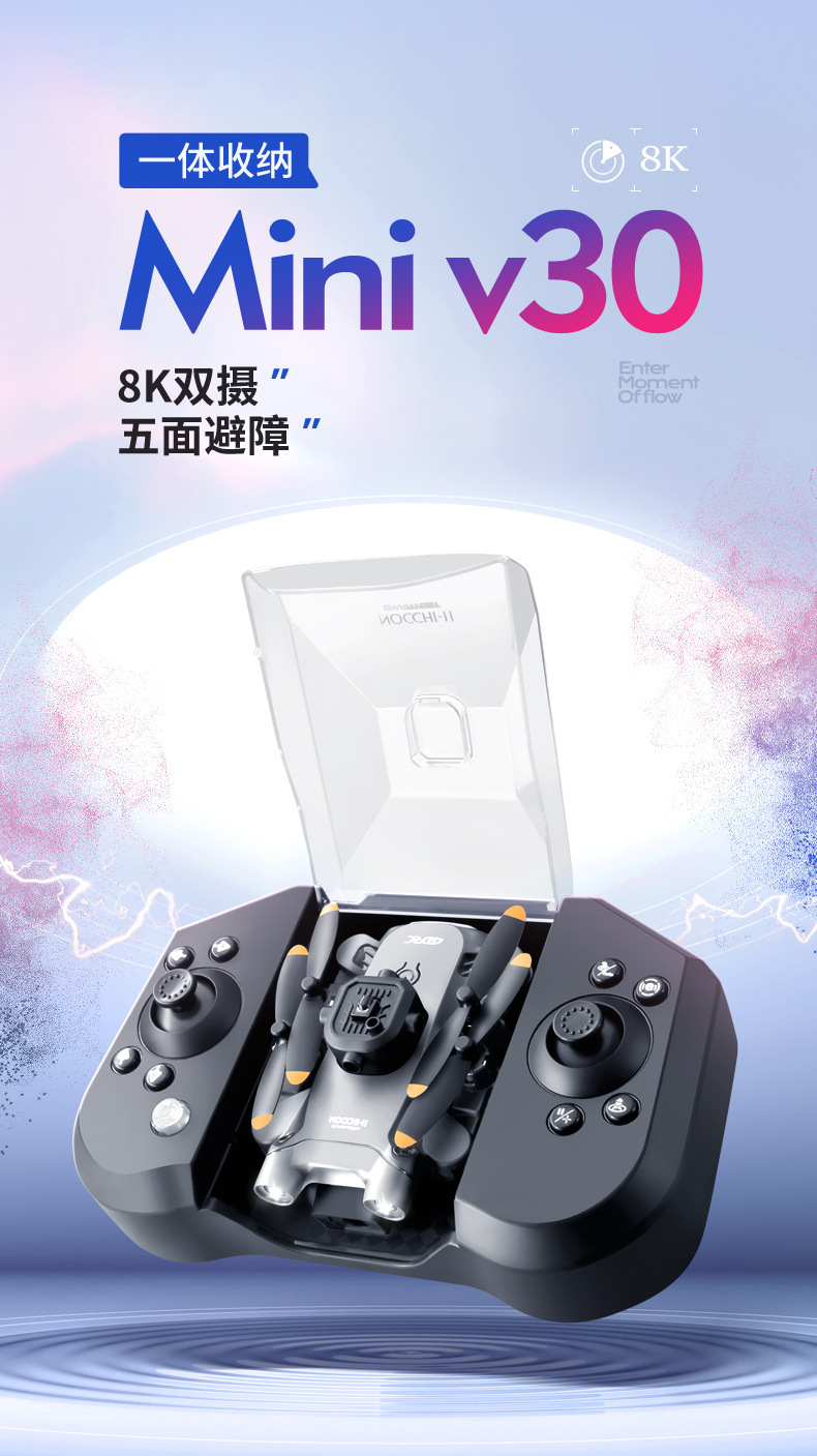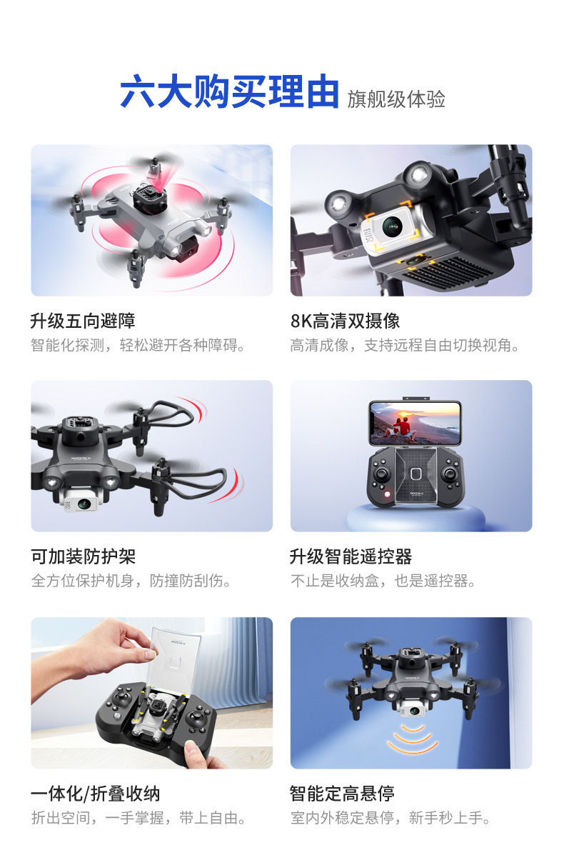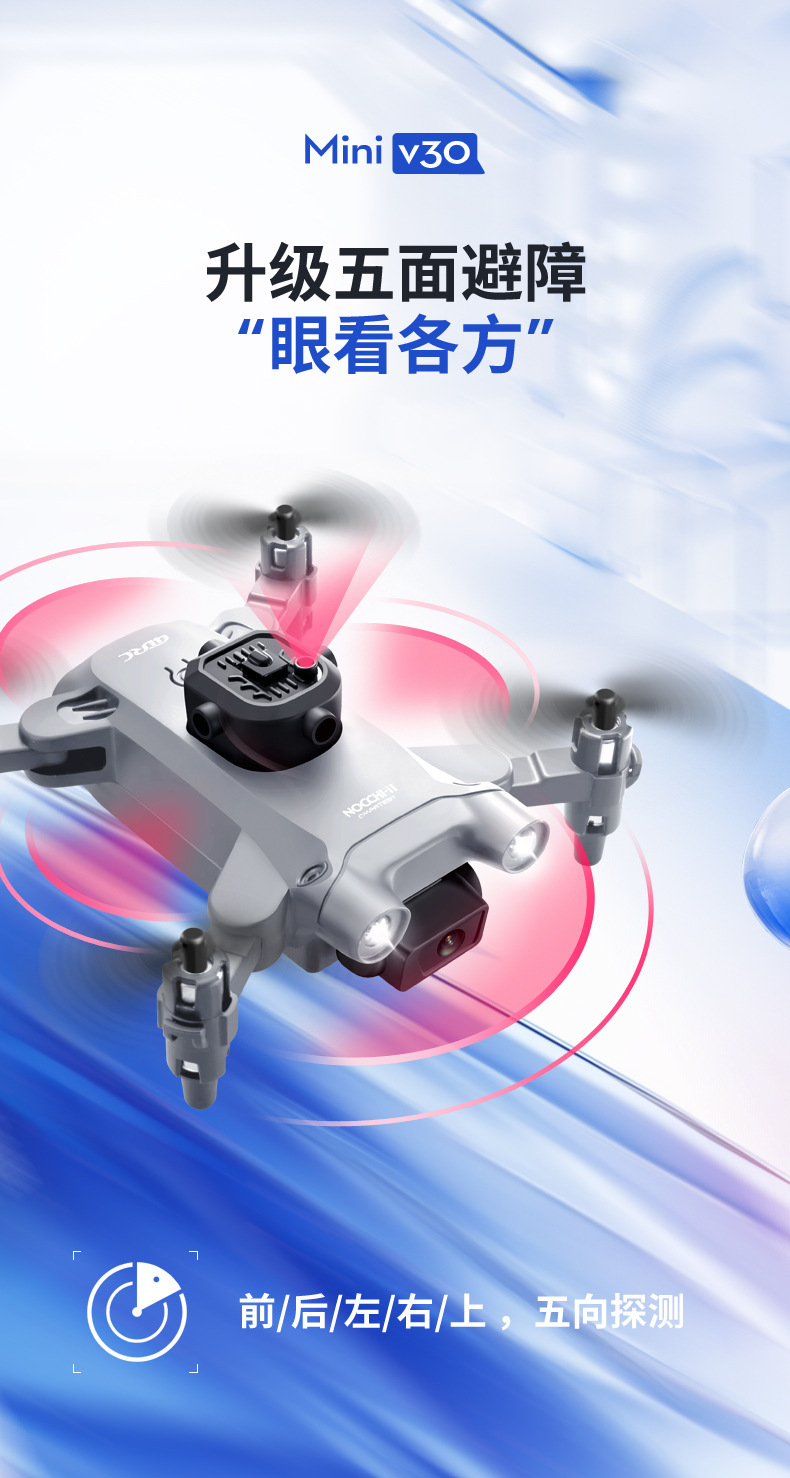 1.飞行器在空中有上升、下降、悬停、前进、后退、左转、右转、左侧飞、右侧飞、四边翻滚功能,无头模式,一键返回,定高功能。