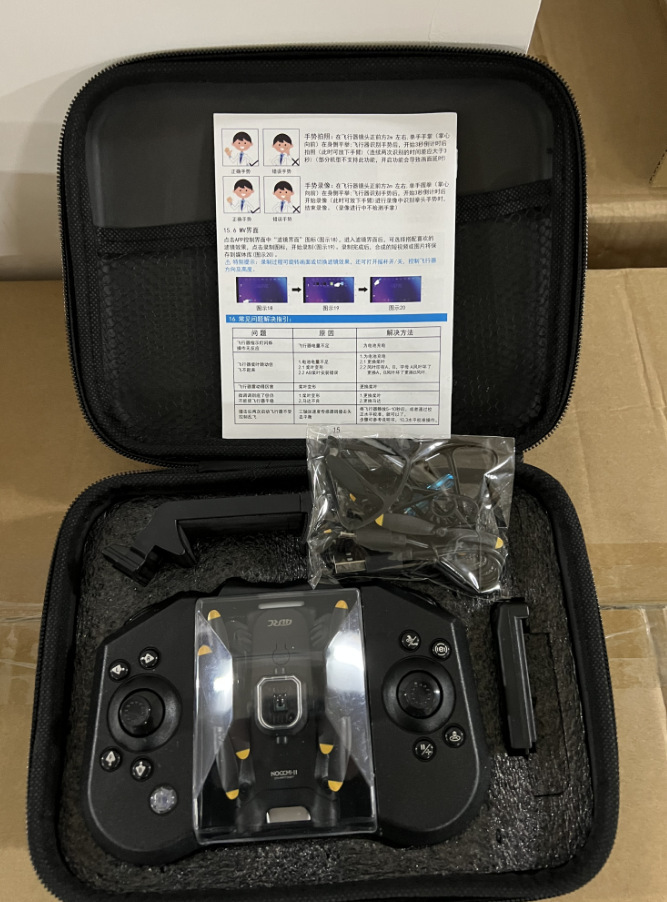 包装内含物:飞行器*1,遥控器*1, USB充电线*1,螺丝刀,保护架*4,电池*1,风叶*4(备用2A片+2B片),,wifi说明书*1,说明书*1