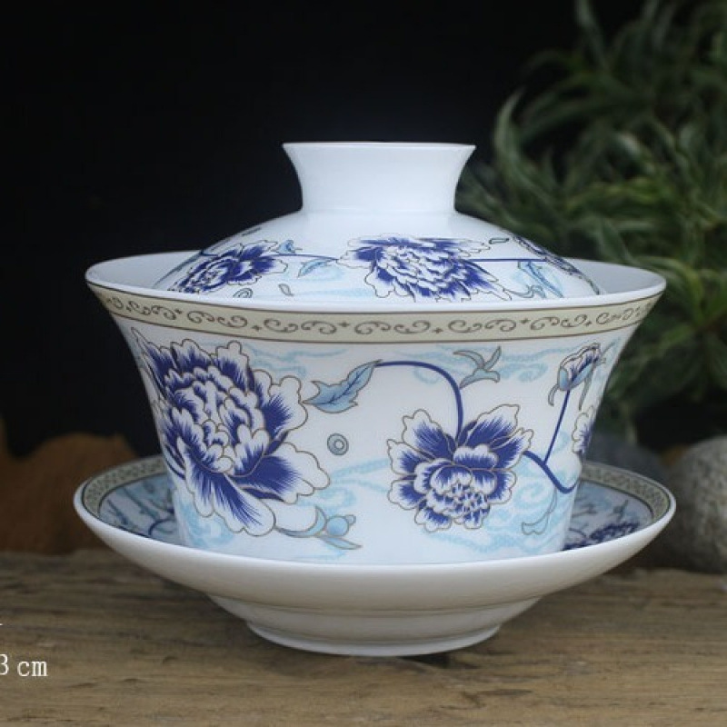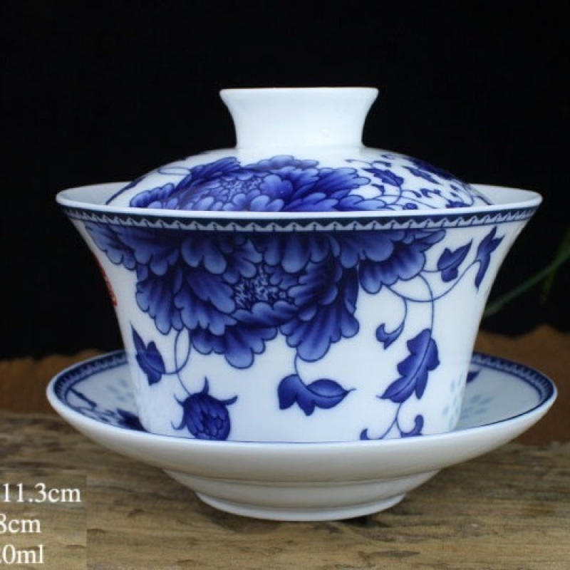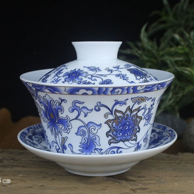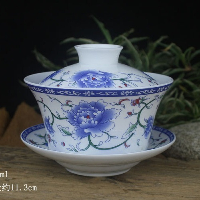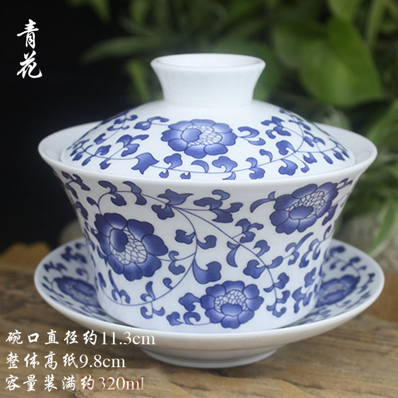 Sancai 그릇 뚜껑 그릇 단일 찻잔 차 세트 초대형 차 Dehua 세라믹 백자 파란색과 흰색 팔 보물 300ml스토어 가기