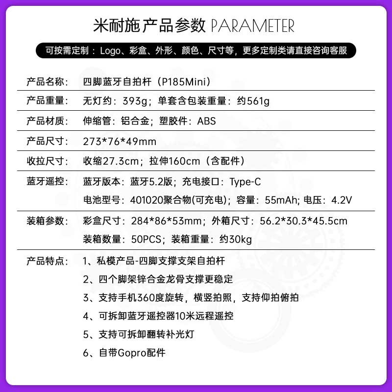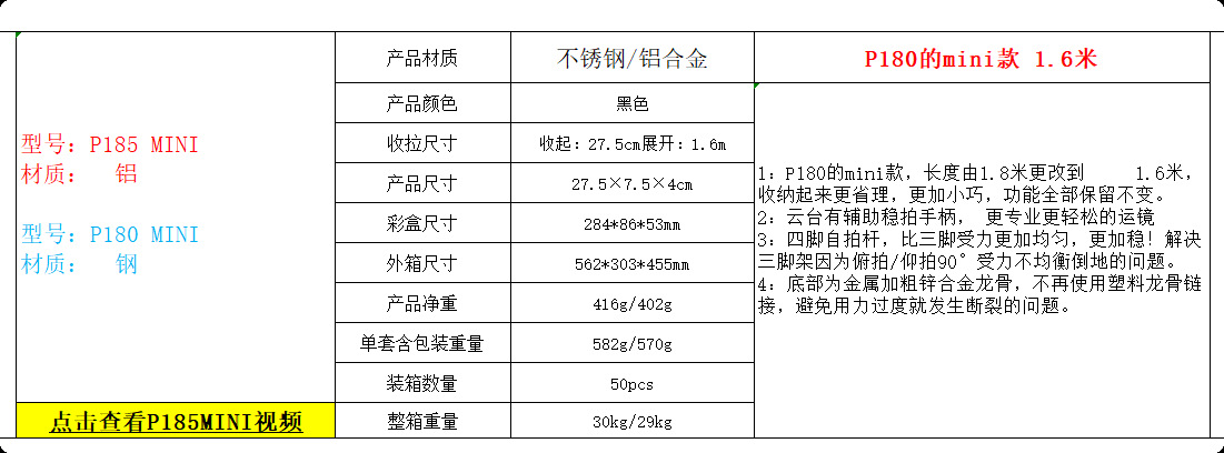 P185MINI 알루미늄 합금 휴대 전화 셀프 타이머 1.6 m 휴대용 안정제 바닥 망원경로드 라이브 4 중스토어 가기