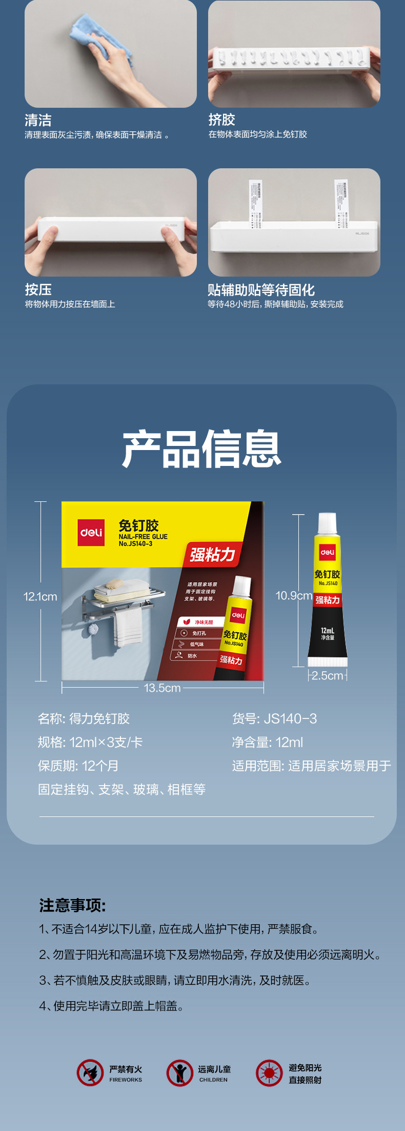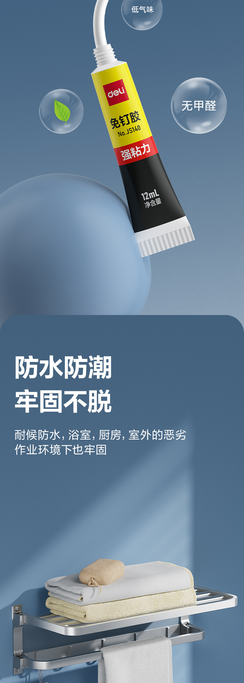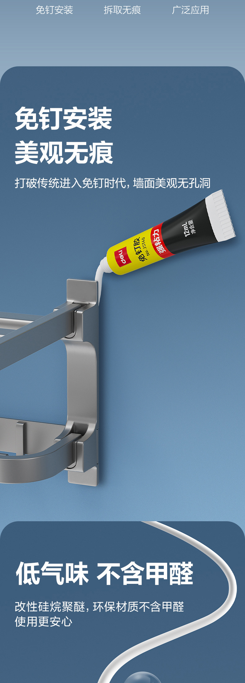 델리 JS140 못없는 접착제, 강력한 접착력, 펀치없는 범용 접착제, 고점도 방수 벽 접착제, 3팩
