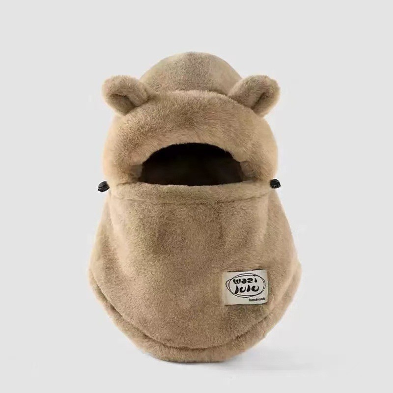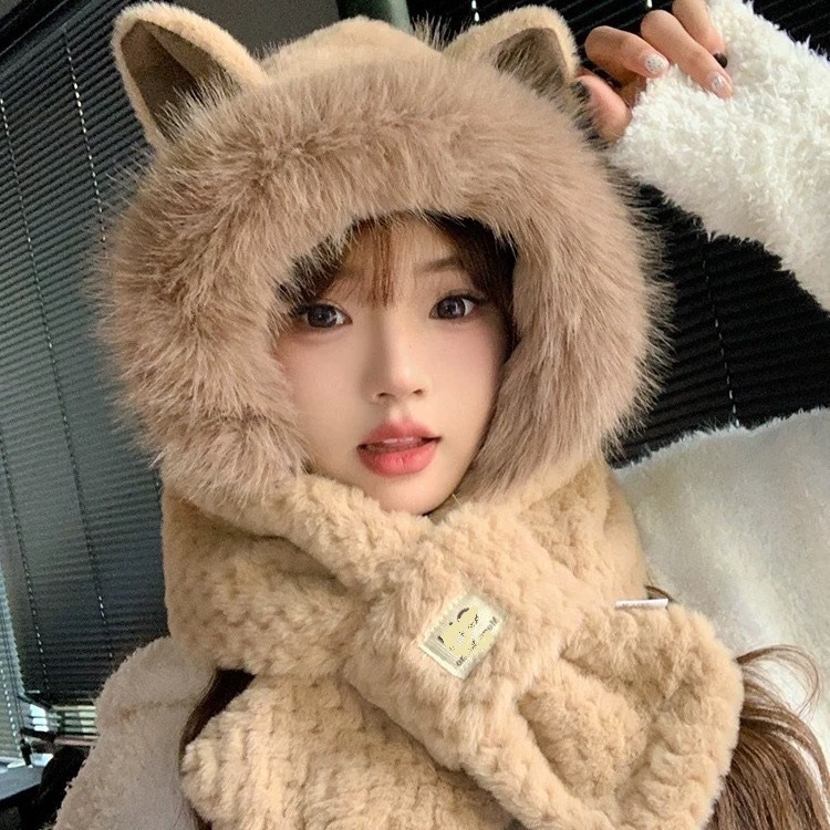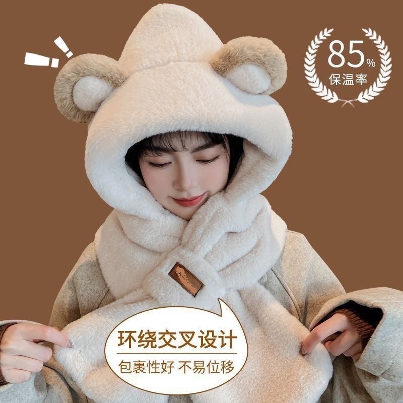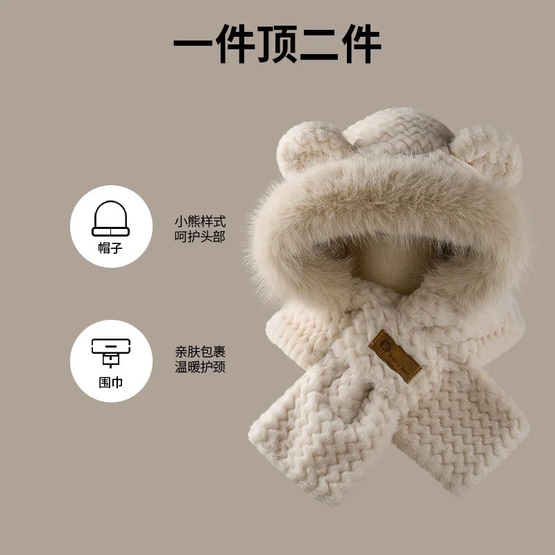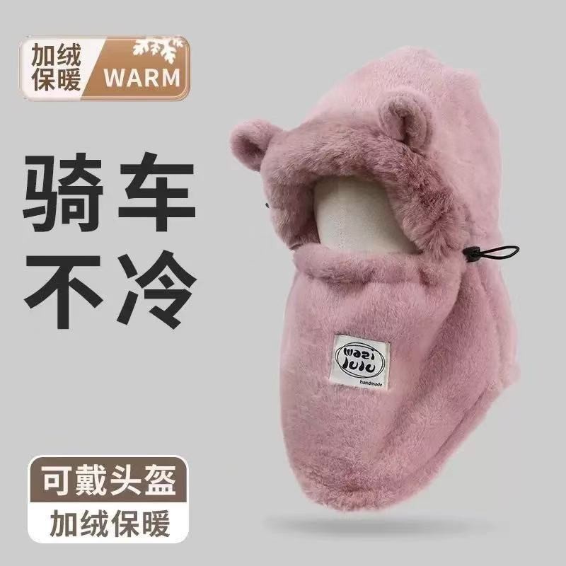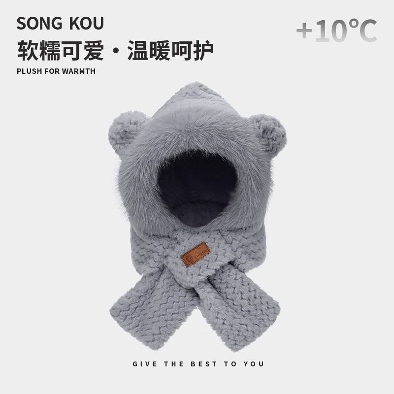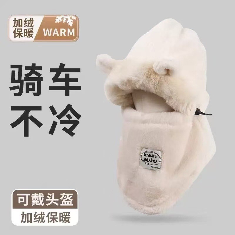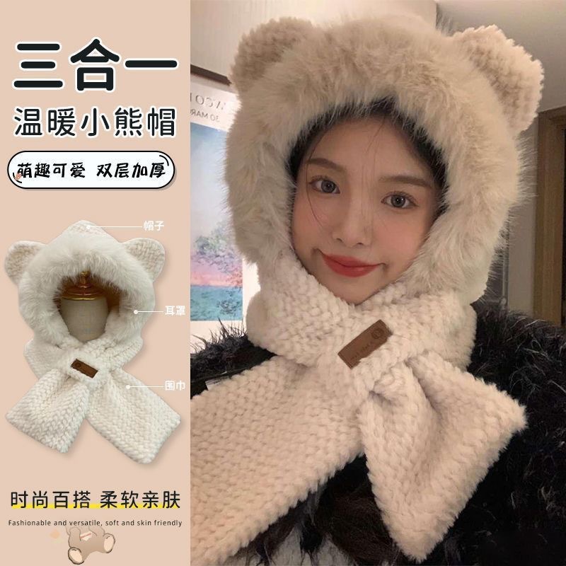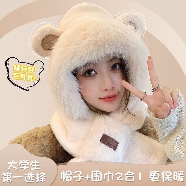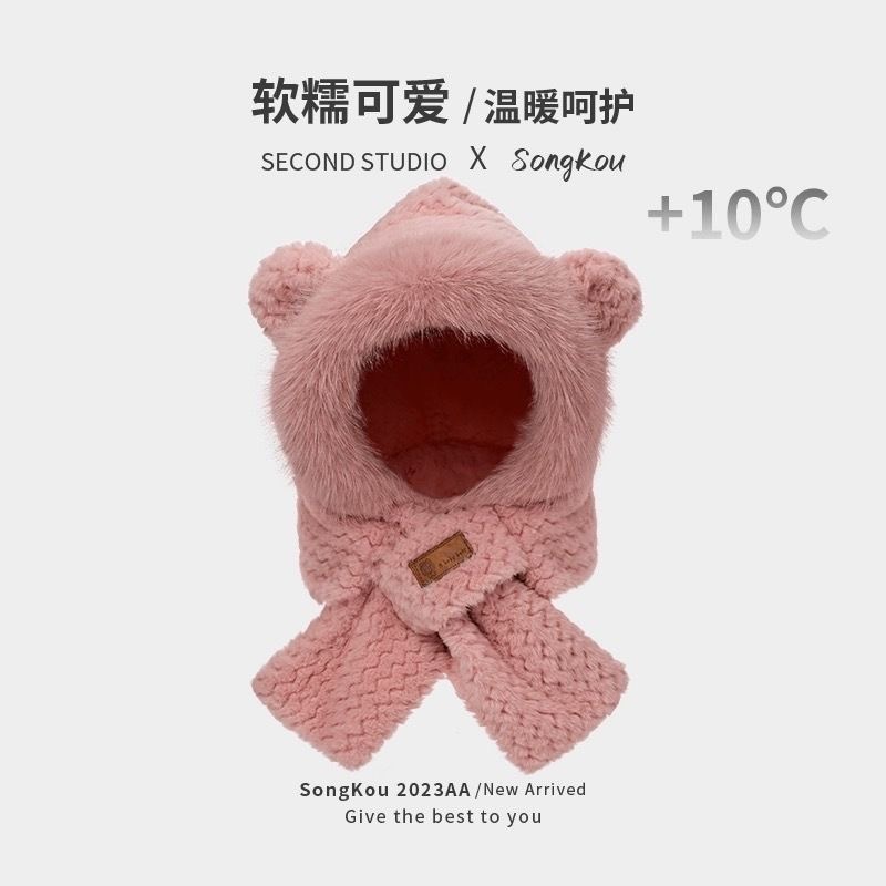 플러시 귀여운 곰 귀 보호 모자와 스카프 올인원 여성 가을, 겨울 사이클링 따뜻하고 방한 바오터우 모자스토어 가기