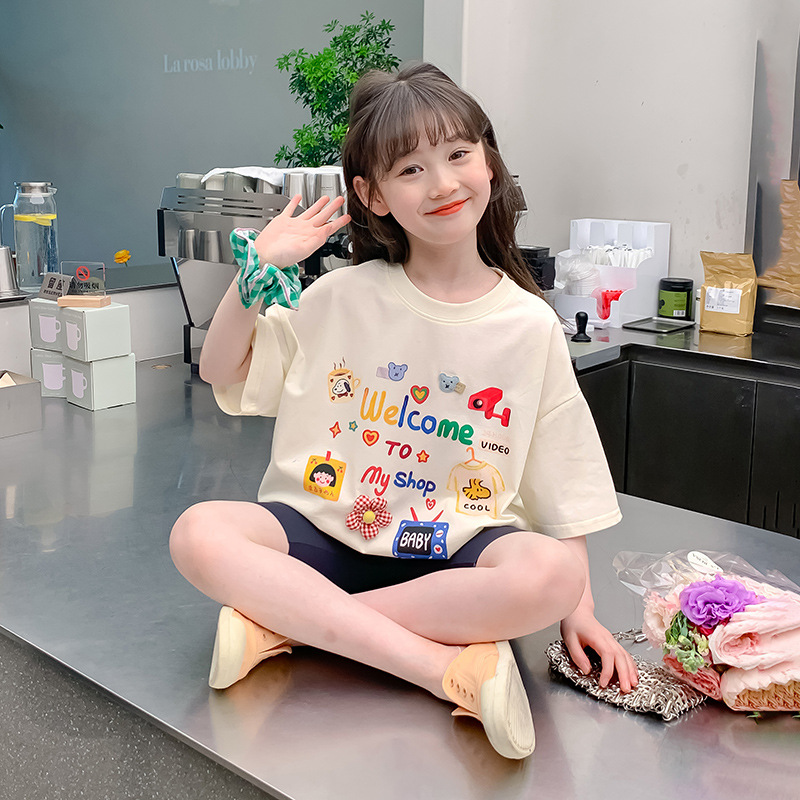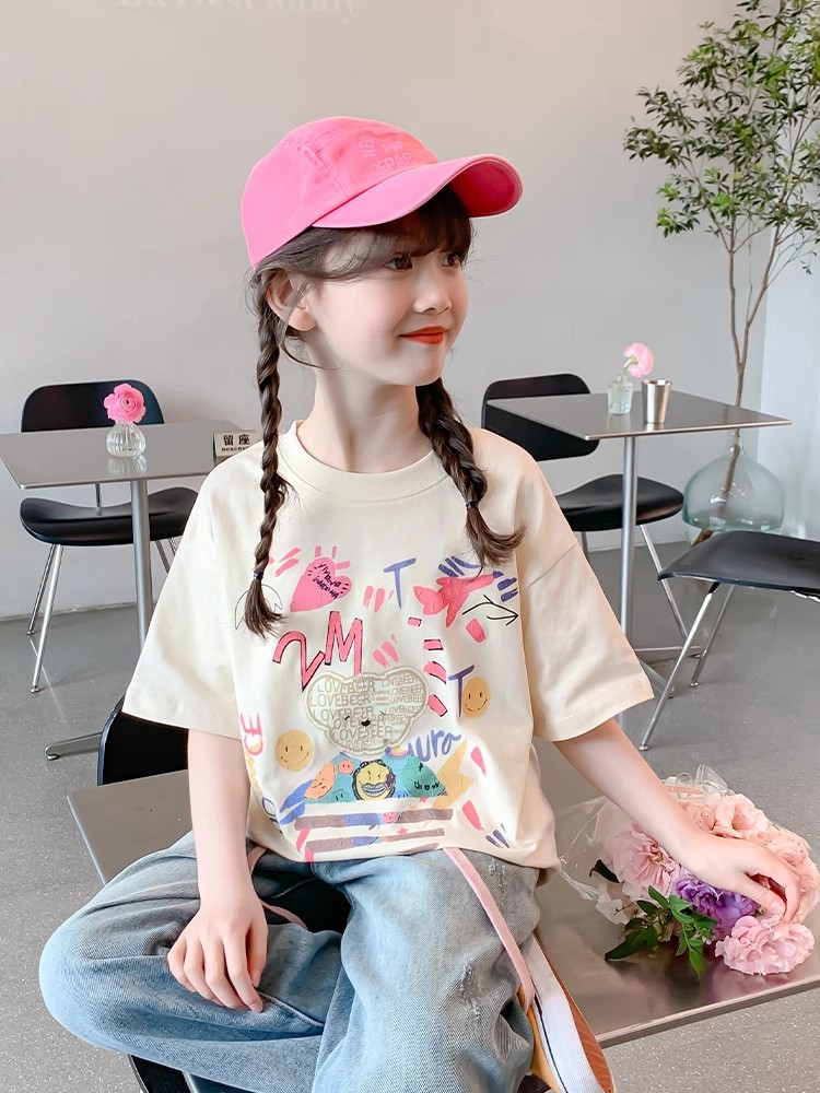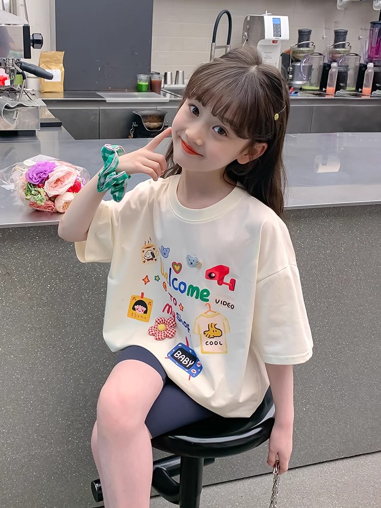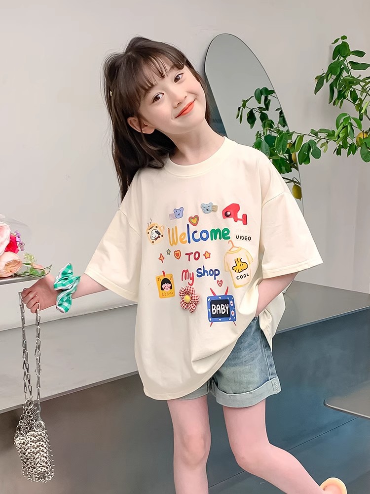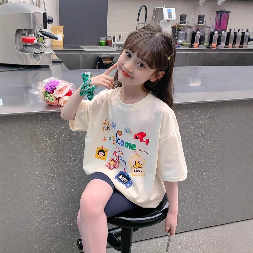 소녀 면 반소매 T2025 새로운 어린이 여름 티셔츠 대형 어린이 여름 만화 인쇄 반소매 탑스토어 가기
