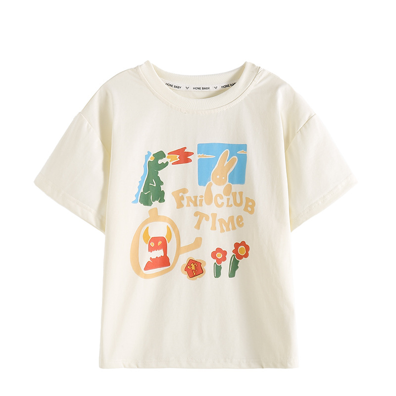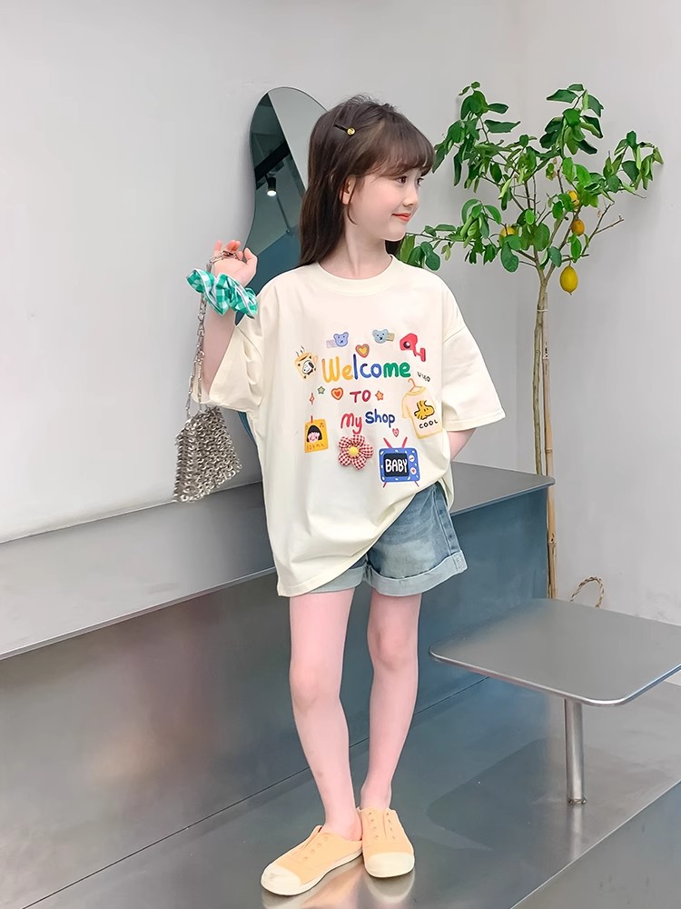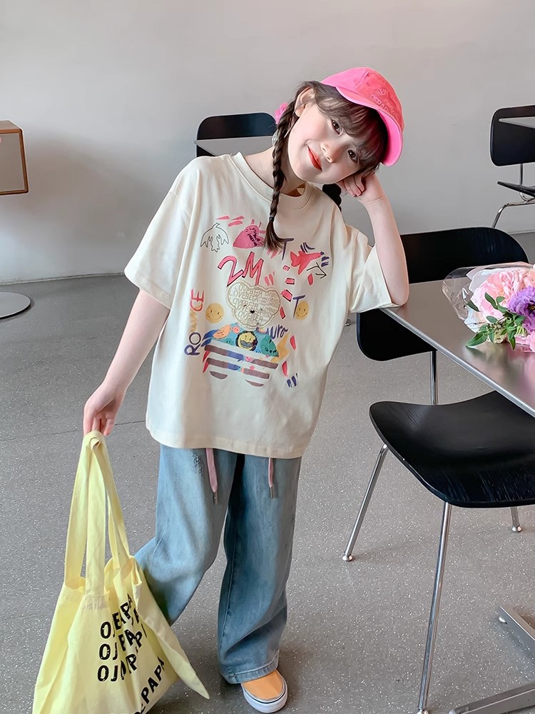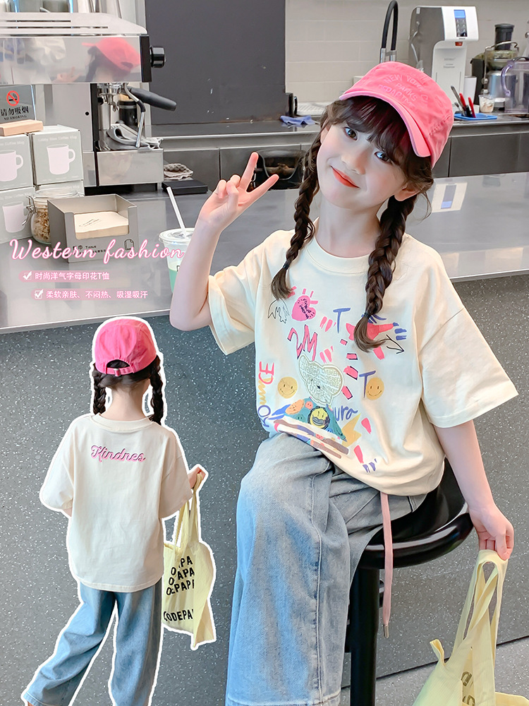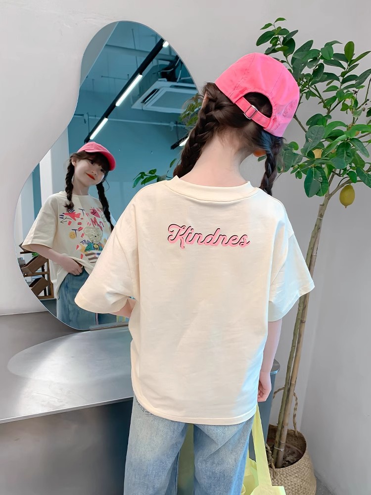 소녀 면 반소매 T2025 새로운 어린이 여름 티셔츠 대형 어린이 여름 만화 인쇄 반소매 탑스토어 가기