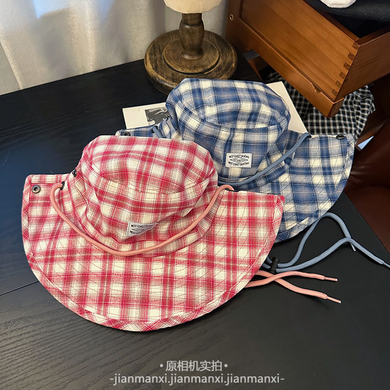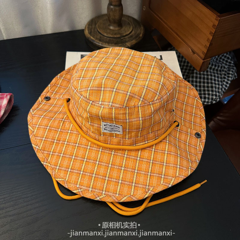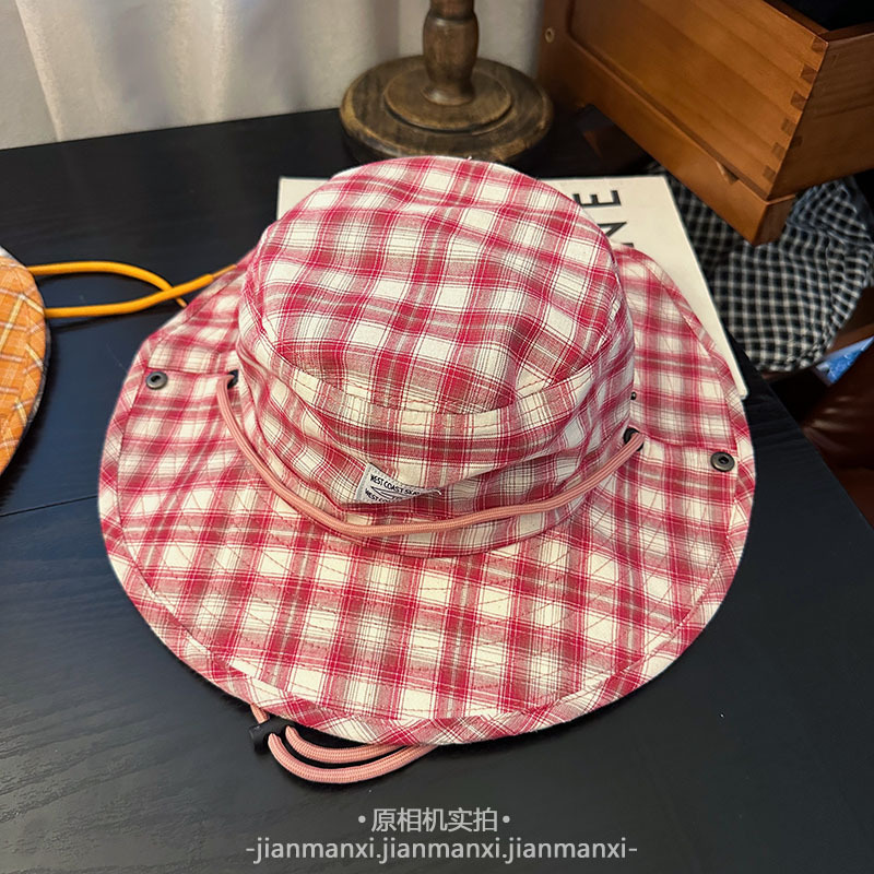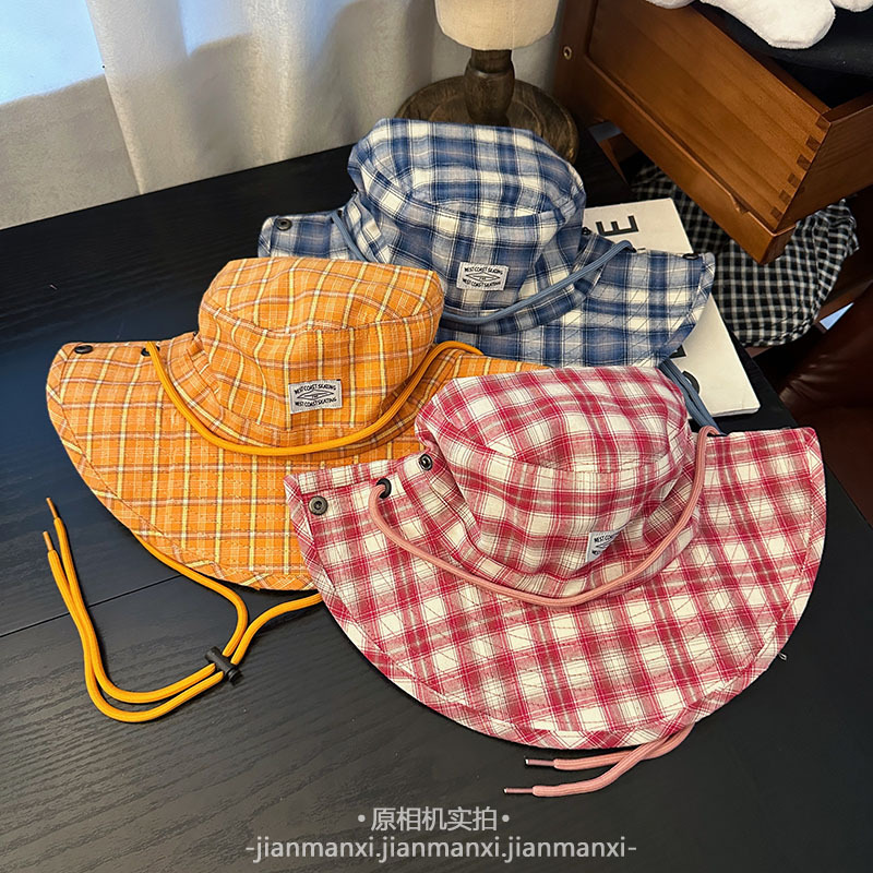 부모-자식 여름 새로운 복고풍 격자 무늬 어부 모자 방풍 졸라매는 끈 큰 챙 태양 보호 야외 등산 및 캠핑 모자스토어 가기