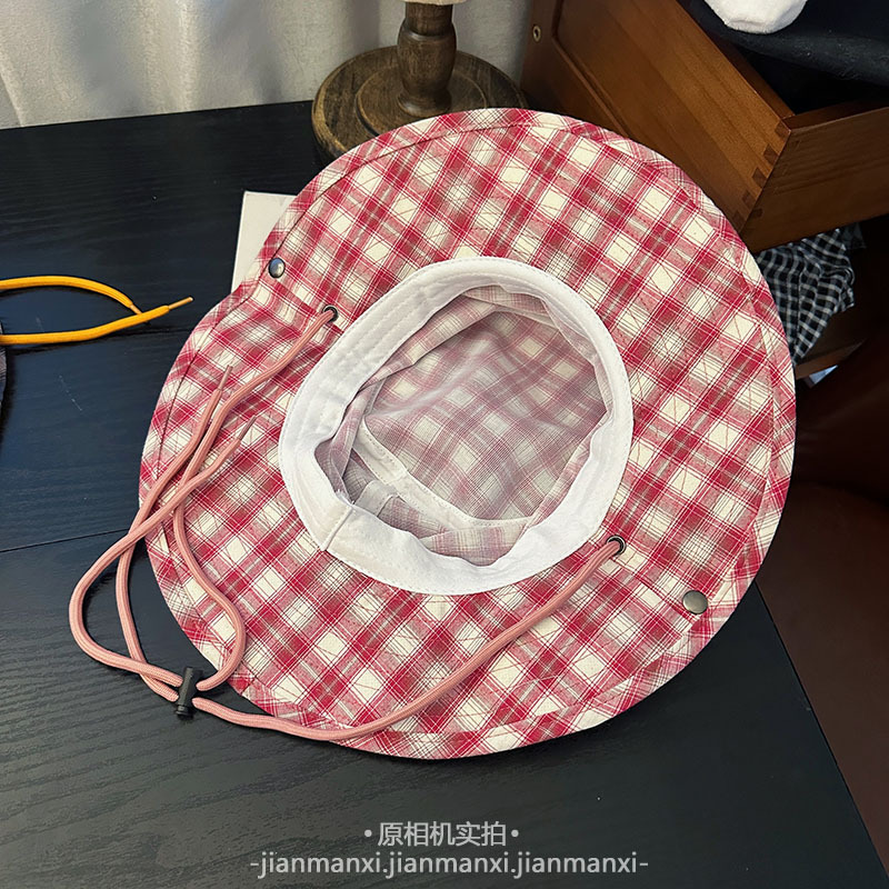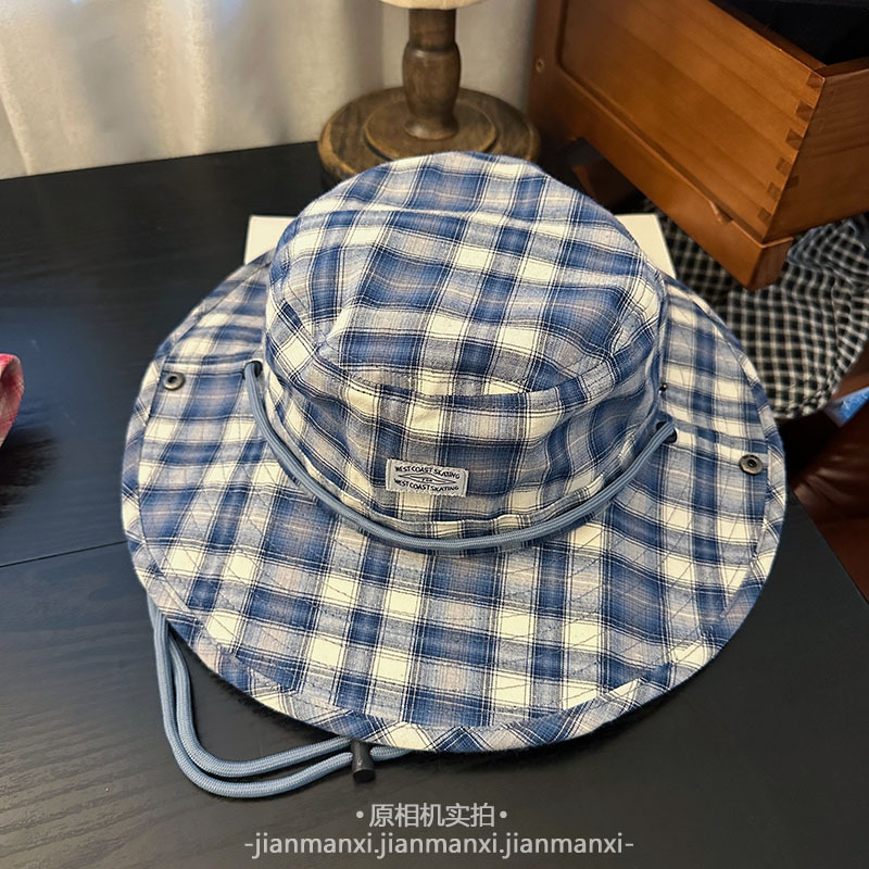 부모-자식 여름 새로운 복고풍 격자 무늬 어부 모자 방풍 졸라매는 끈 큰 챙 태양 보호 야외 등산 및 캠핑 모자