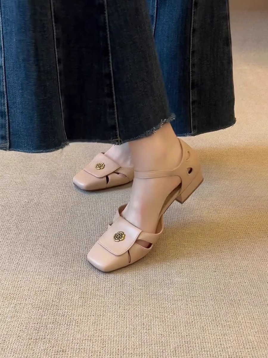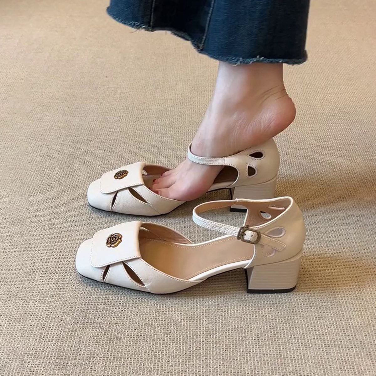 부드러운 가죽 버전 ~ 프렌치 카멜리아 중공 발가락 샌들 통근 스타일 스퀘어 토 두꺼운 굽 여성용 싱글 슈즈