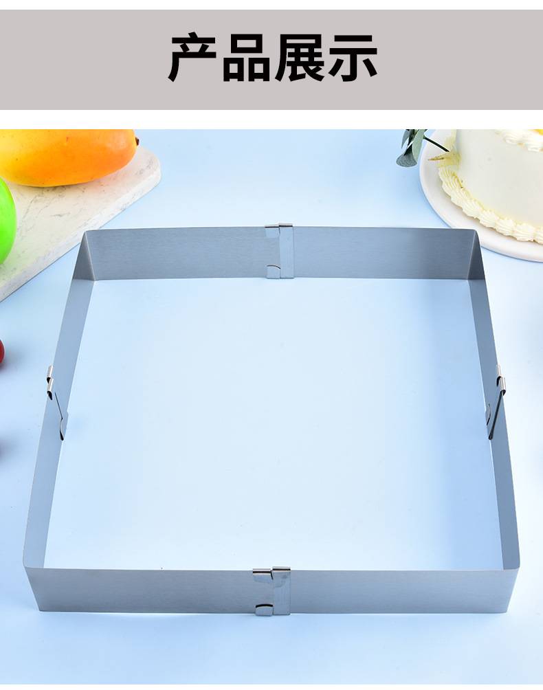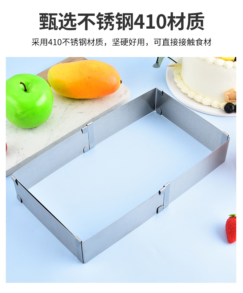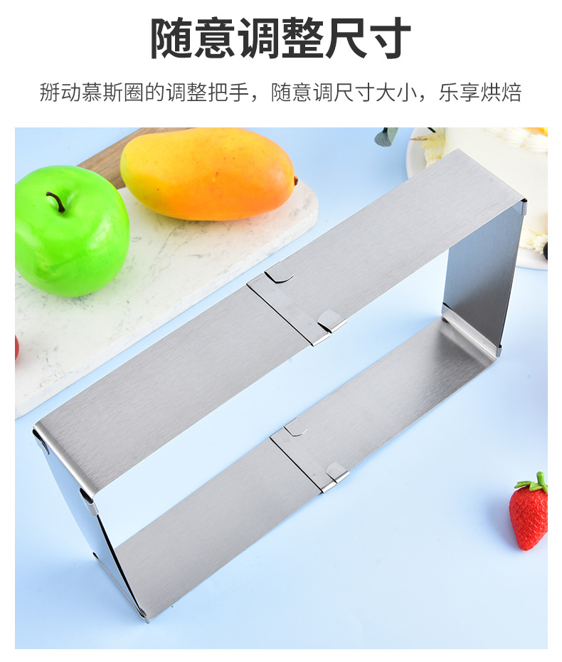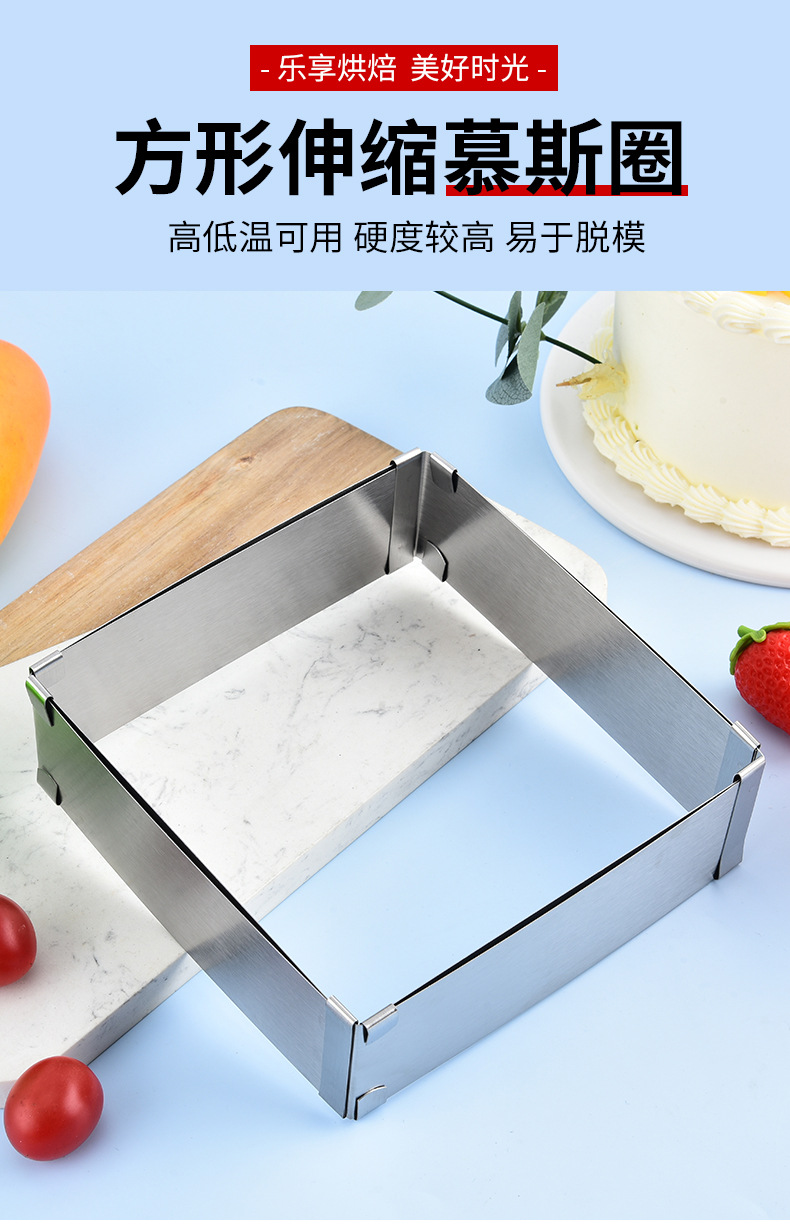 재고 대형 스퀘어 스테인레스 스틸 조정 가능한 텔레스코픽 스퀘어 무스 서클 케이크 금형 DIY 베이킹 금형스토어 가기