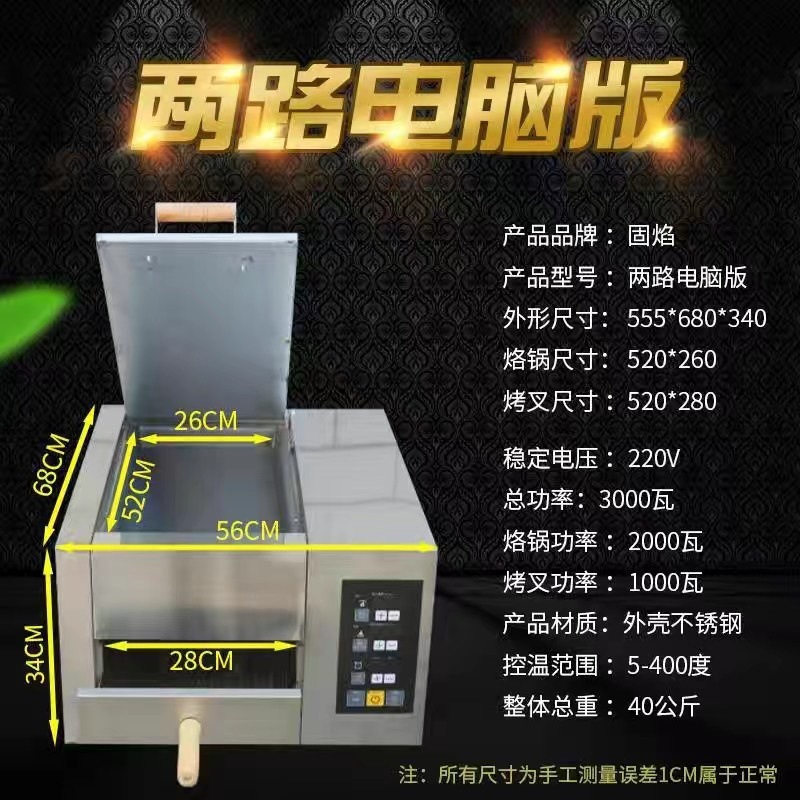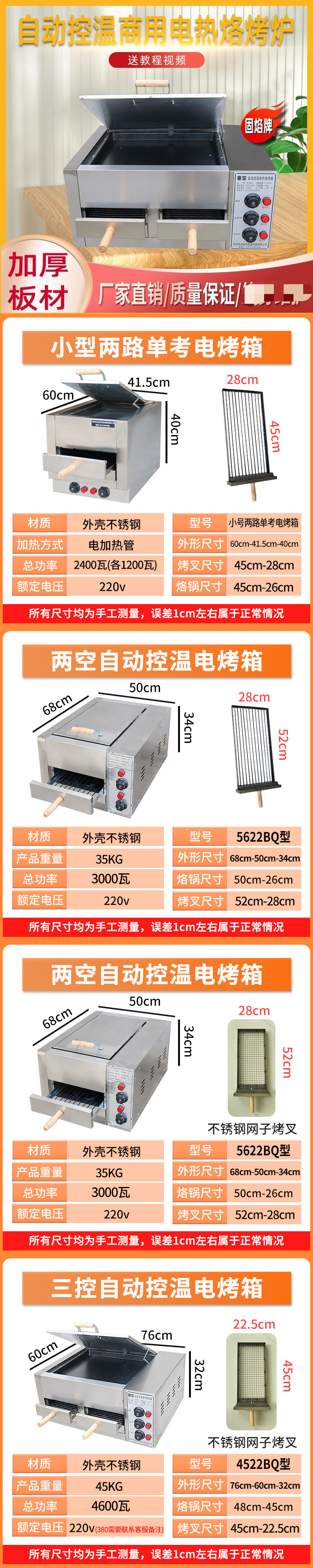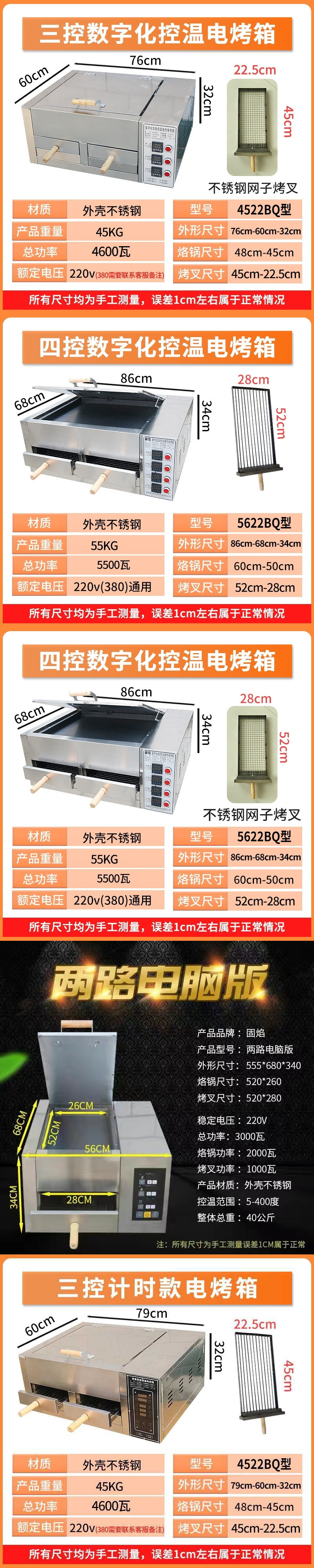 购买须知 1.关于物流 新疆,西藏 需要联系客服补差价 县里市里在派送区域可以送货上门(送货上门是指送到小区门口或街道不能送货上楼)镇自提村组不送如有疑问 了避免宝贝在运输物流出现各种情况,望亲在签收之前验货。 2本产品均是大功率电器,均没有插头,为了安全第一需要亲自备30-50安漏电保护器,有任何疑问可以咨询客服 3咱们产品是商用烤炉,不让试用 不让试用 不让试用 影响二次销售 非要退 只能根据炉子折价退货。具体多少以商家看到货物情况为准。所以有问题联系客服解决。 须知到此结束 望宝们周知 祝宝们天天开心生活愉快发大财
