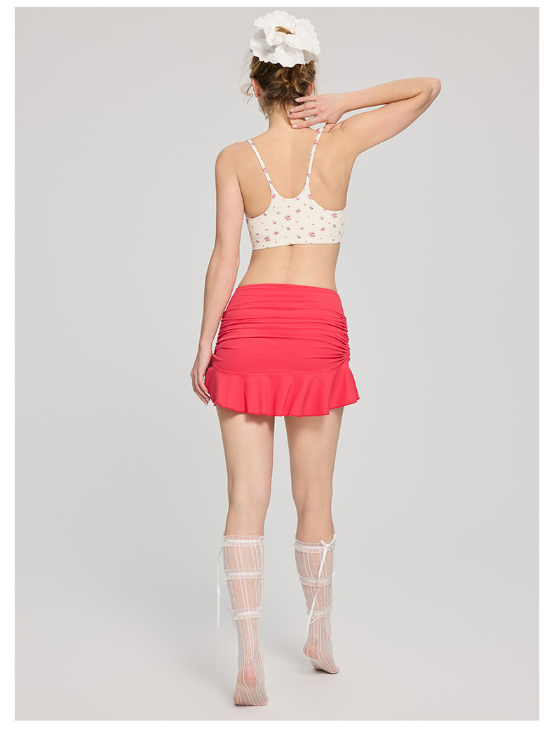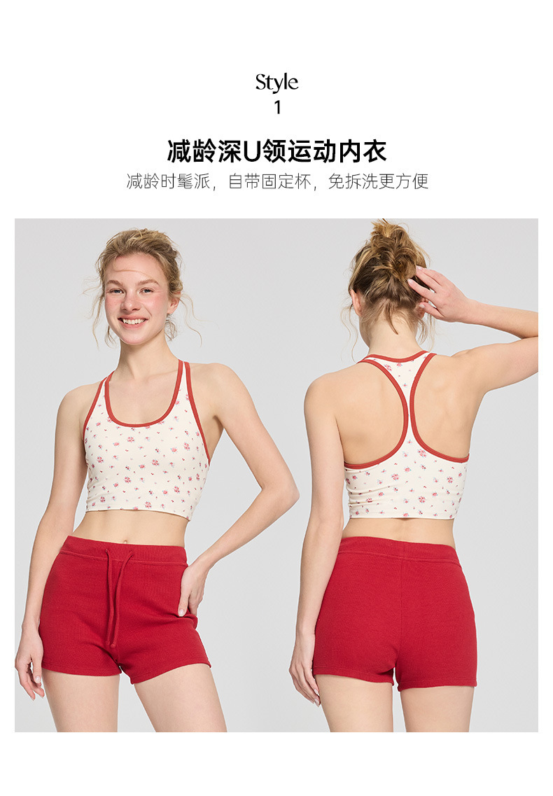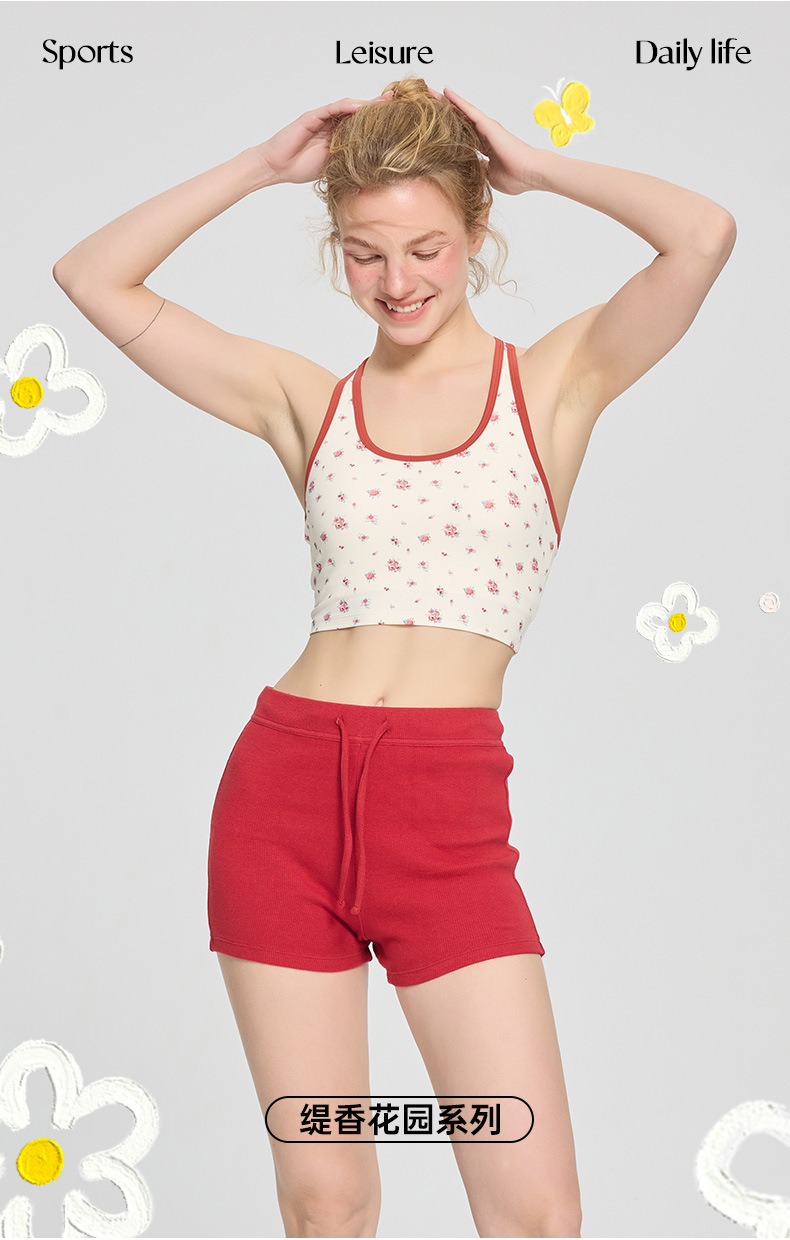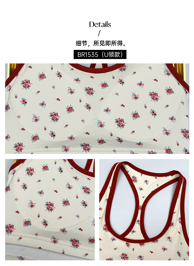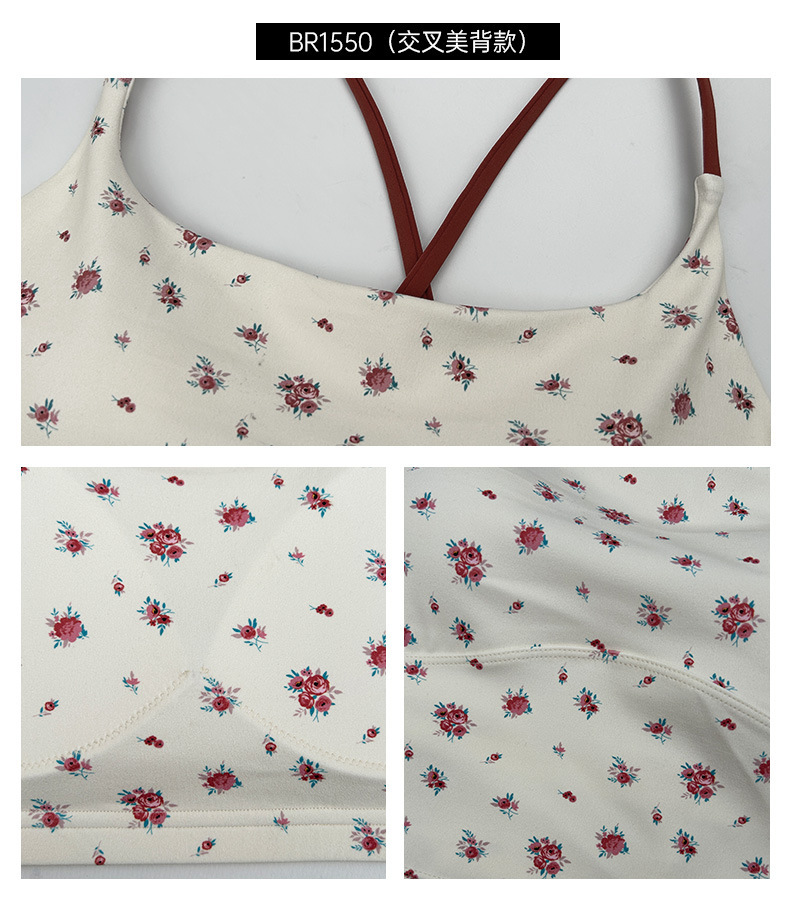 주위에 흩어져 있는 새로운 스타일의 여성용 요가복, 레트로 플로럴 스포츠 슬리브리스 탑, 피트니스 아우터웨어, 이너웨어, 슬림핏 속옷스토어 가기