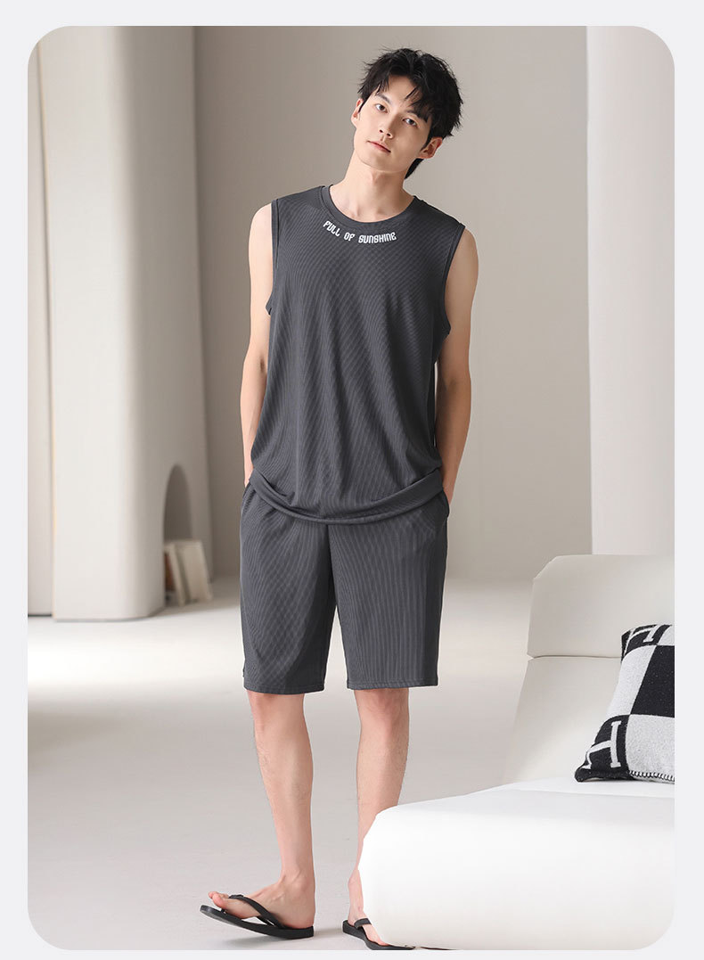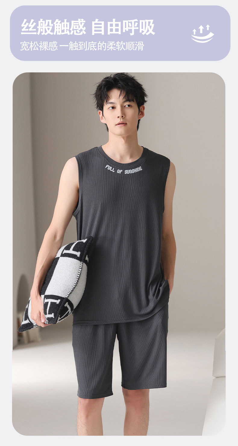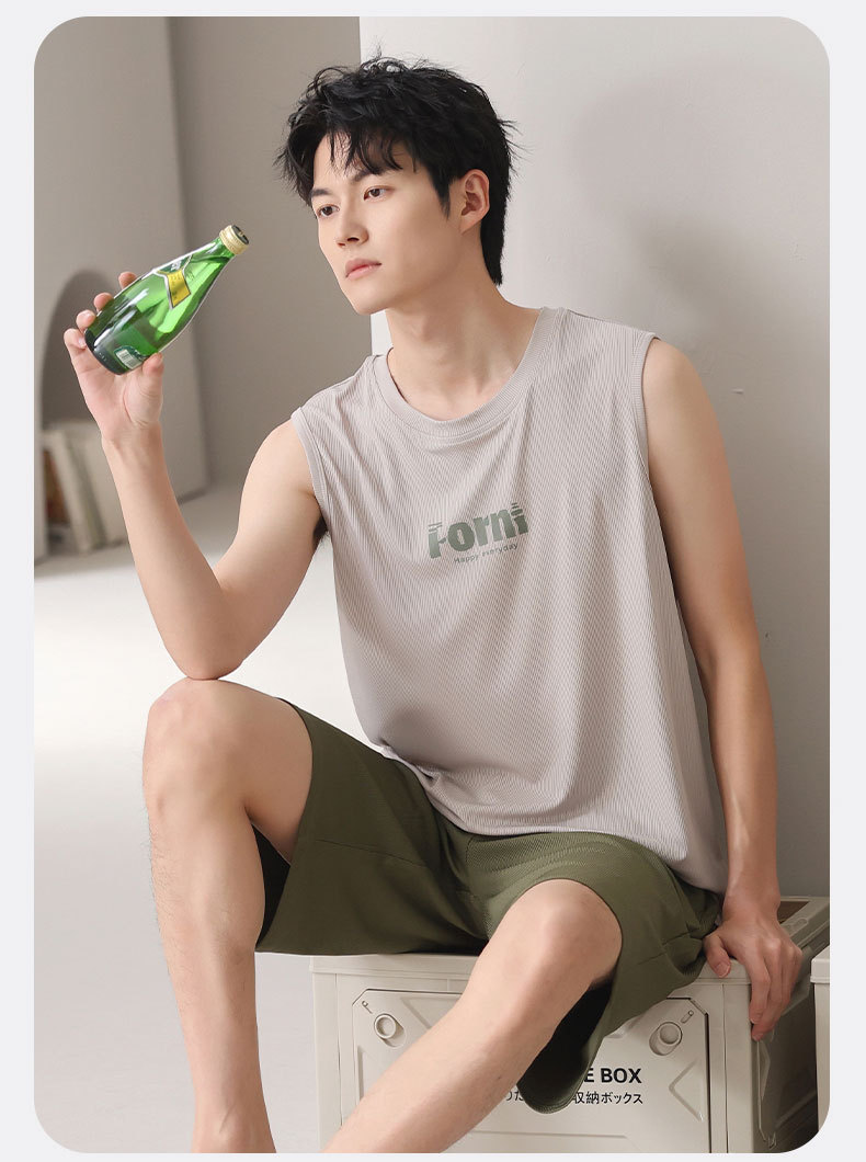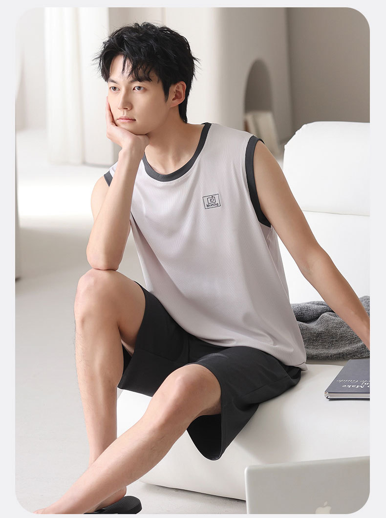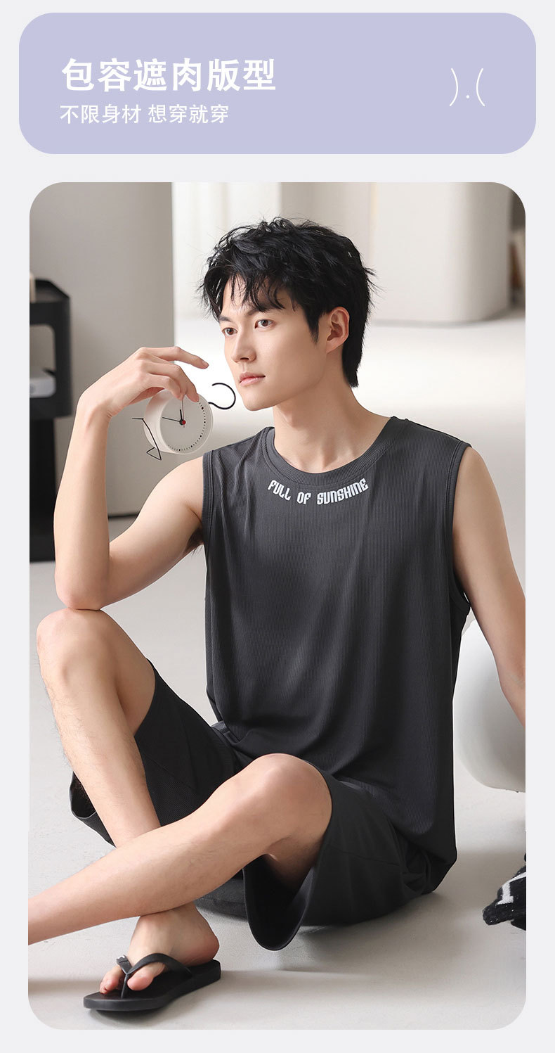 아이스 실크 스레드 남성 잠옷 여름 얇은 라운드 넥 조끼 반바지 청소년 캐주얼 루즈 핫 스타일 홈웨어