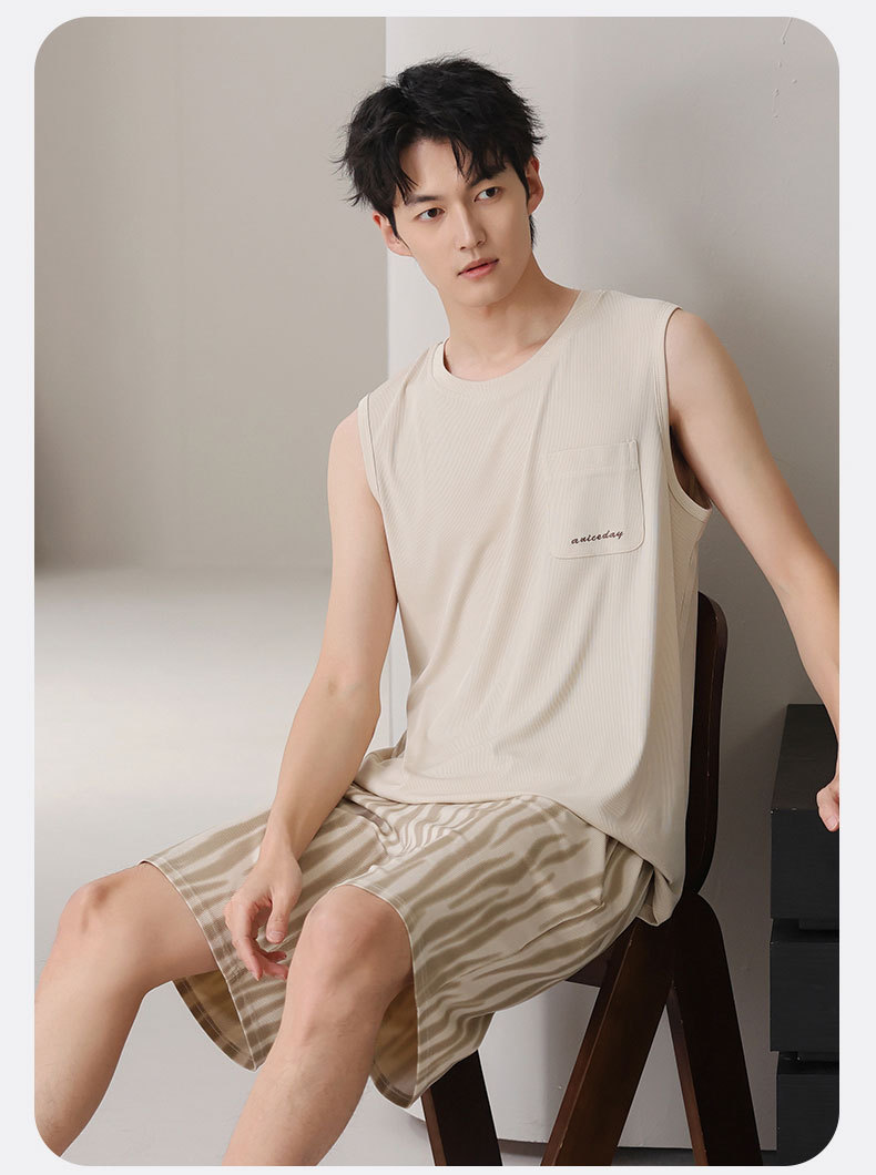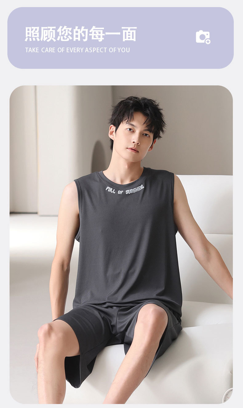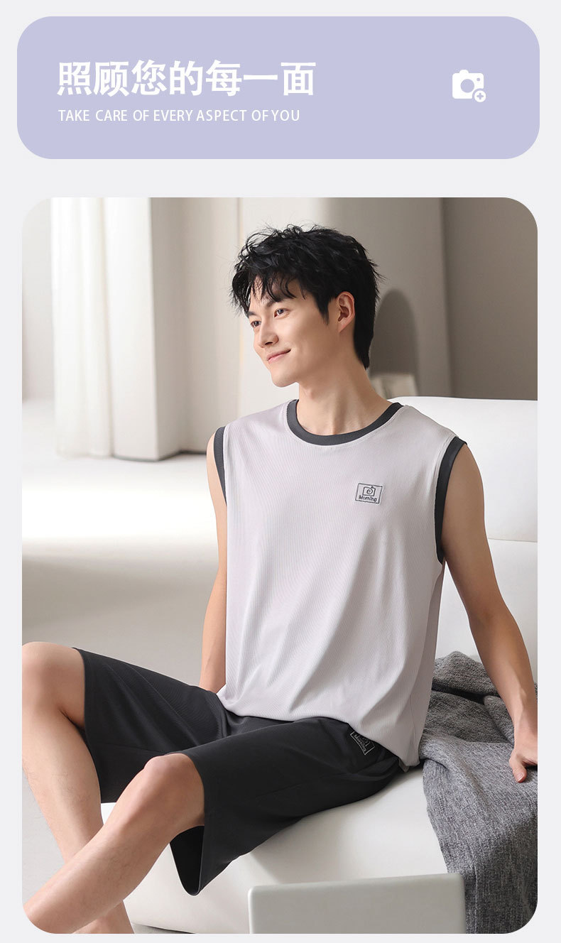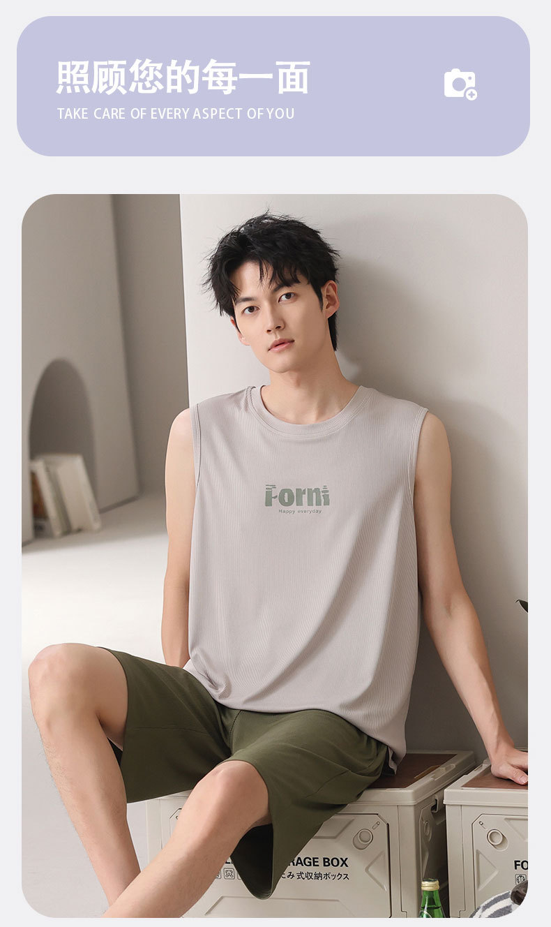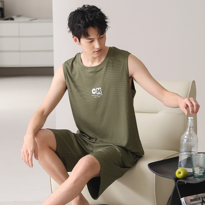 아이스 실크 스레드 남성 잠옷 여름 얇은 라운드 넥 조끼 반바지 청소년 캐주얼 루즈 핫 스타일 홈웨어