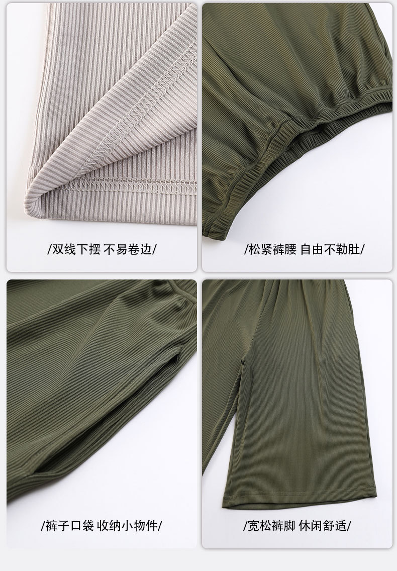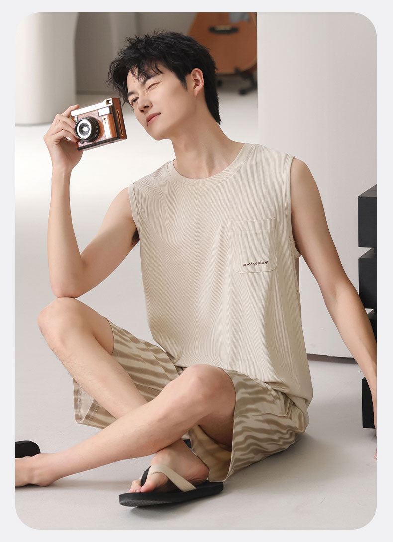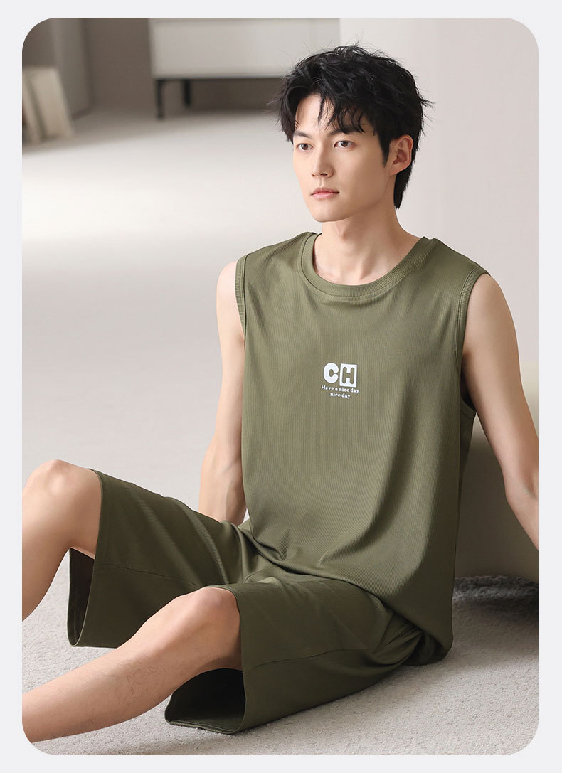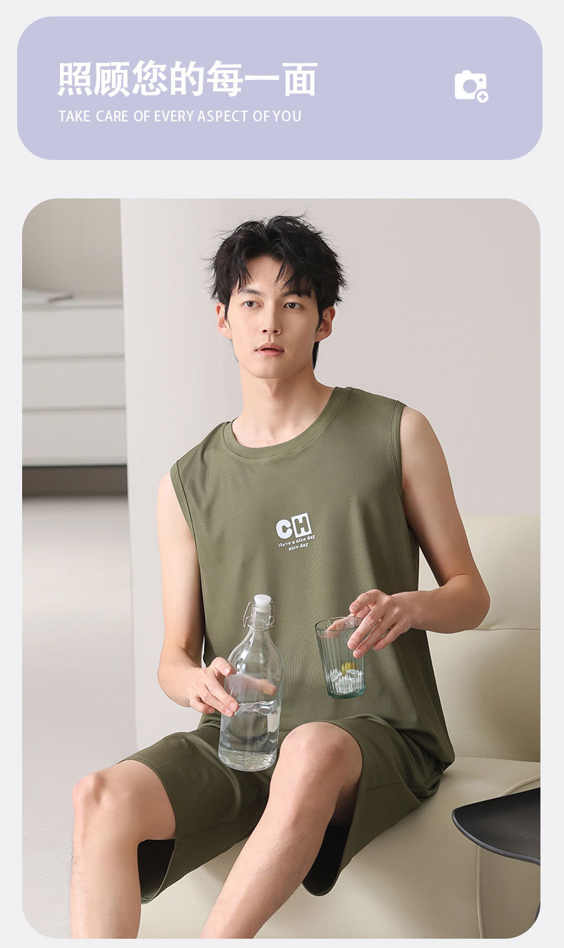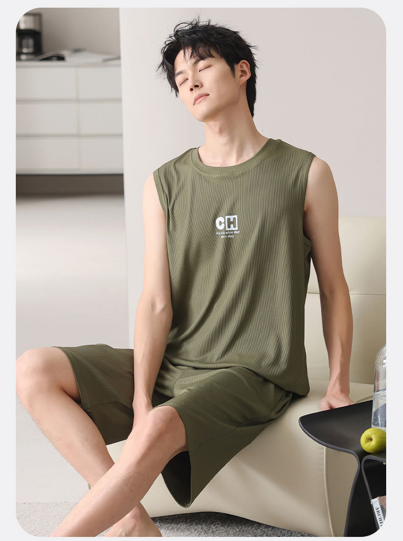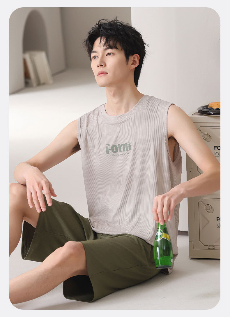 아이스 실크 스레드 남성 잠옷 여름 얇은 라운드 넥 조끼 반바지 청소년 캐주얼 루즈 핫 스타일 홈웨어