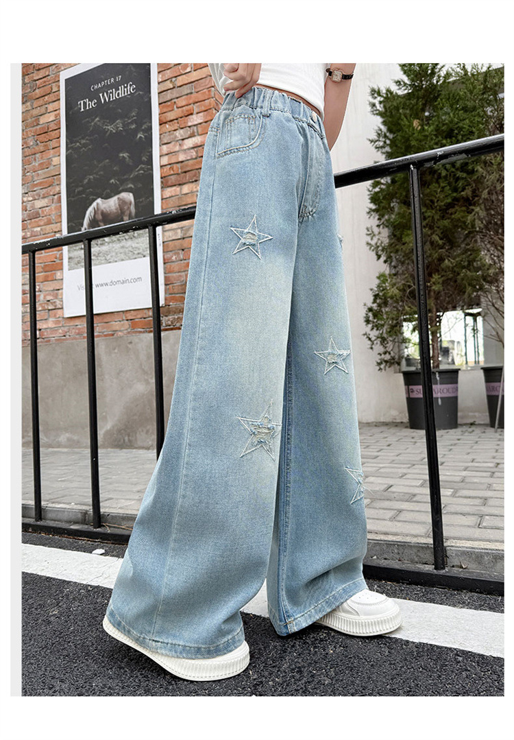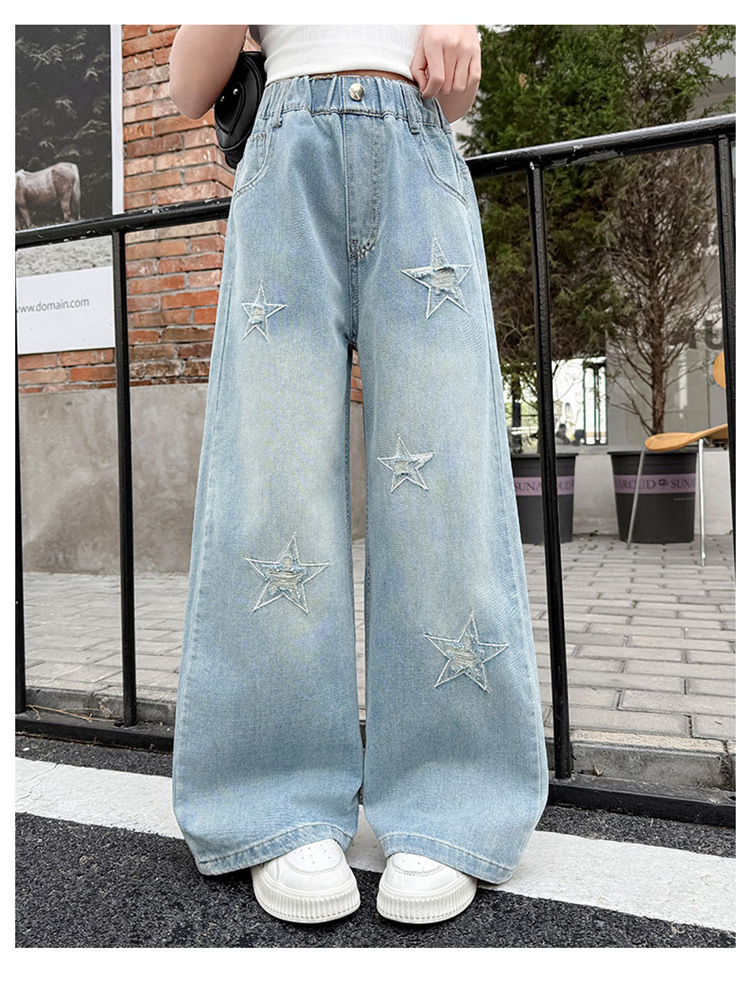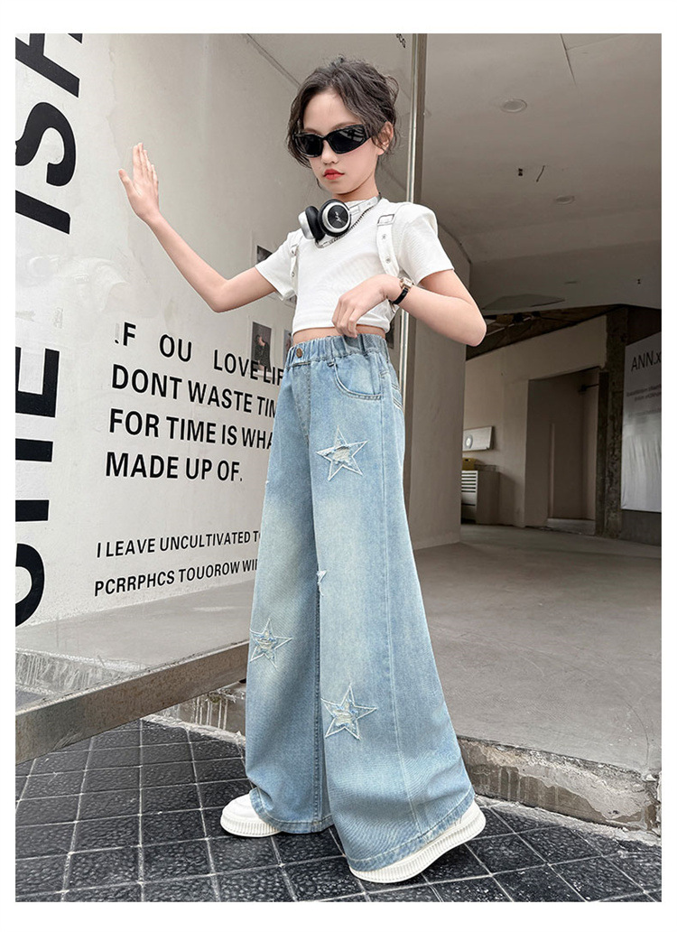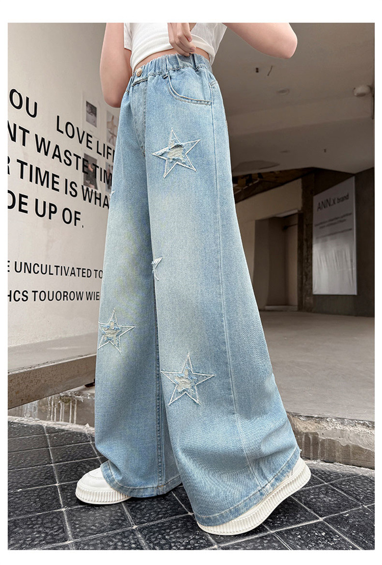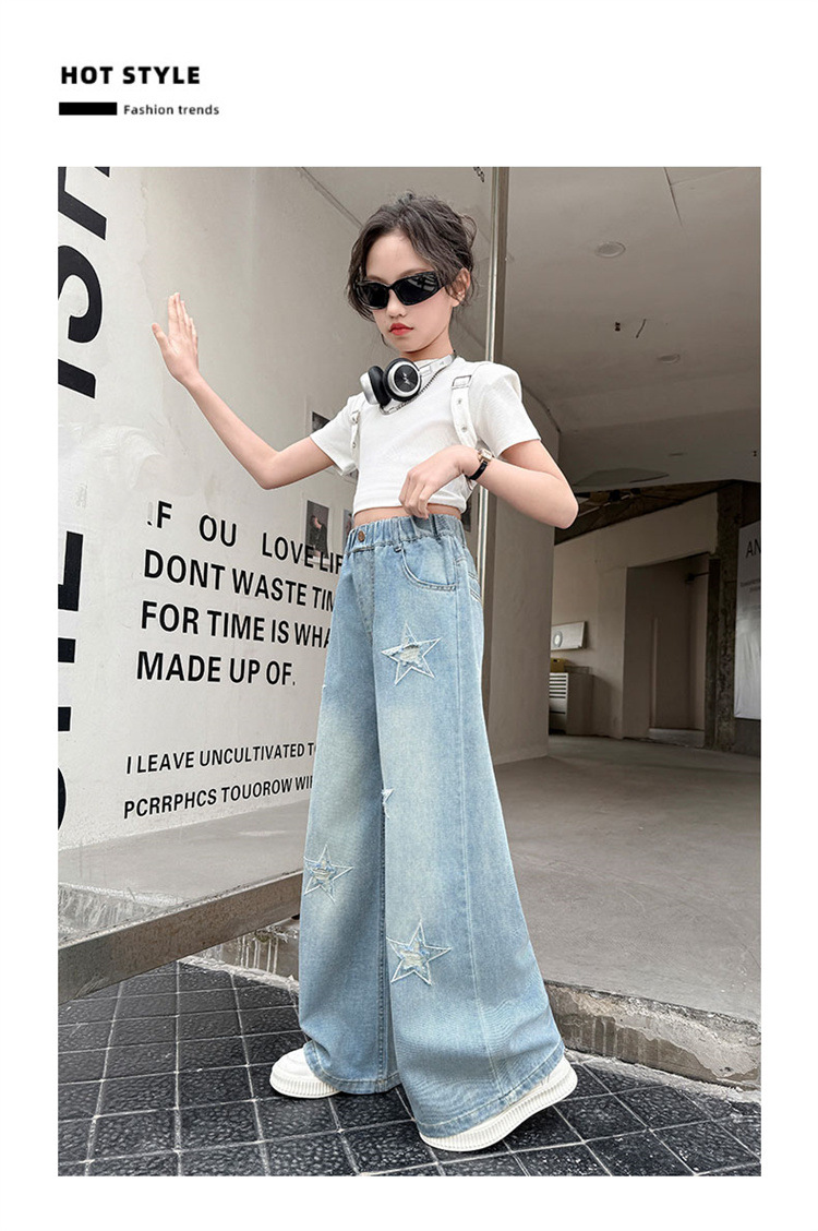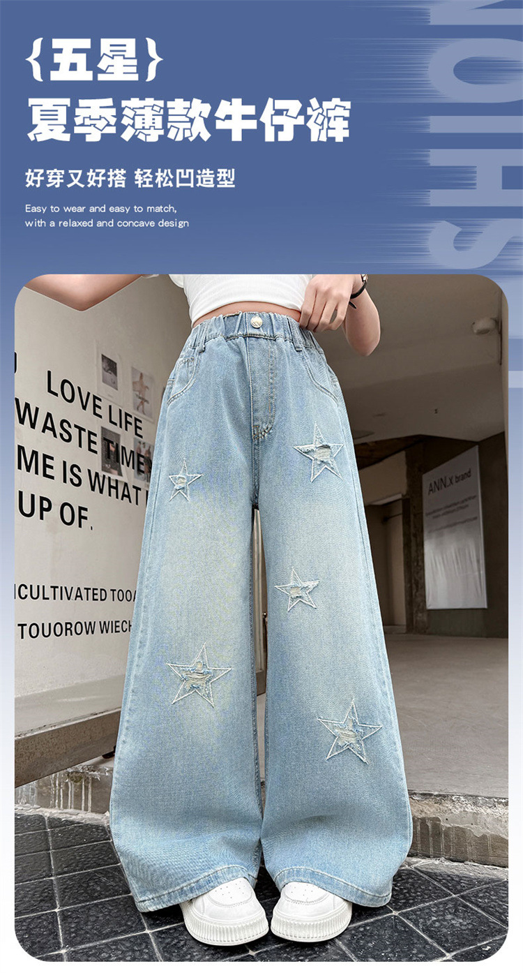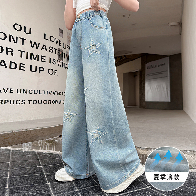여자 여름 청바지 2025 새로운 어린이 패션 캐주얼 바지 여자 여름 한국 스타일 와이드 레그 팬츠 유행스토어 가기