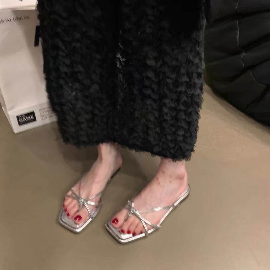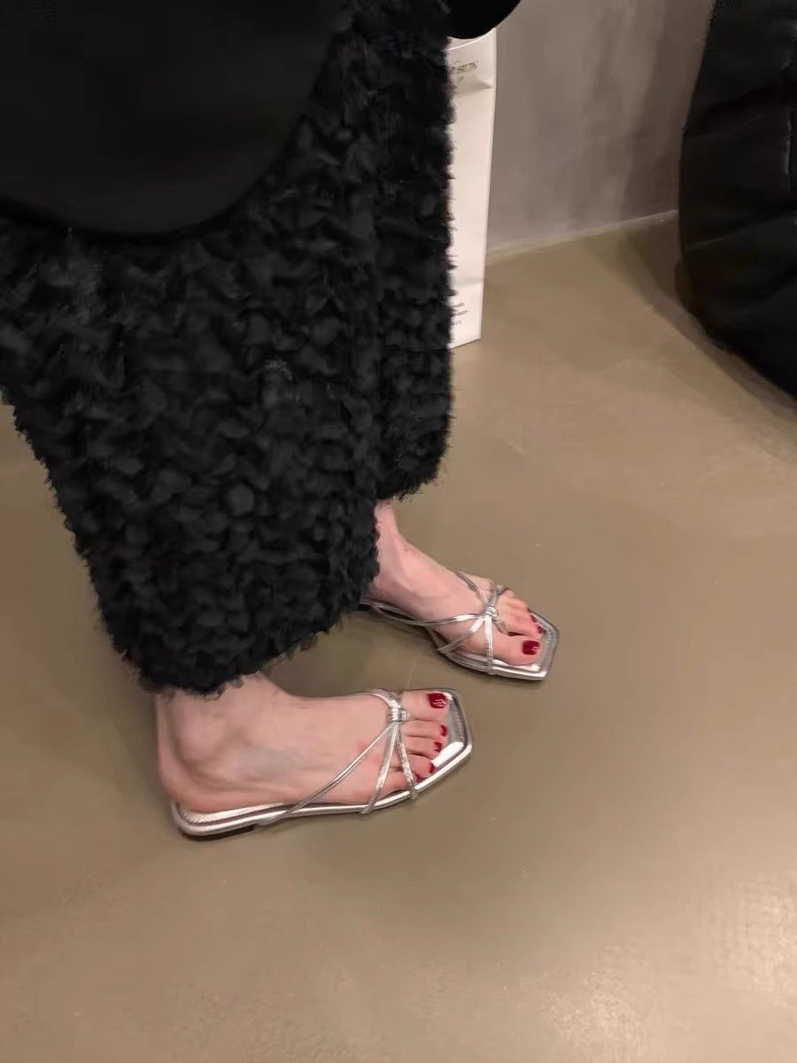 2025 새로운 프랑스 스타일 플랫 플립 플롭 신발 요정 신발 여성 여름 해변 샌들 실버 샌들