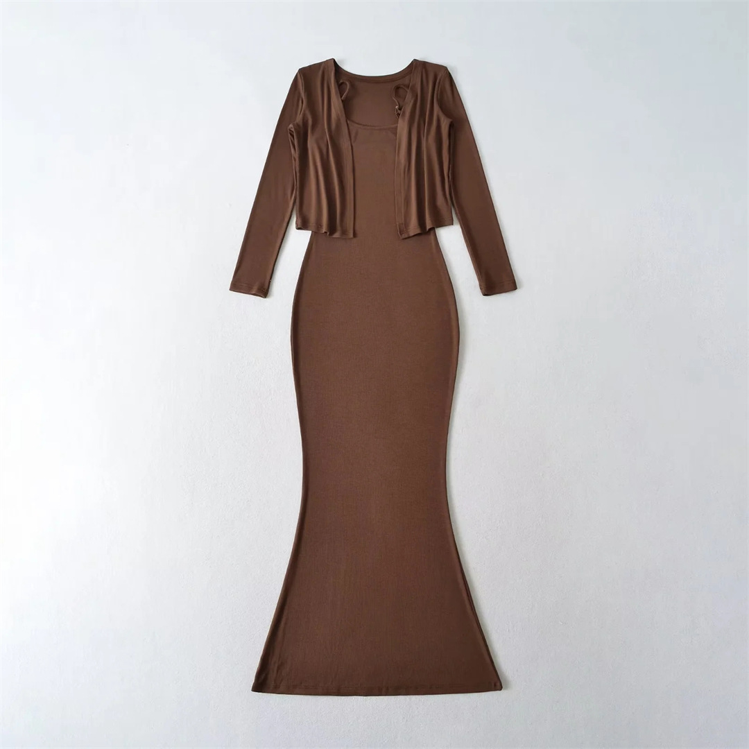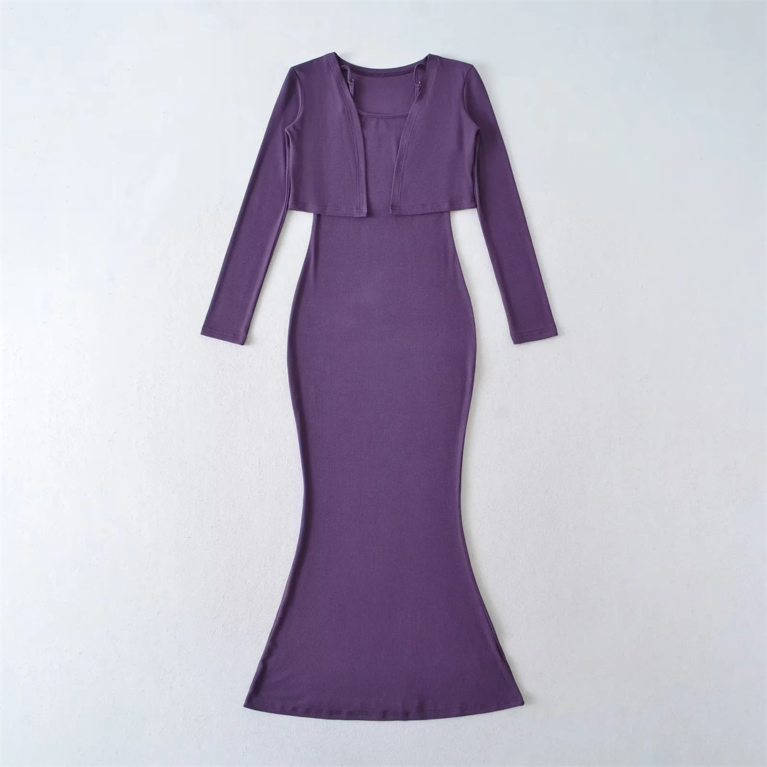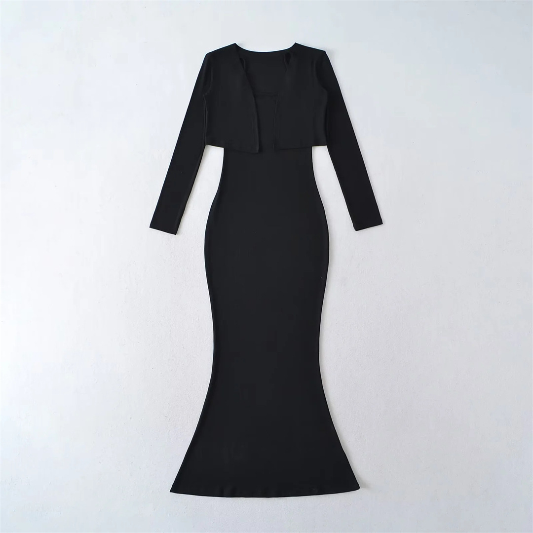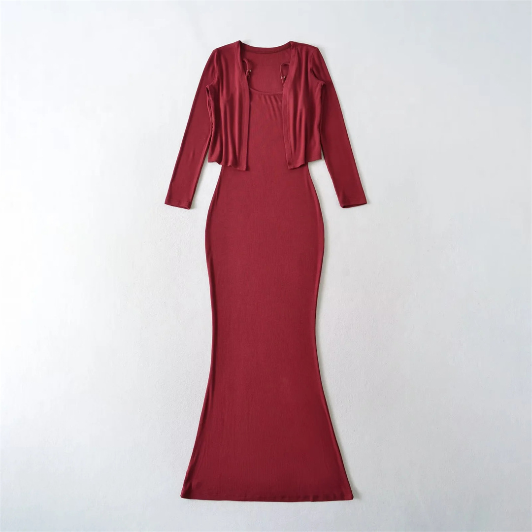순수한 욕망 섹시한 탄성 슬림핏 힙 커버 피쉬테일 롱 스커트 여성용 버튼리스 긴팔 숄 탑 투피스 세트