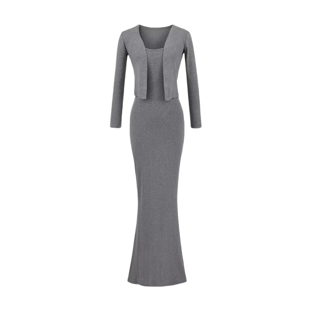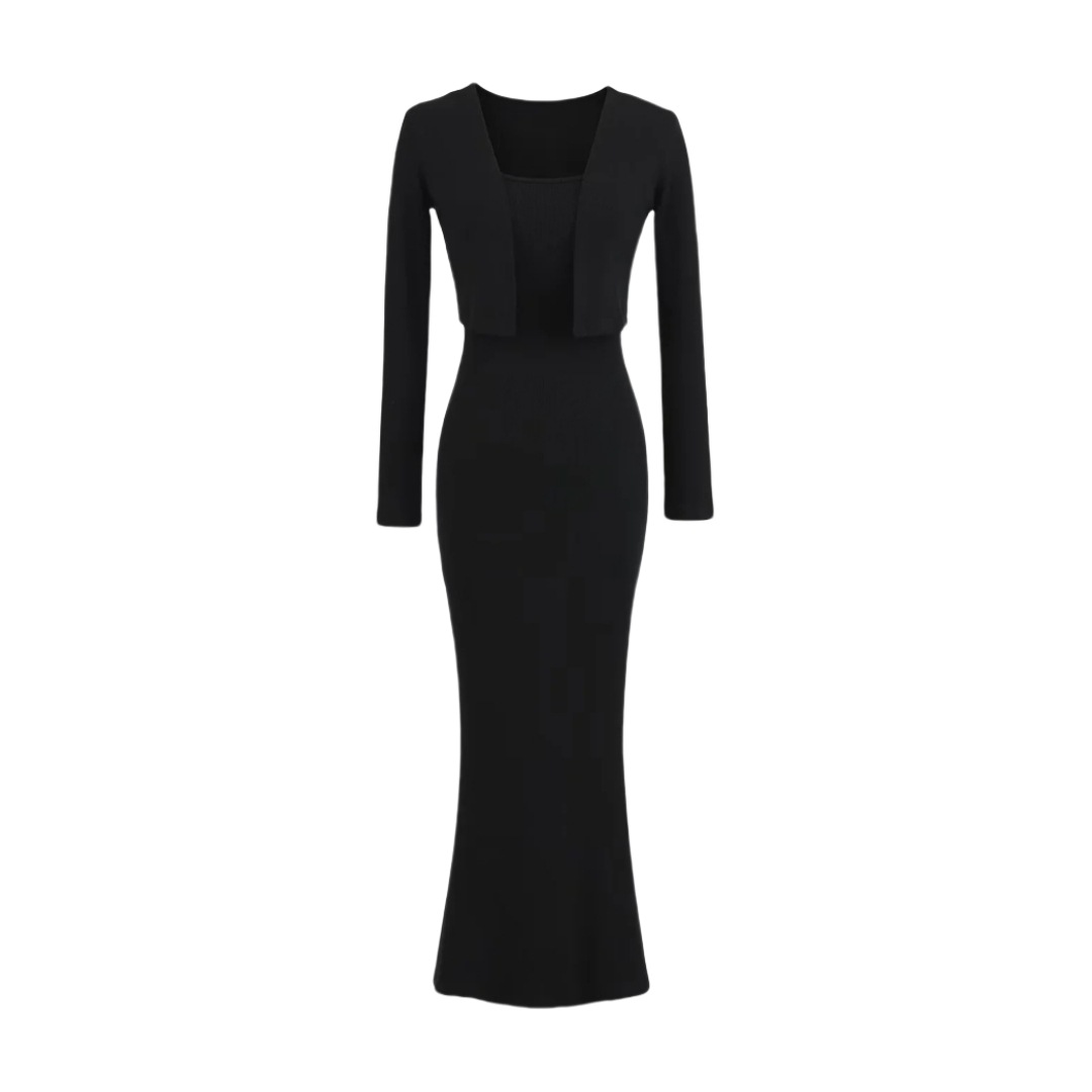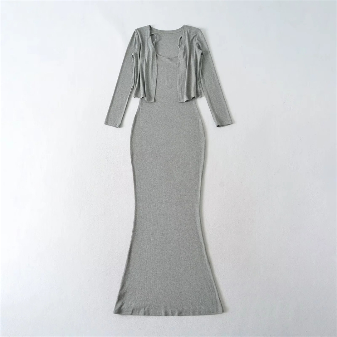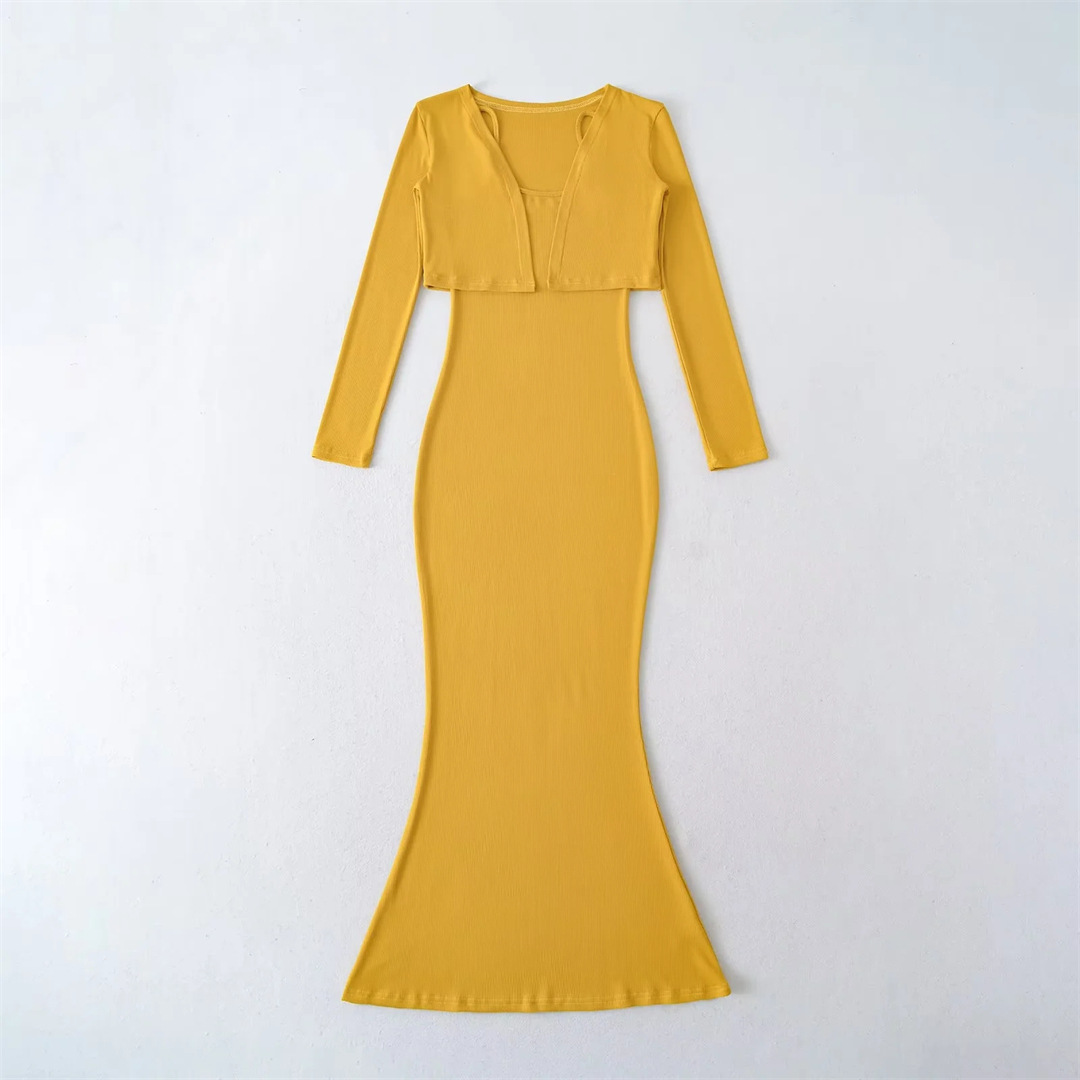 순수한 욕망 섹시한 탄성 슬림핏 힙 커버 피쉬테일 롱 스커트 여성용 버튼리스 긴팔 숄 탑 투피스 세트