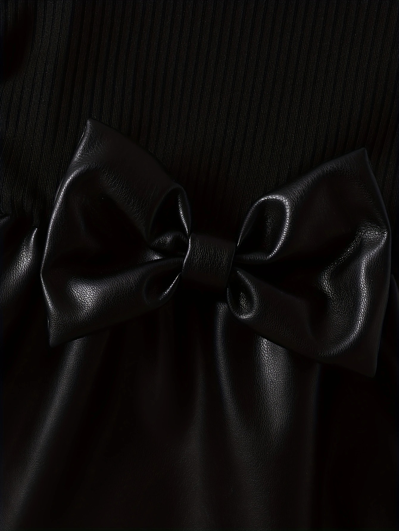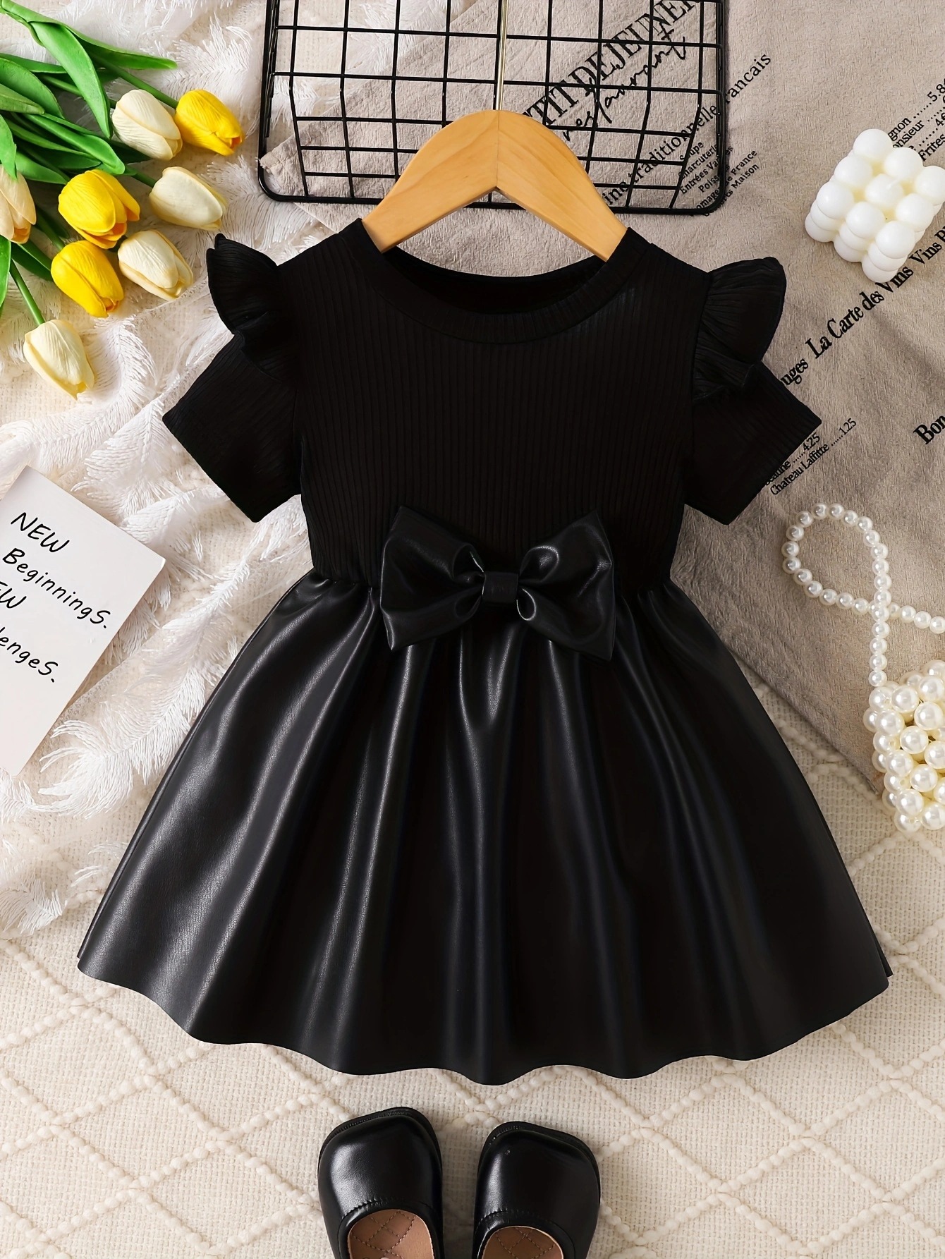 국경 간 INS 유아 및 어린 소녀 여름 스타일 플라잉 슬리브 라운드 넥 풀오버 보우 스플 라이스 가죽 스커트 드레스