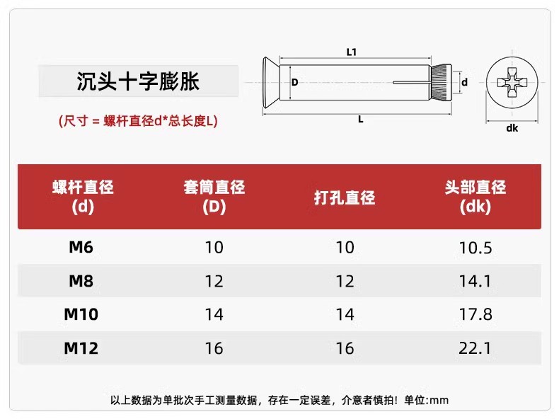 국가 표준 304/201 스테인레스 스틸 크로스 카운터 헤드 내부 확장 나사 플랫 헤드 볼트 내부 폭발 MM6M8M10M12