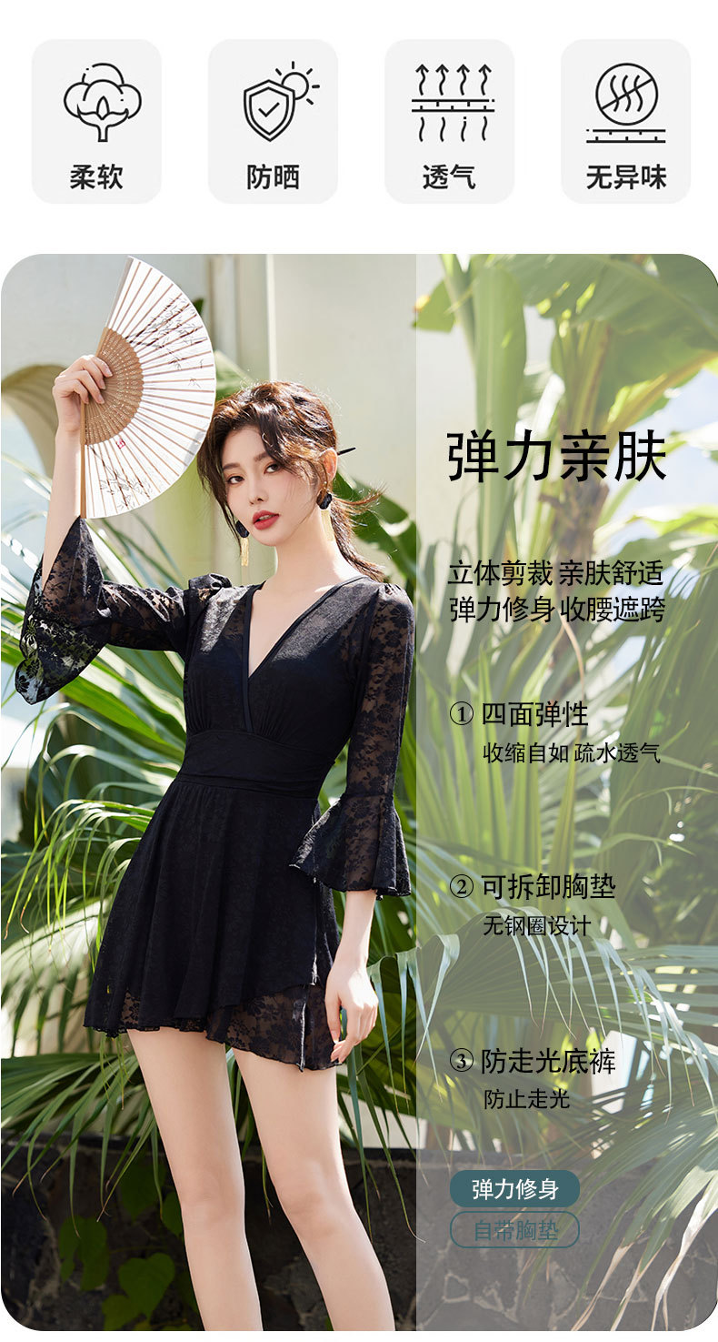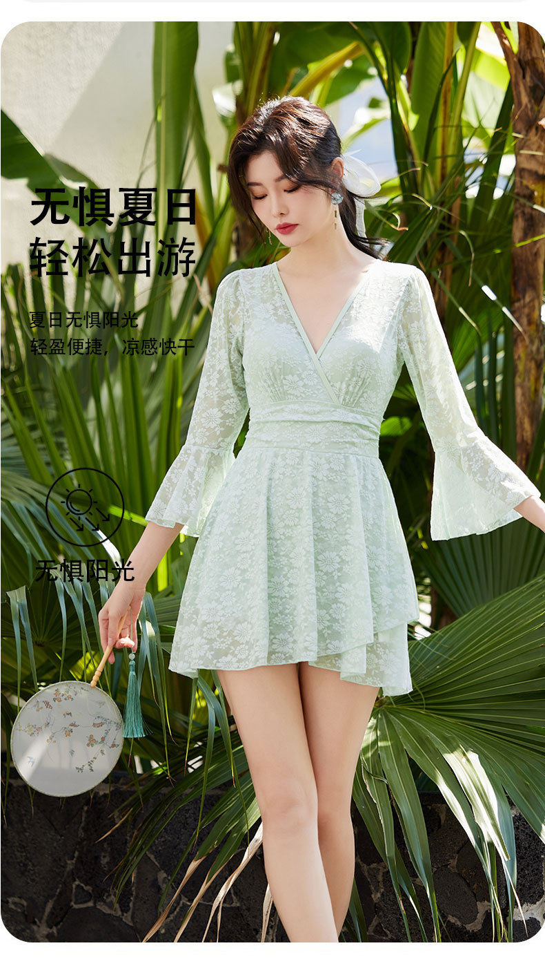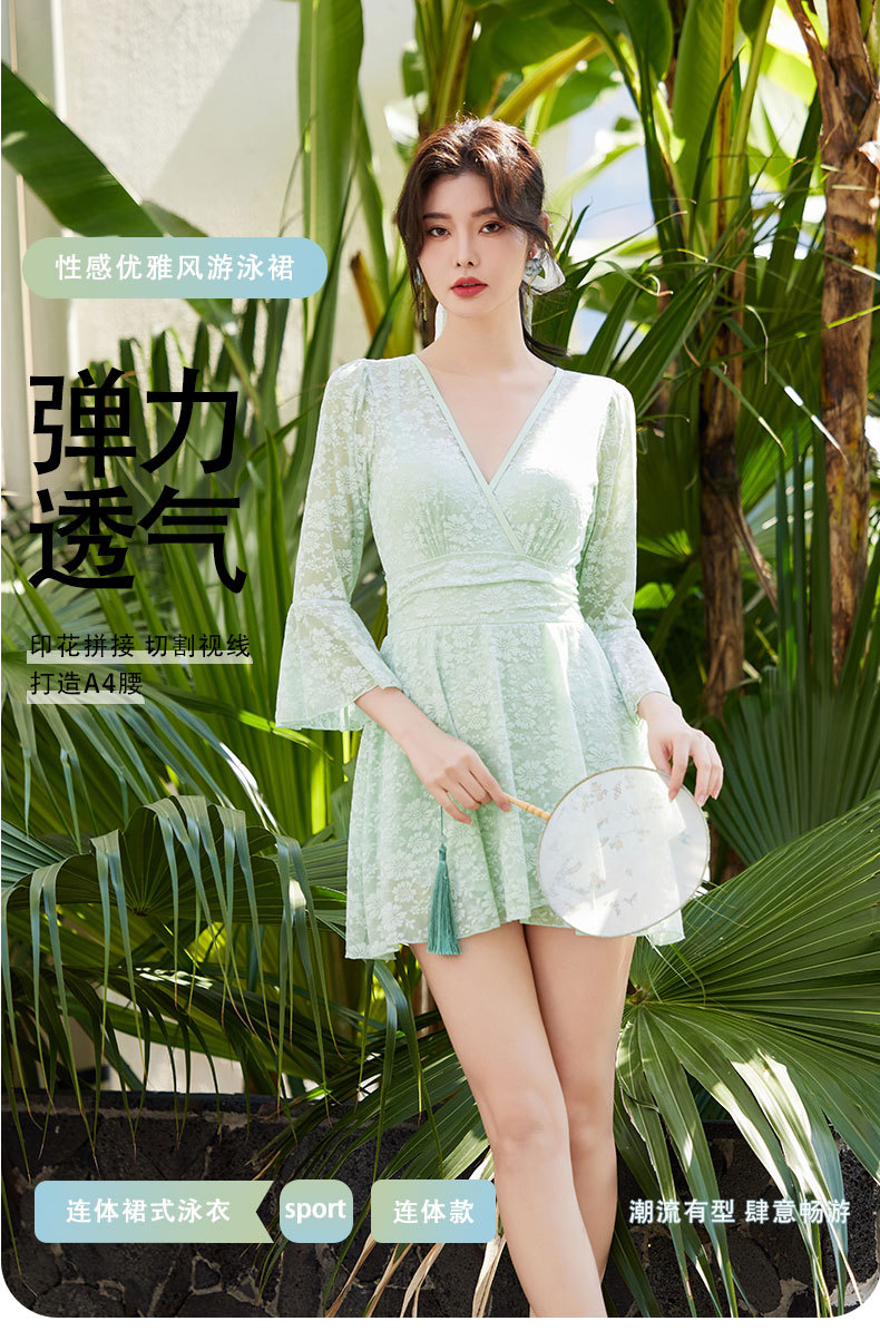 살짝 뚱뚱한 여성 원피스 수영복 스커트 스타일 우아하고 보수적이며 슬림하고 다리가 길어지는 해변 휴가 긴팔 자외선 차단 수영복