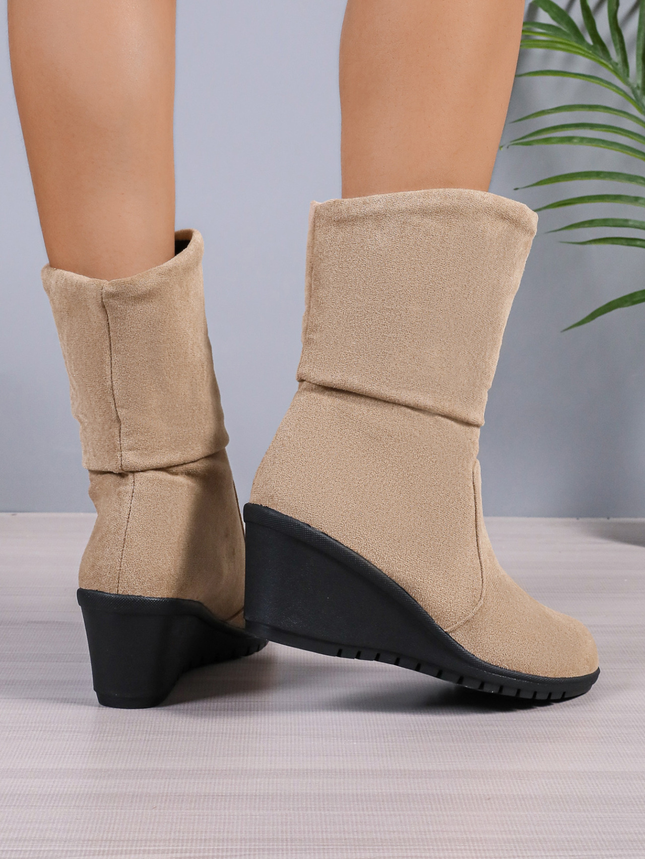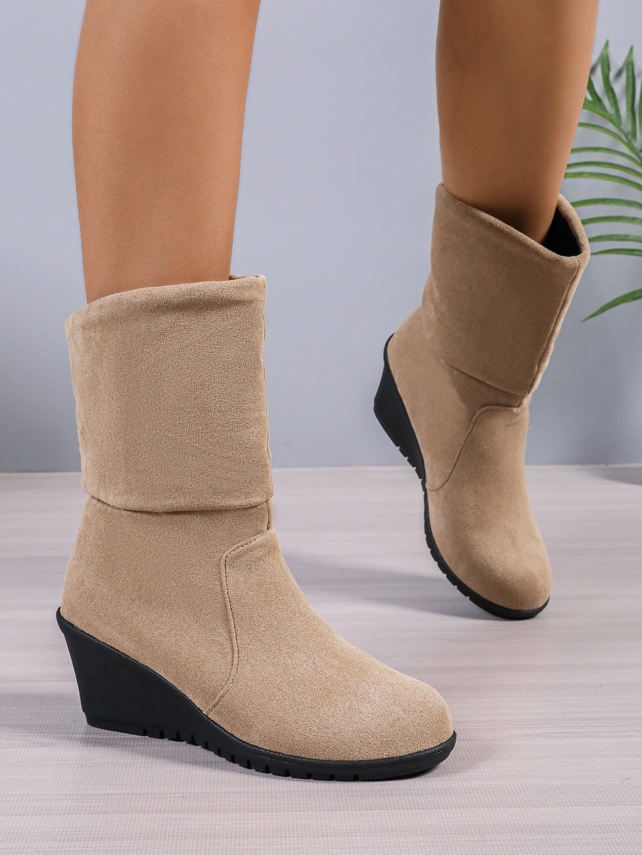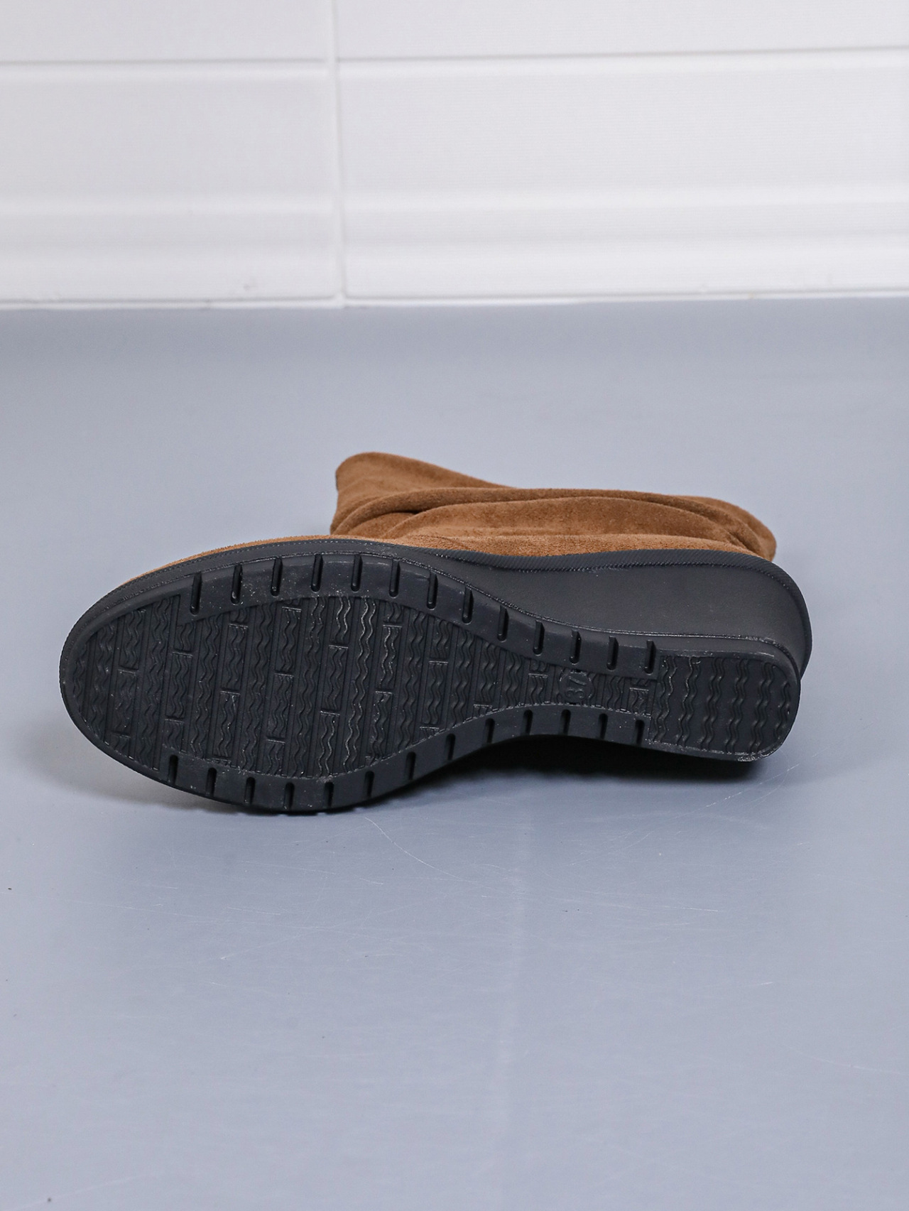 2025년 트렌디한 여성용 가을 겨울 대형 부츠, 라운드 토 단일 튜브 플랫 웨지 힐, 반투명 주름진 검정색 유럽 및 미국 여성용 미드 튜브 부츠