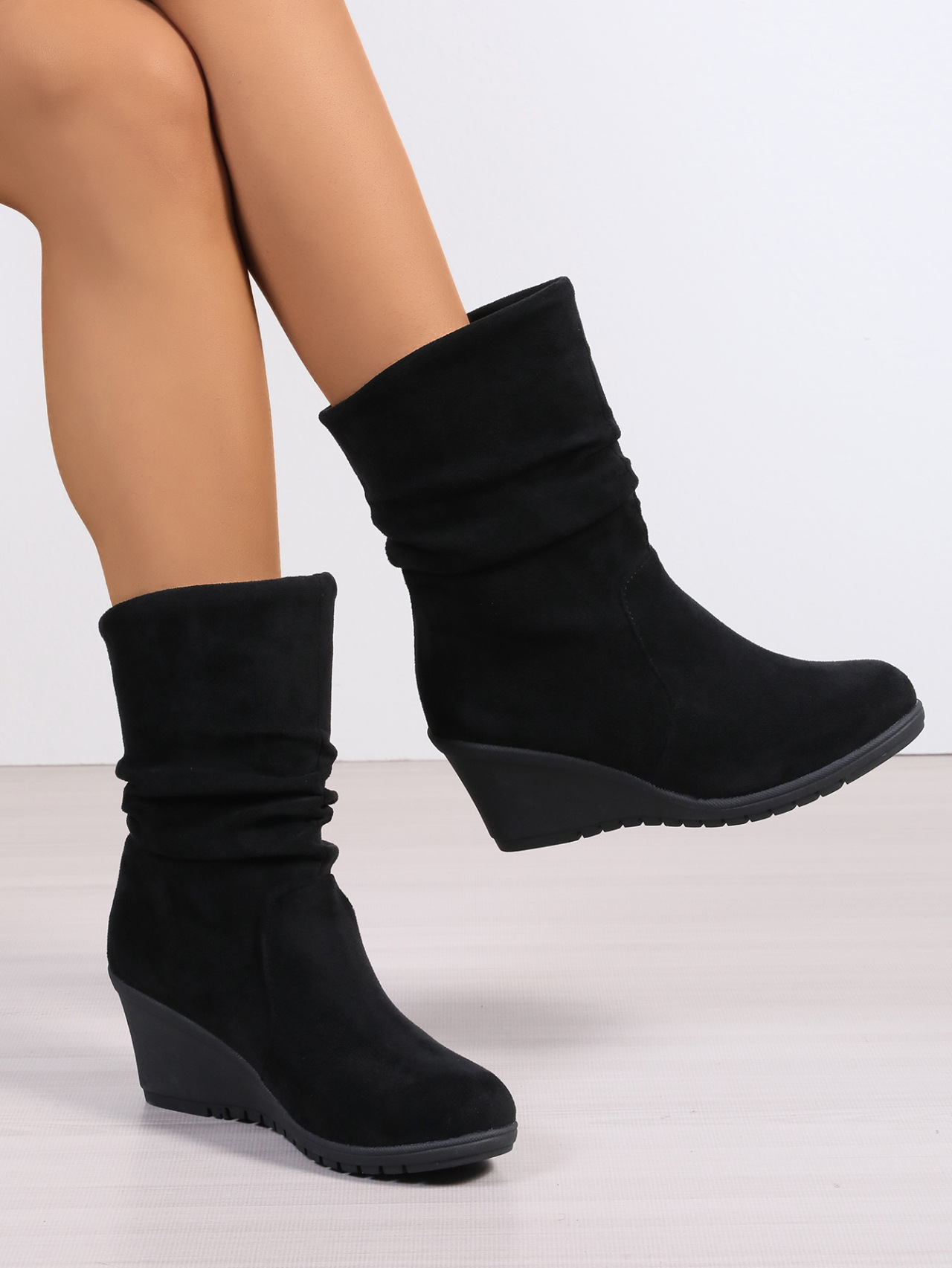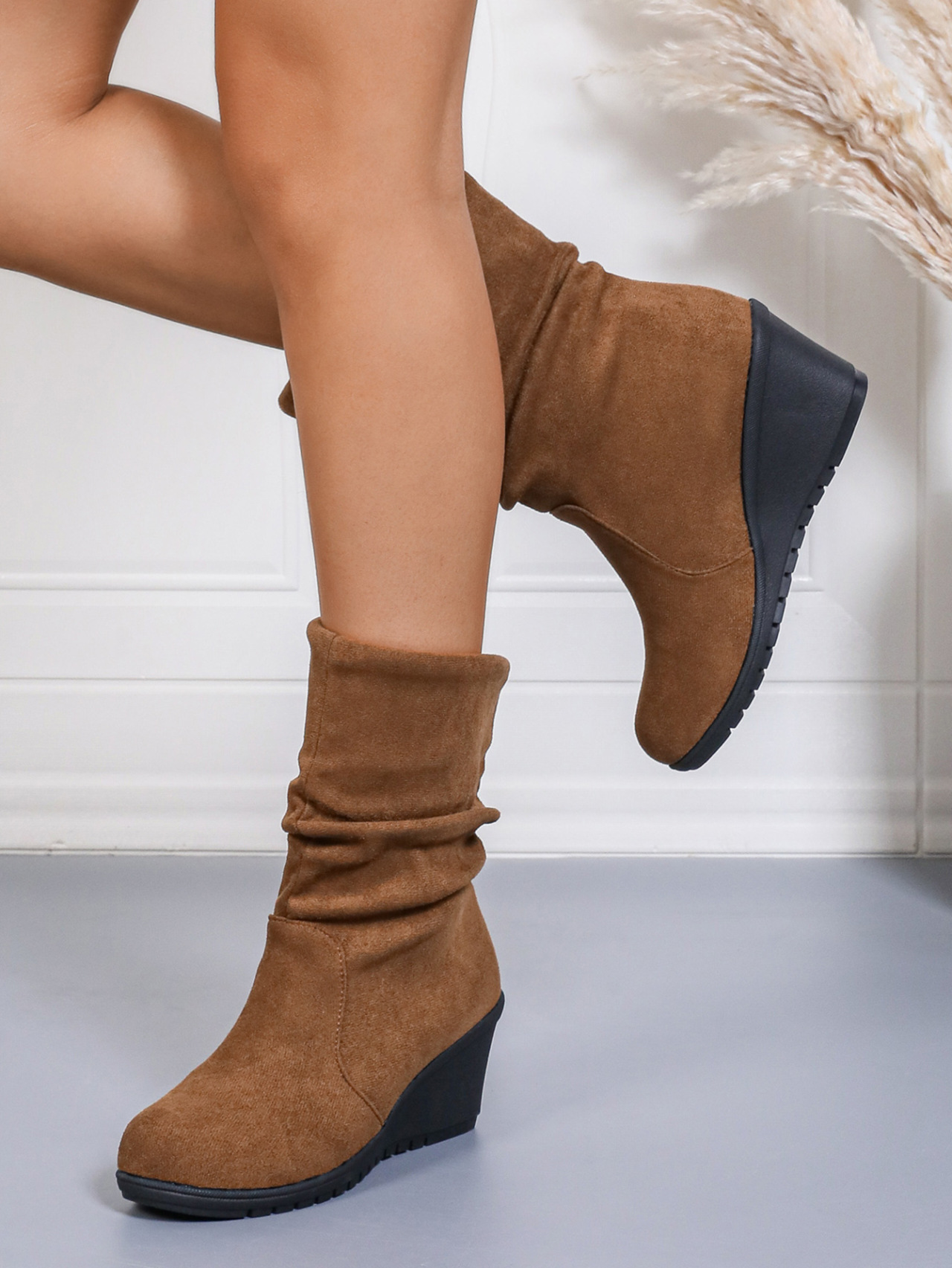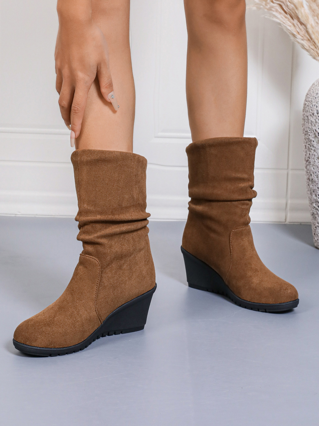 2025년 트렌디한 여성용 가을 겨울 대형 부츠, 라운드 토 단일 튜브 플랫 웨지 힐, 반투명 주름진 검정색 유럽 및 미국 여성용 미드 튜브 부츠