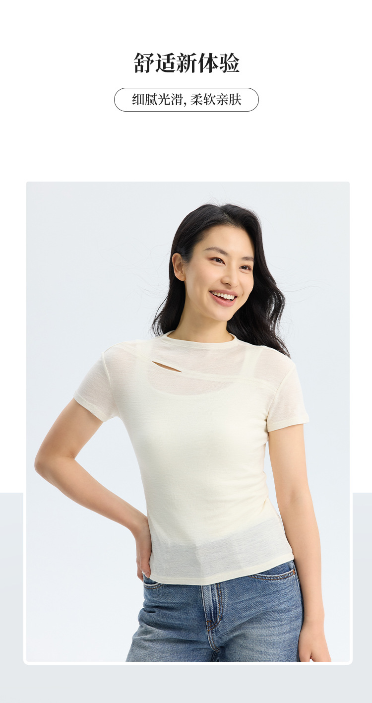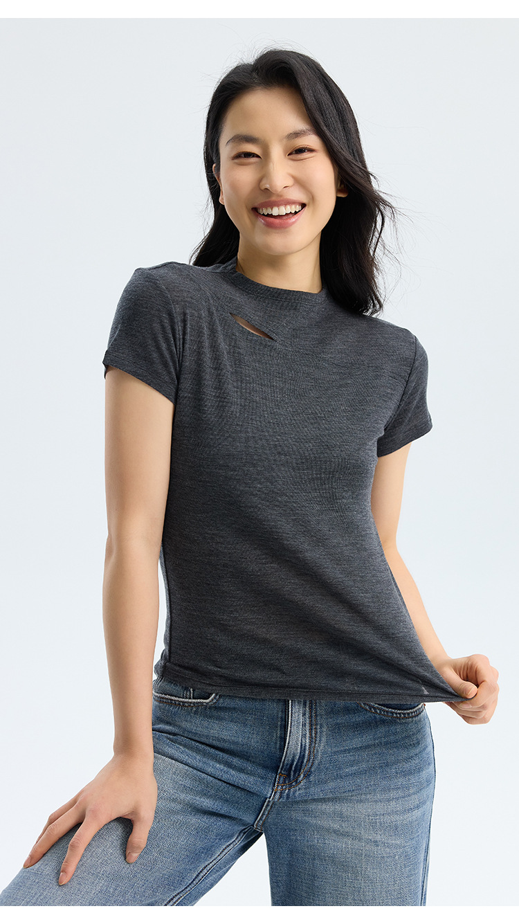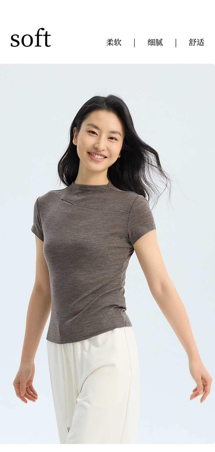여성용 퓨어 울 반소매 작은 반높이 칼라 패셔너블 슬림 핏 티셔츠 여성용 뉴 여름 올 매치 슬리밍 스킨 친화적 인 탑
