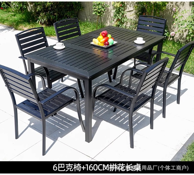 • [블랙] 플라스틱 목재 벅 의자 6개 + 150*90 대형 판자 긴 테이블
