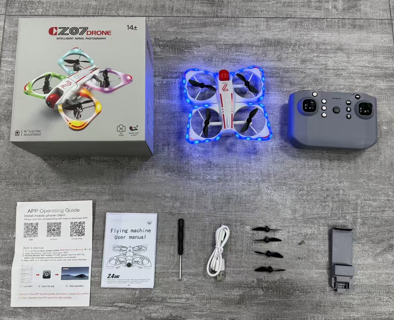 7、无人机自带WiFi信号、通过智能手机连接专用APP进行操控(一键起飞/ 一键降落/ 上升/下降/ 左/右转向/360°翻滚/无头模式/快慢档/拍照/录像/切换双摄像头/人脸识别自动拍照/重力感应/轨迹飞行/)