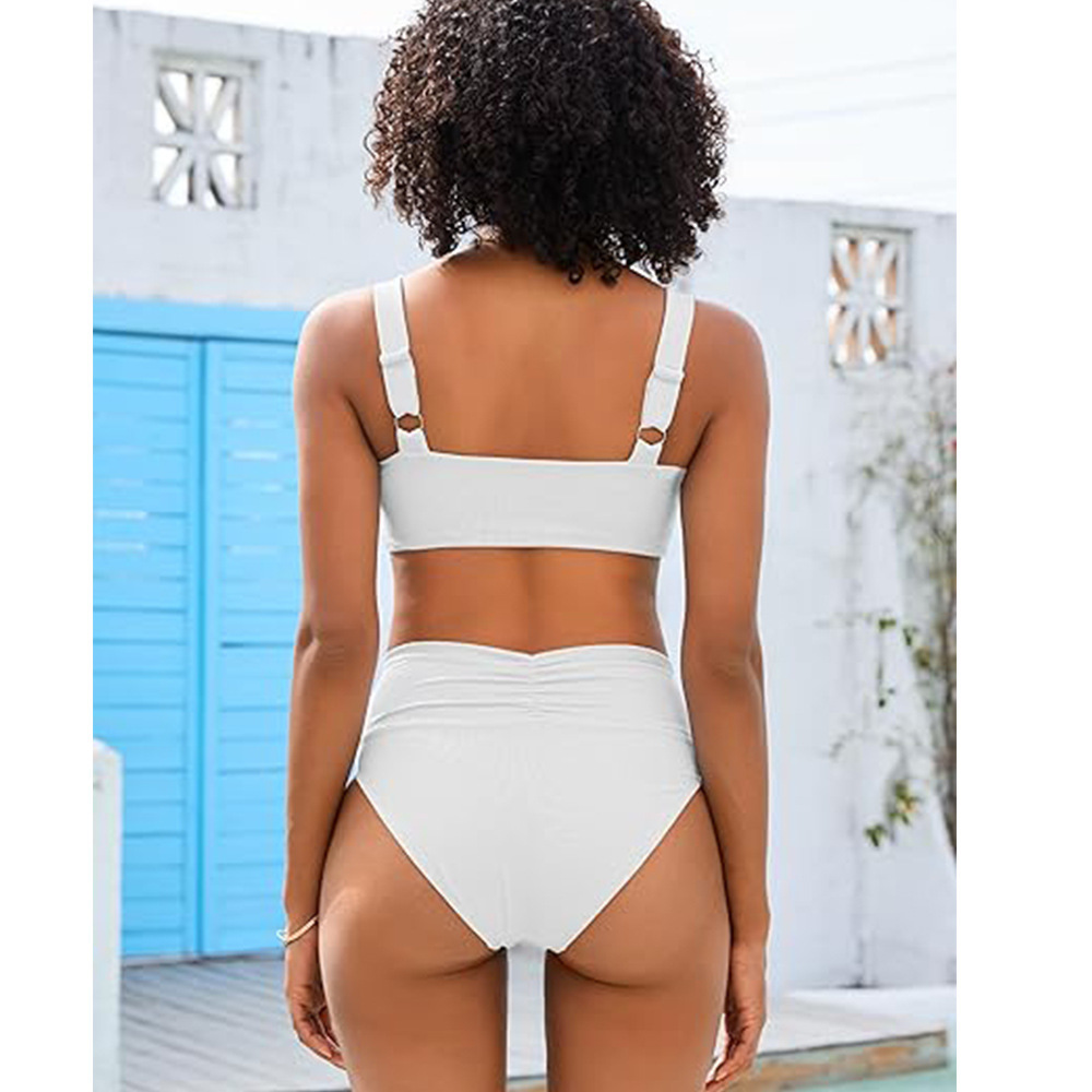 2025 유럽 및 미국 수영복 크로스보더 스플릿 비키니 주름진 넓은 어깨끈 조절 가능한 레드 화이트 하이웨이스트스토어 가기