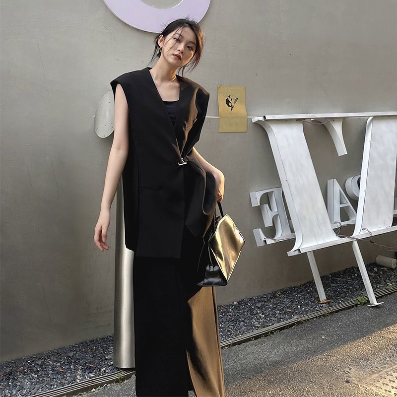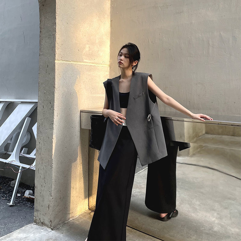 여름 새로운 디자인 칼라리스 조끼 정장 조끼 여성 한국 스타일 느슨한 중간 길이 민소매 재킷스토어 가기