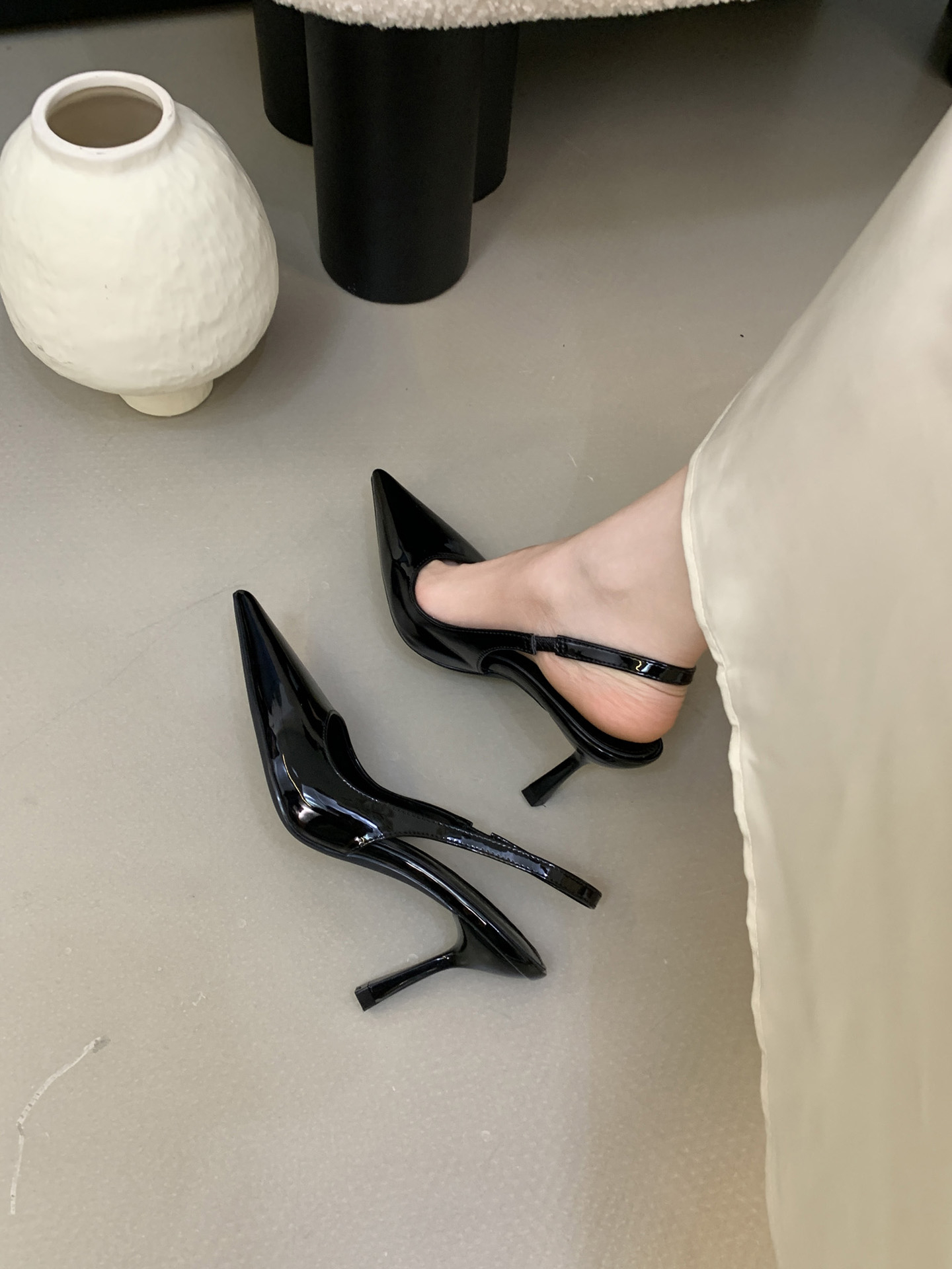 뾰족한 하이힐 여성의 새로운 틈새 신발 검은 기질 샌들 2025 여름 새로운 특허 가죽 스틸레토 샌들