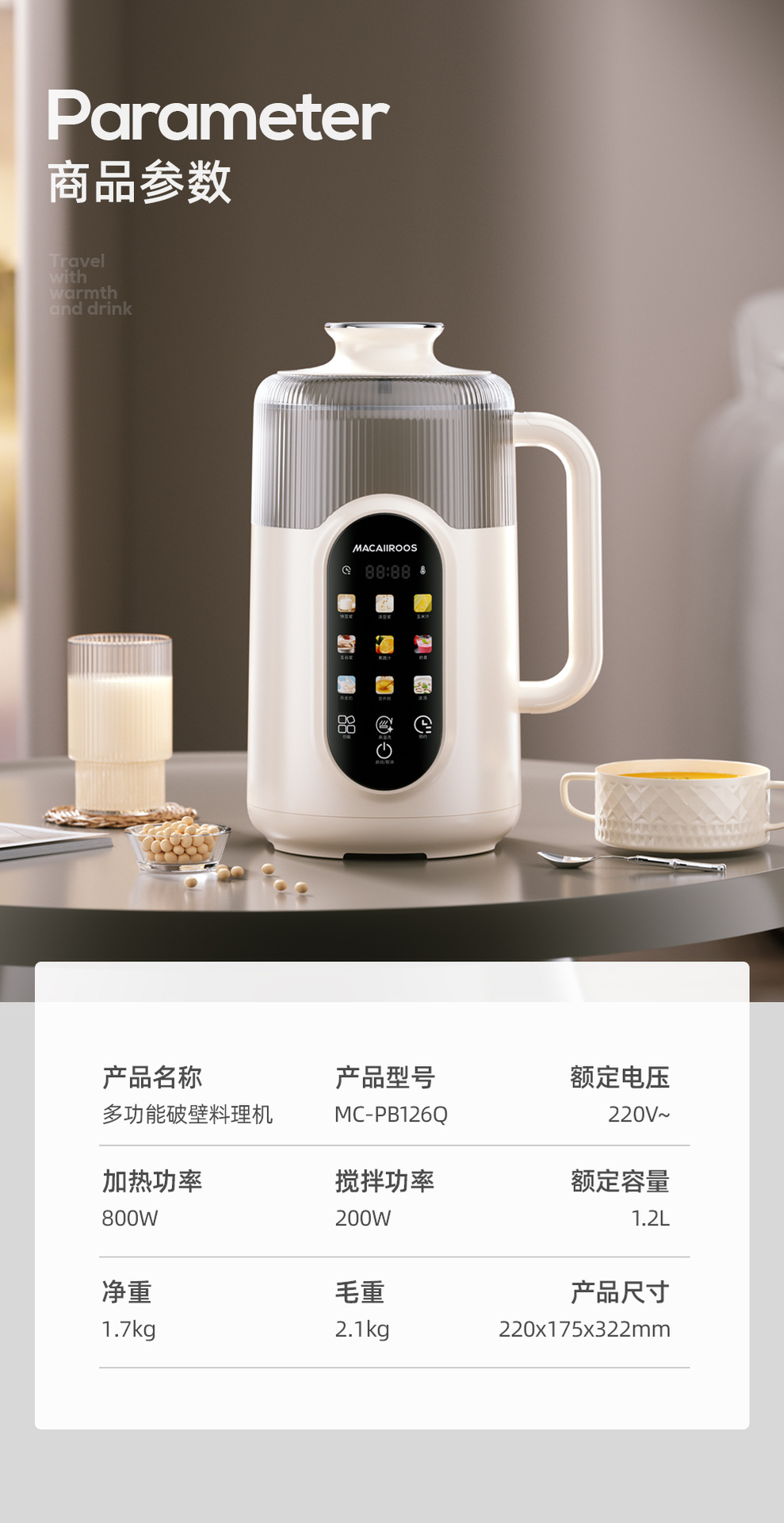 Mikaro MC-PB126Q 벽 파괴 기계 가열 가정용 완전 자동 다기능 미니 두유 기계 주스 착즙