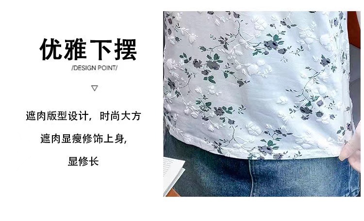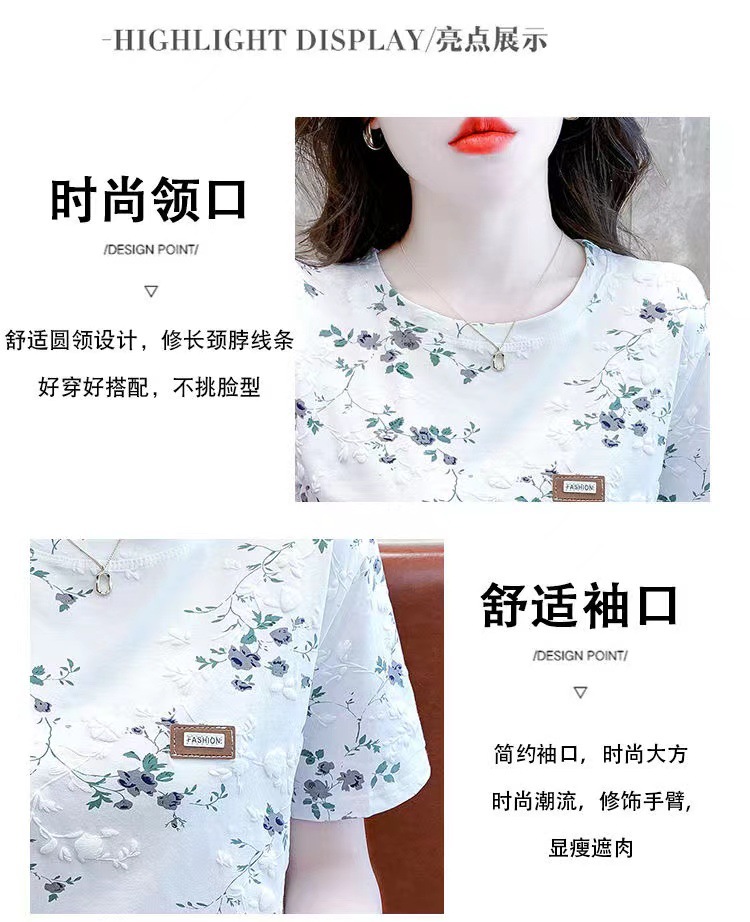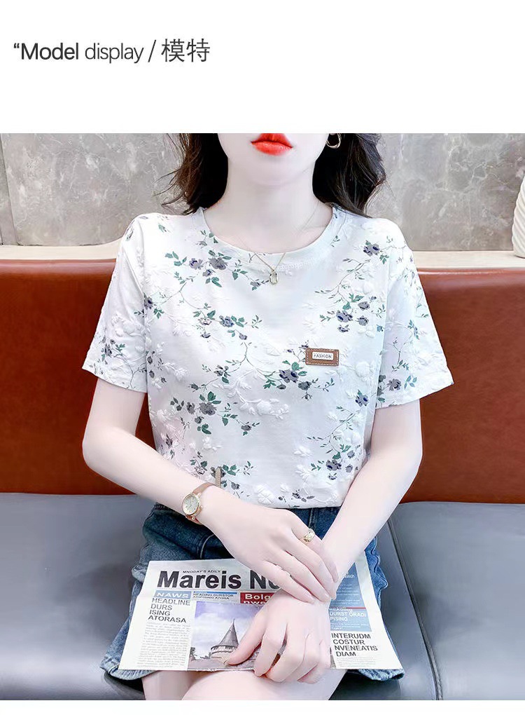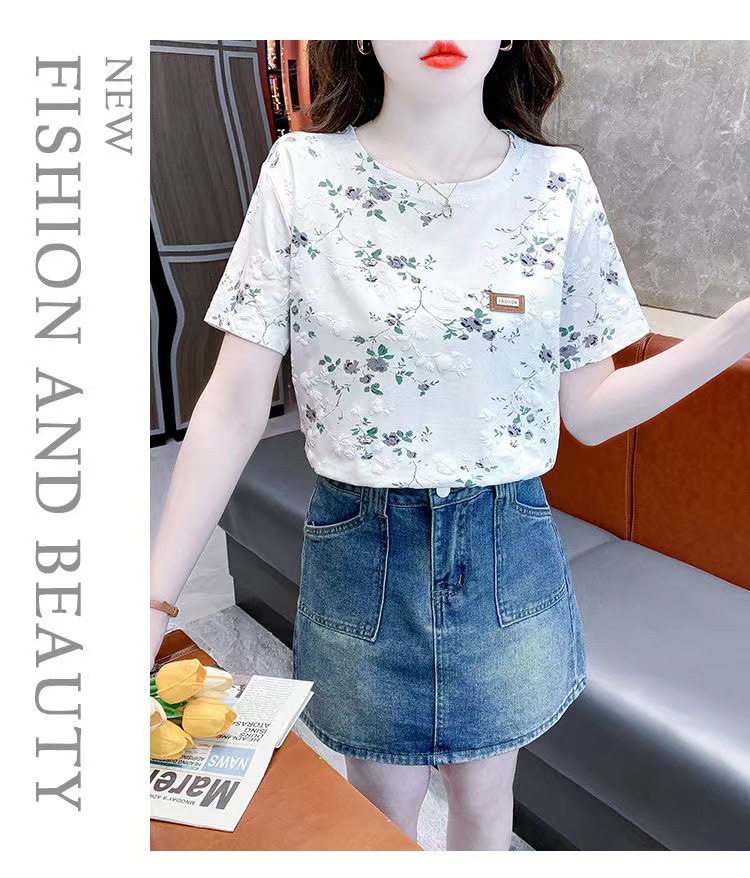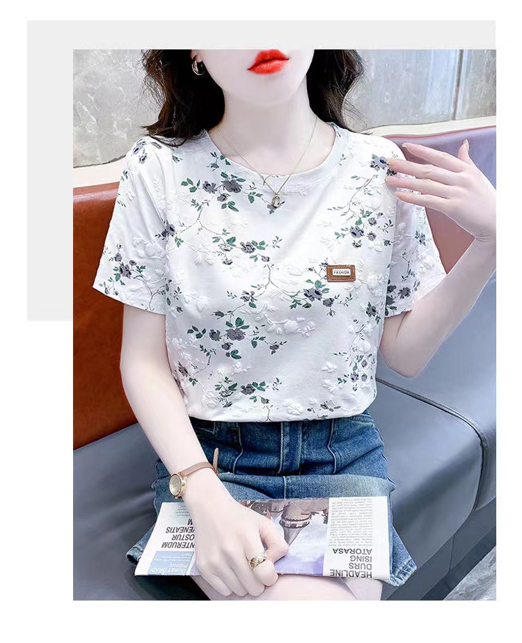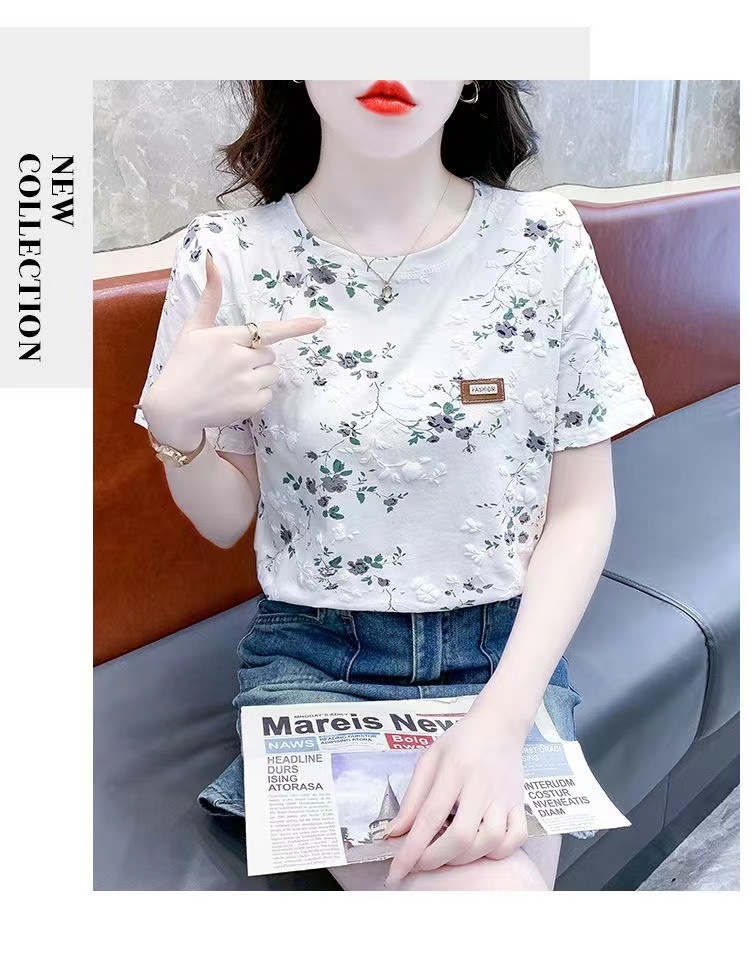 새로운 여름 여성 반팔 티셔츠 ins 오른쪽 어깨 꽃 트렌디 루즈 프린트 화이트 반팔 티셔츠 여름 핫 스타일스토어 가기