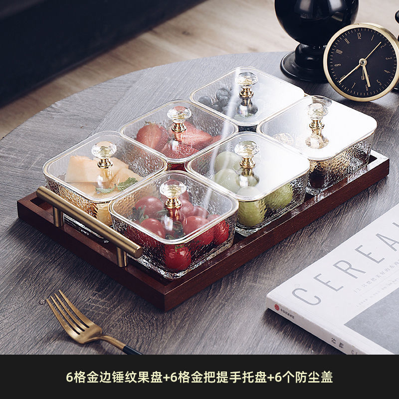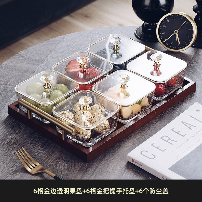 • 금테 투명 그릇 6개 + 그리드 6개 고급 원목 접시 + 뚜껑 6개