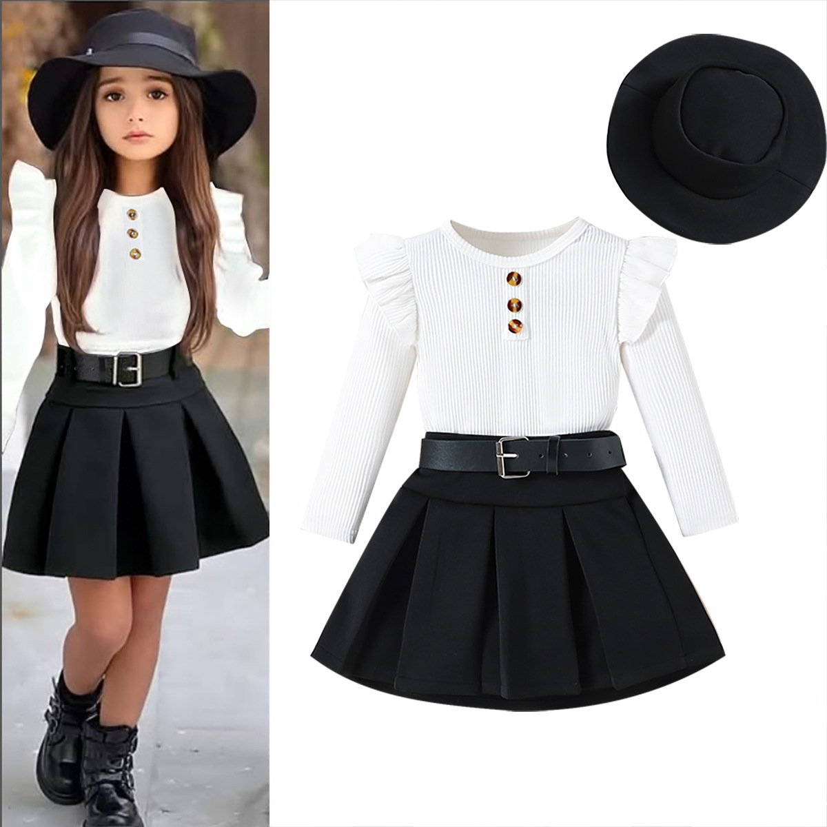 2025 유럽과 미국의 새로운 가을 스타일 소녀 솔리드 컬러 플라잉 슬리브 탑 + 벨트와 모자가있는 플리츠 스커트 4 피스 세트