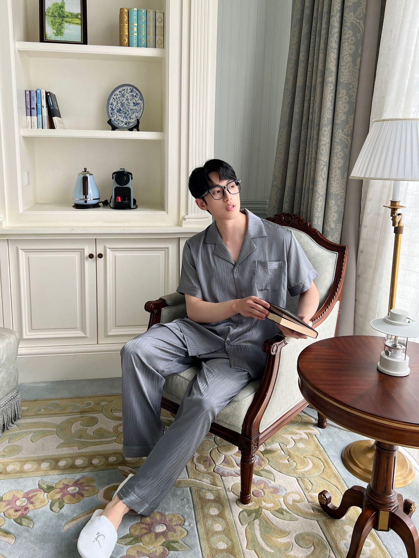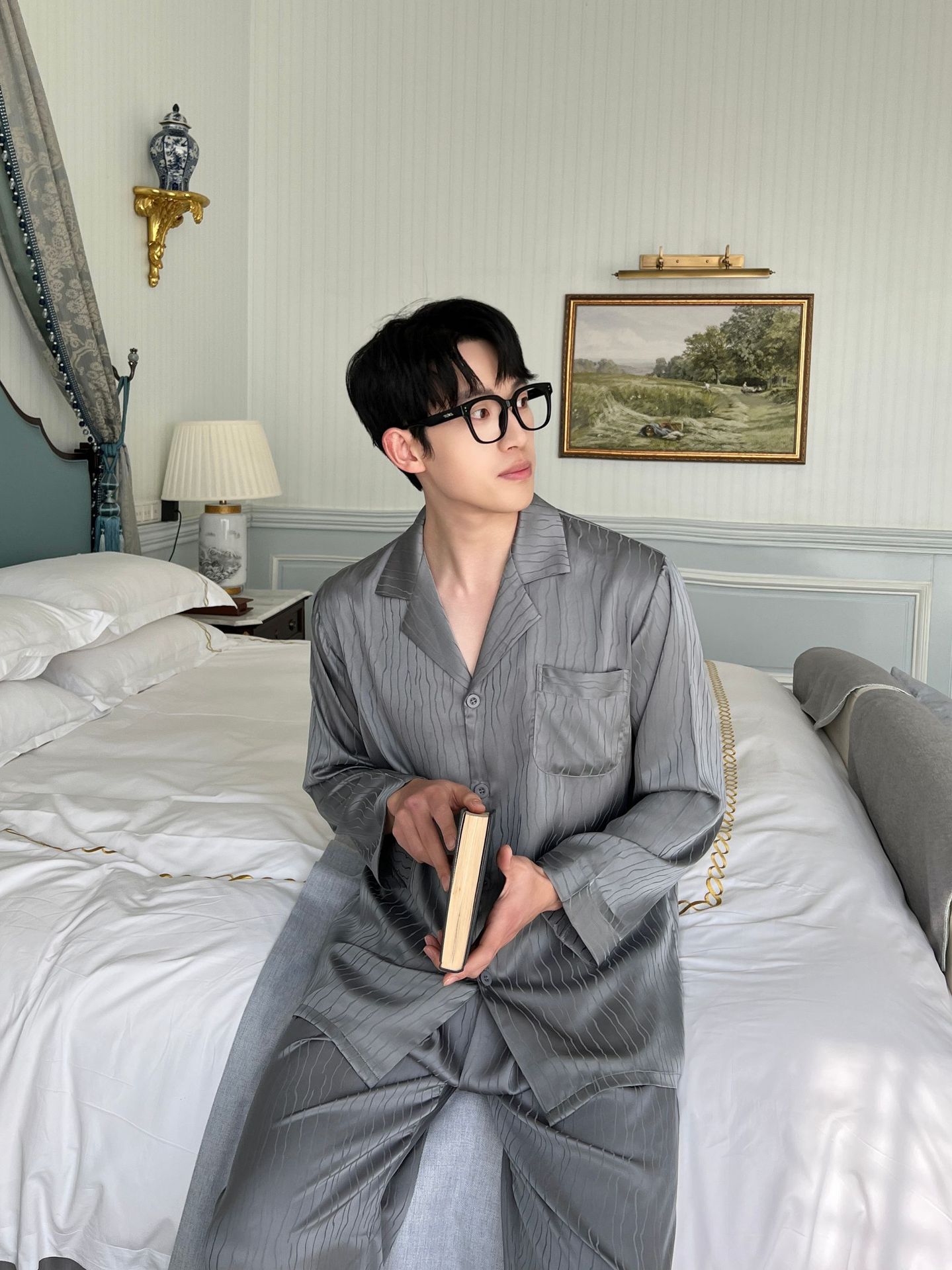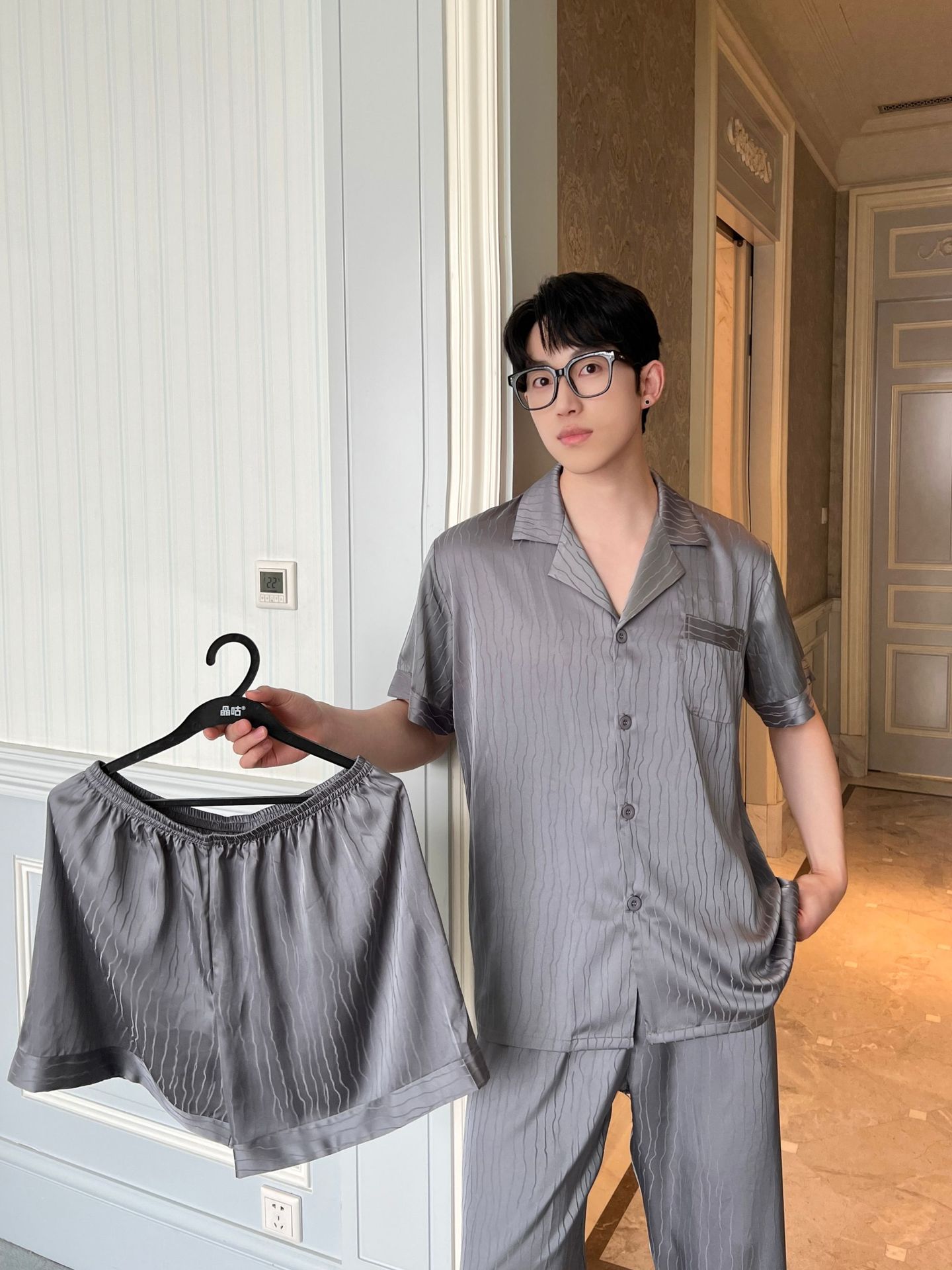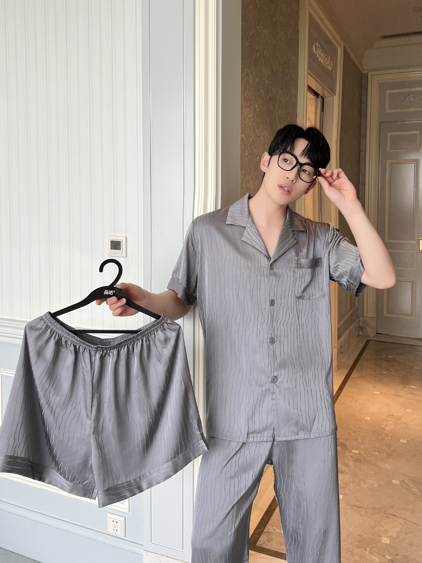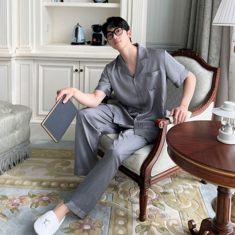 2025 새로운 자카드 잠옷 남자 여름 얼음 실크 반팔 가정 의류 여름 얇은 실크 카디건 3 피스 세트스토어 가기