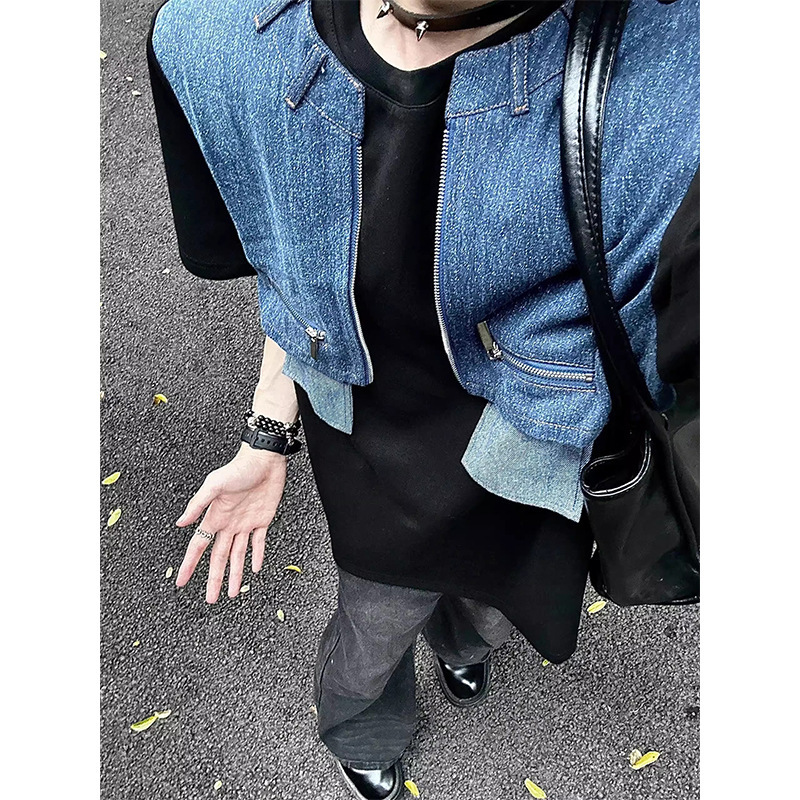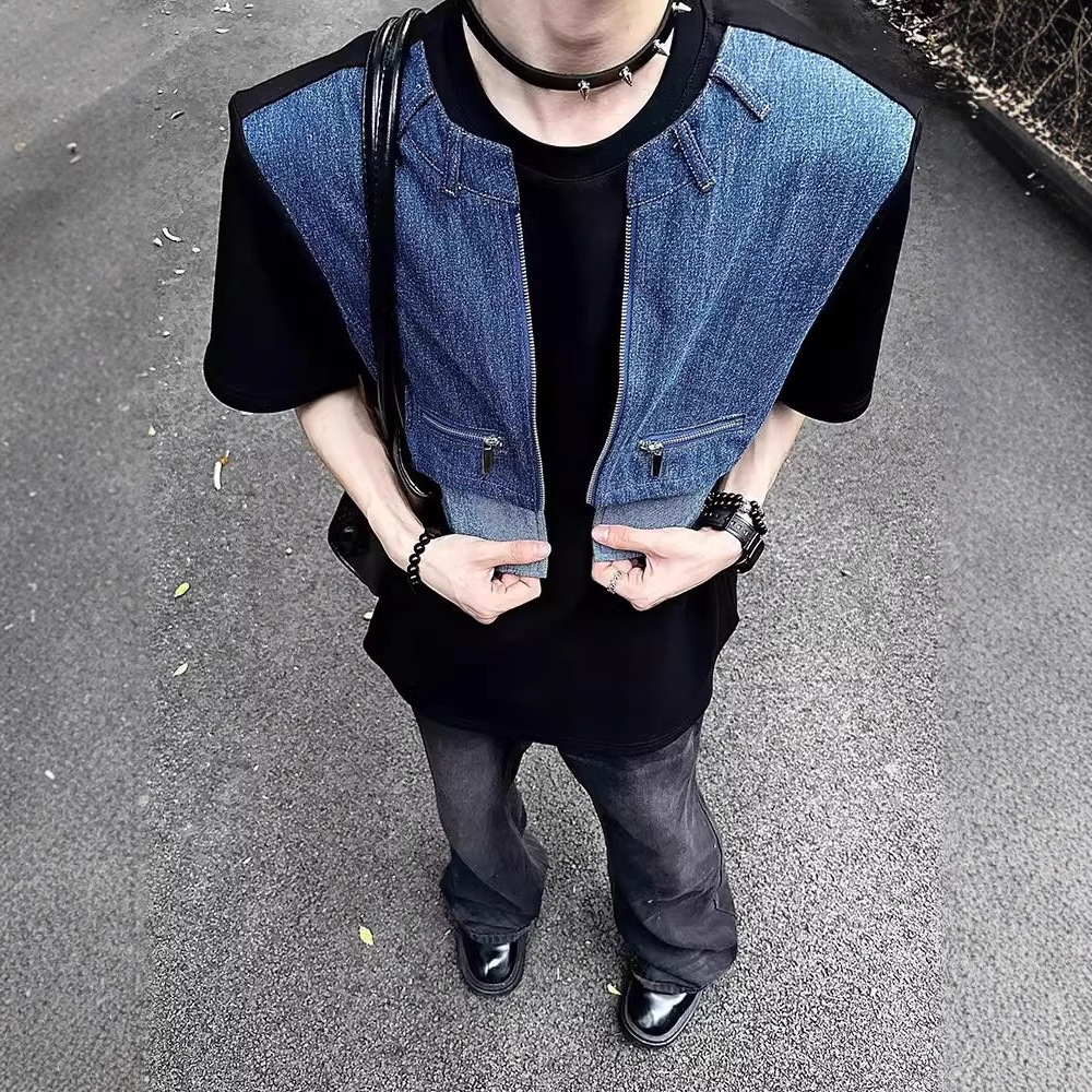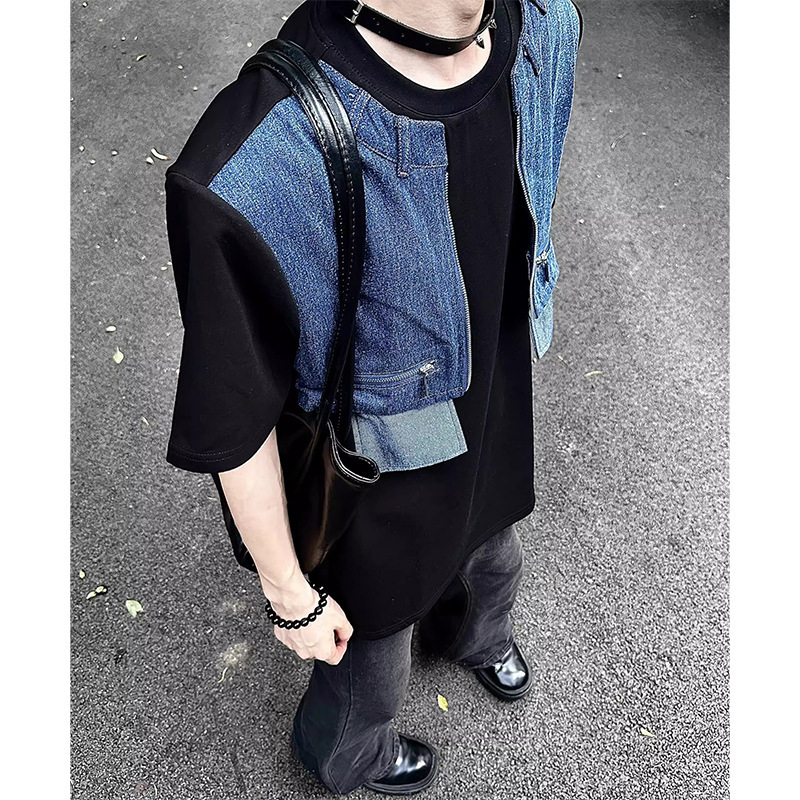 미국식 가짜 투피스 스티칭 데님 반소매 여름 유럽과 미국식 하이 엔드 웨어 숄더 티셔츠 무거운 반소매